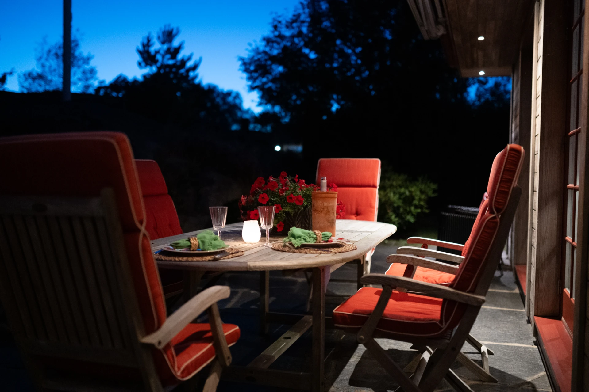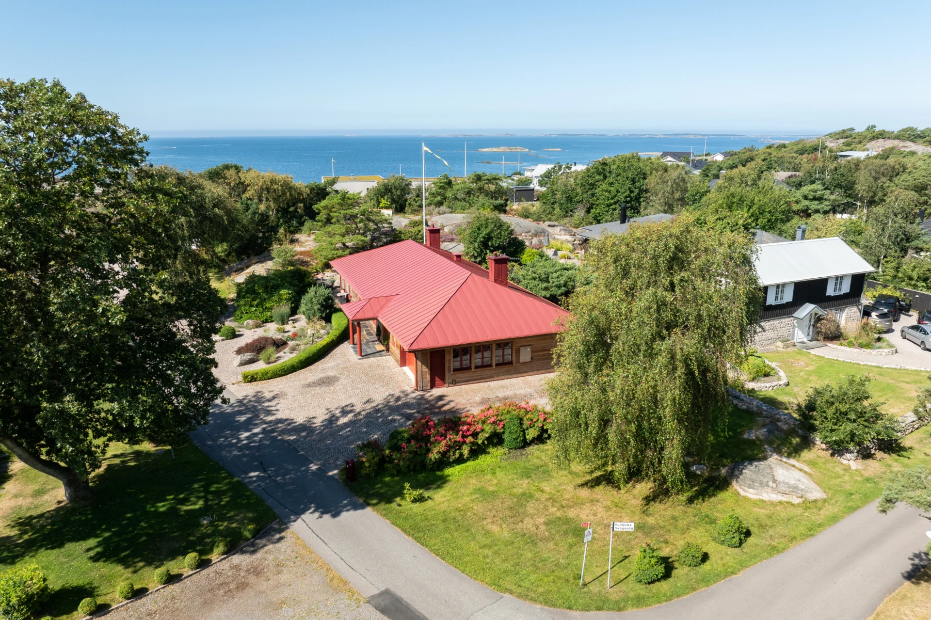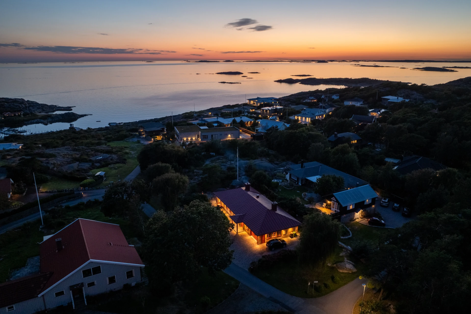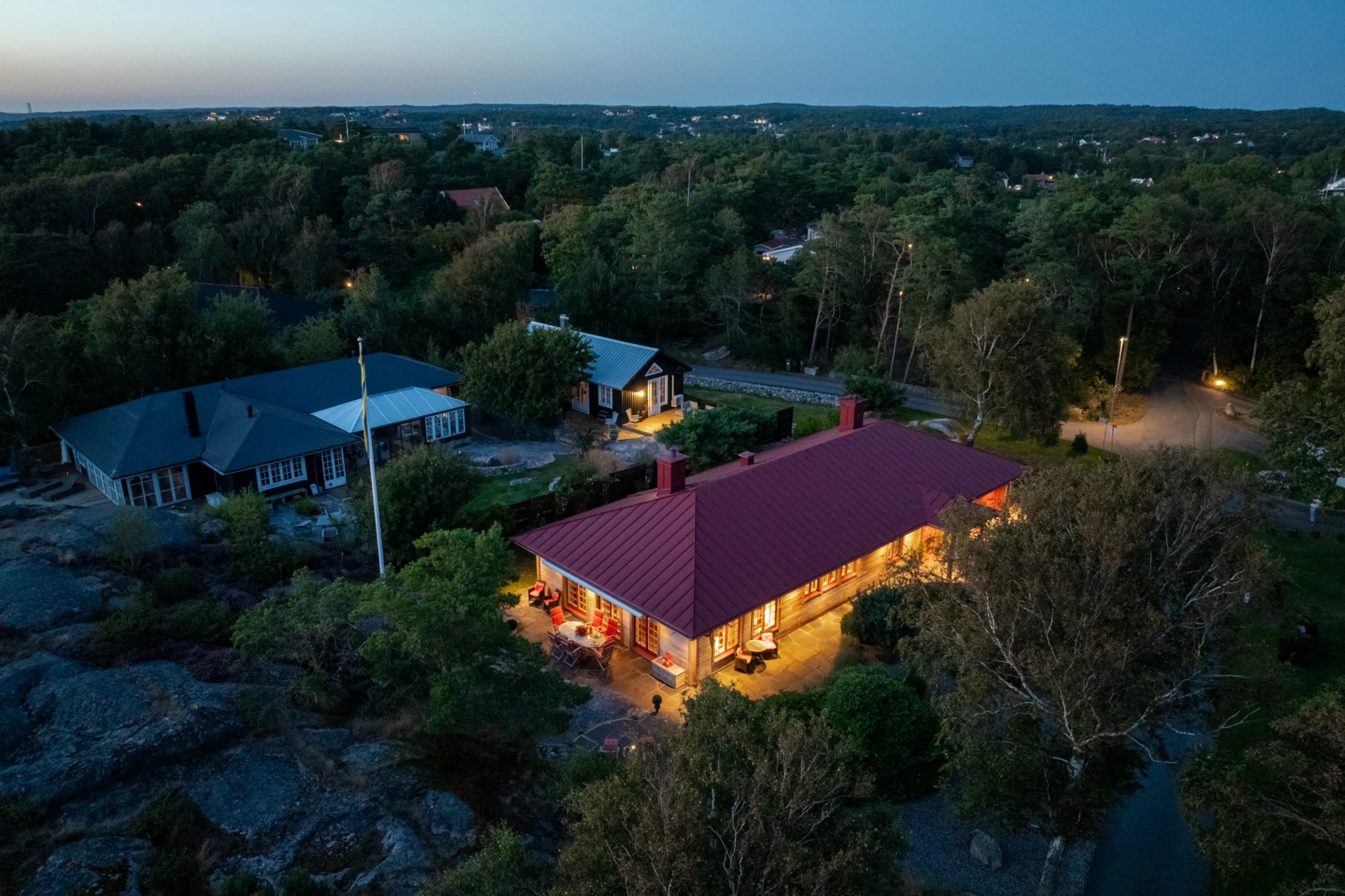 Massivt ekgolv möter målade väggar. Tre rejäla pardörrar leder vidare ut på terrassen. Rummets karaktär präglas av ljusinsläppet och den stora platsbyggda bokhyllan som sträcker sig hela fem meter. På den lite kulna tiden på året är det mysigt att krypa upp vid öppna spisen, känna värmen i lågornas sken.