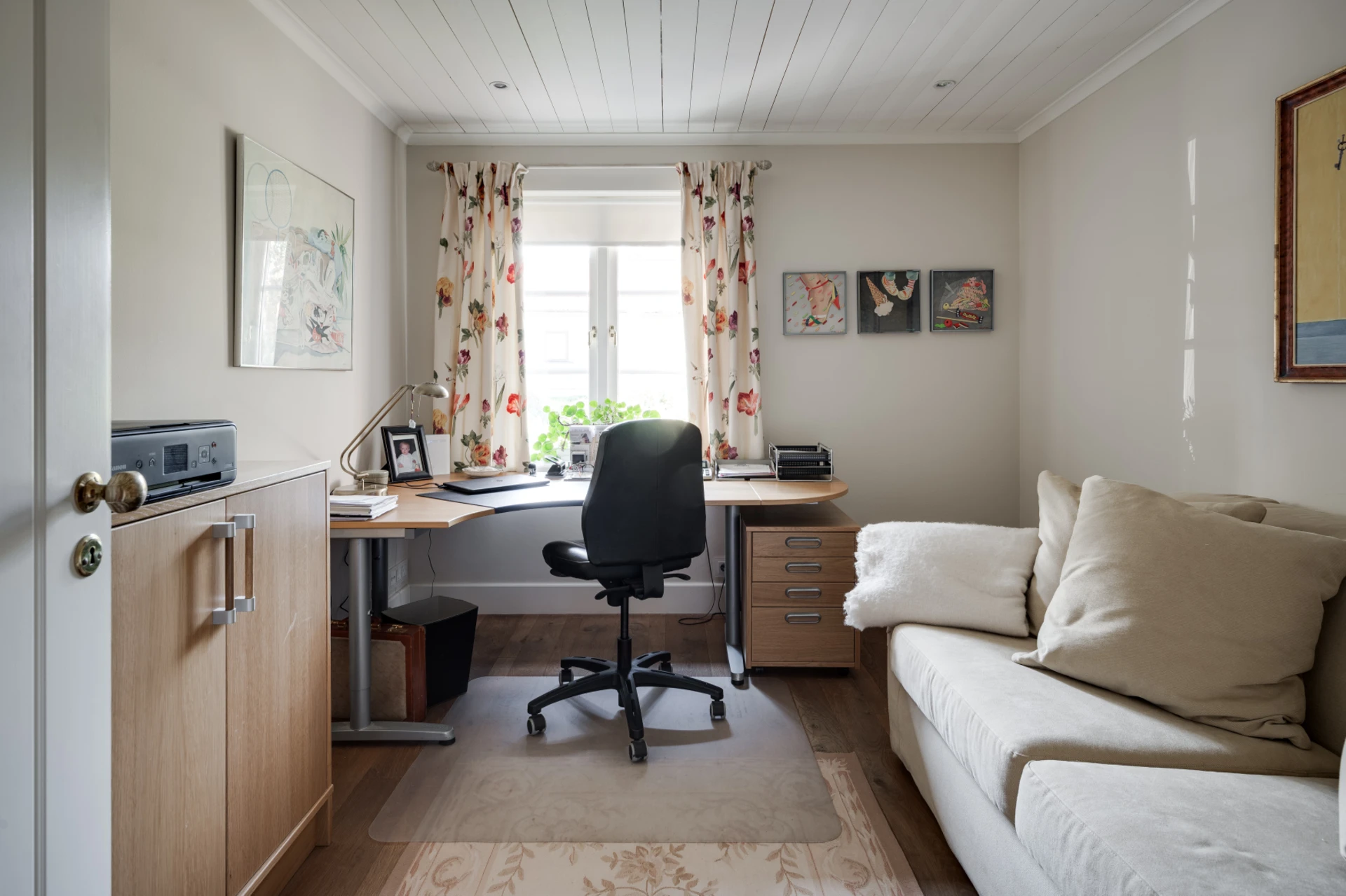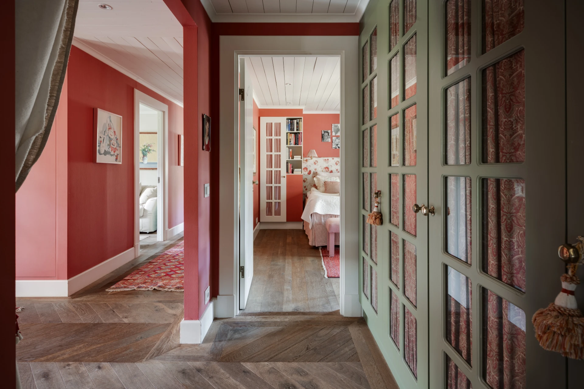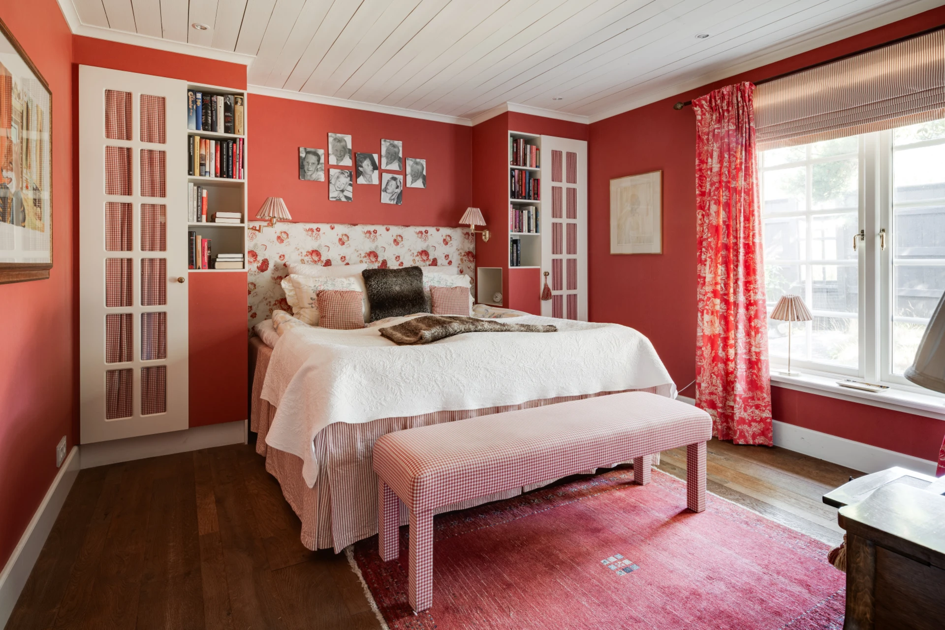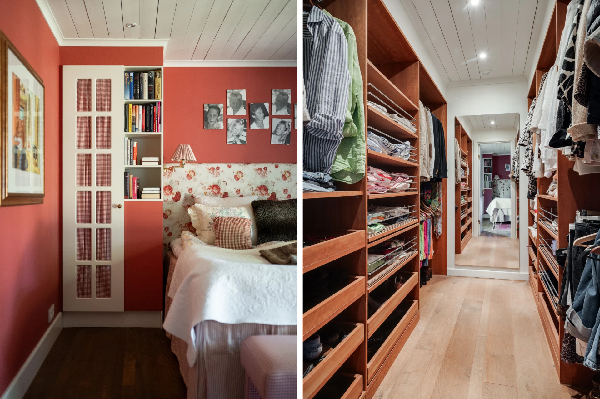 Det rymliga rummet har målade väggar och golv av massiv ek med golvvärme. En generös walk-in-closet erbjuder perfekt förvaring med hyllor i oljad körsbär.