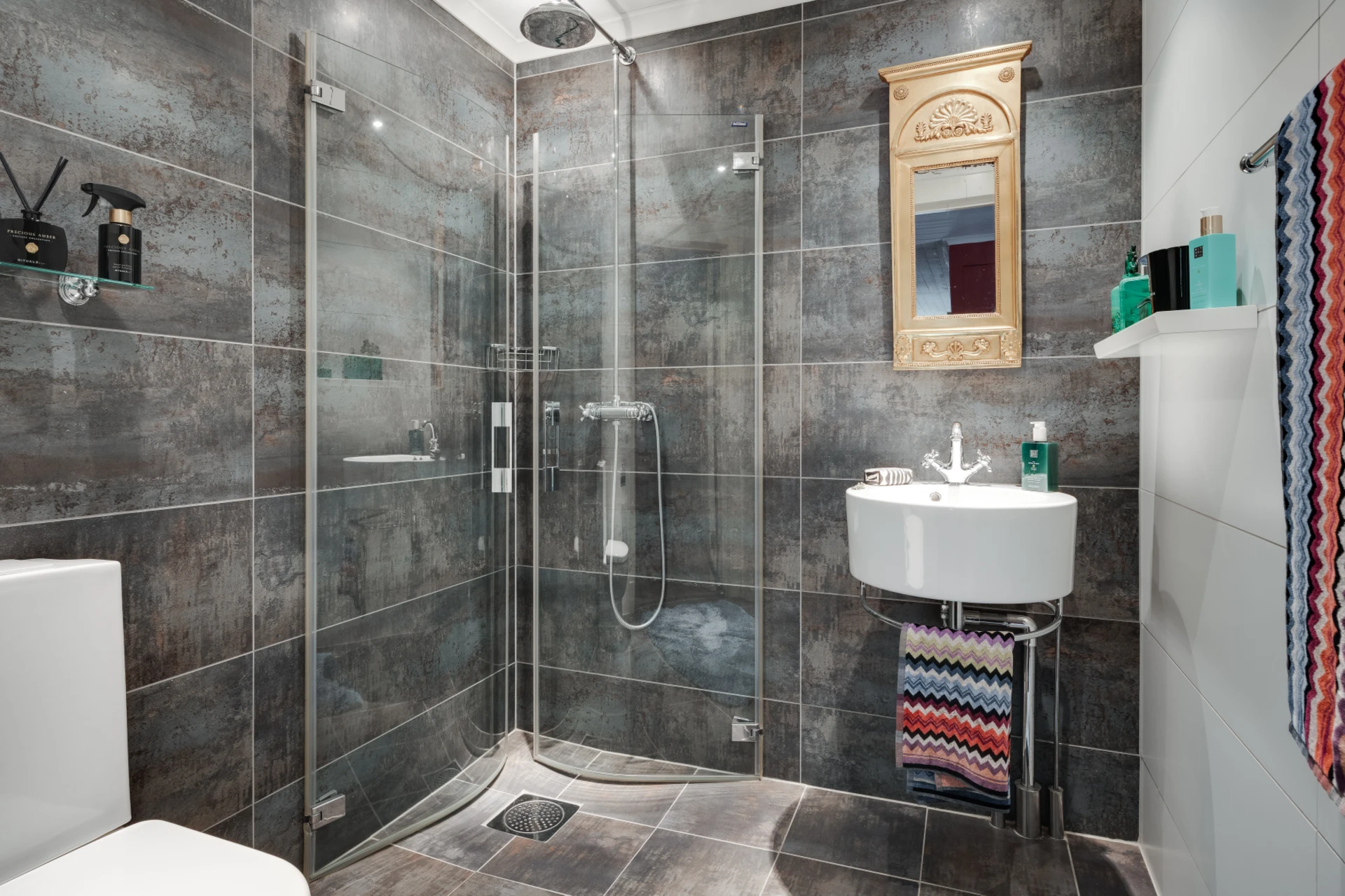 Väggarna är klädda med travertin i grått och vitt. På golvet ligger klinker med golvvärme. Utrustningen består av dusch, handfat och toalett.
