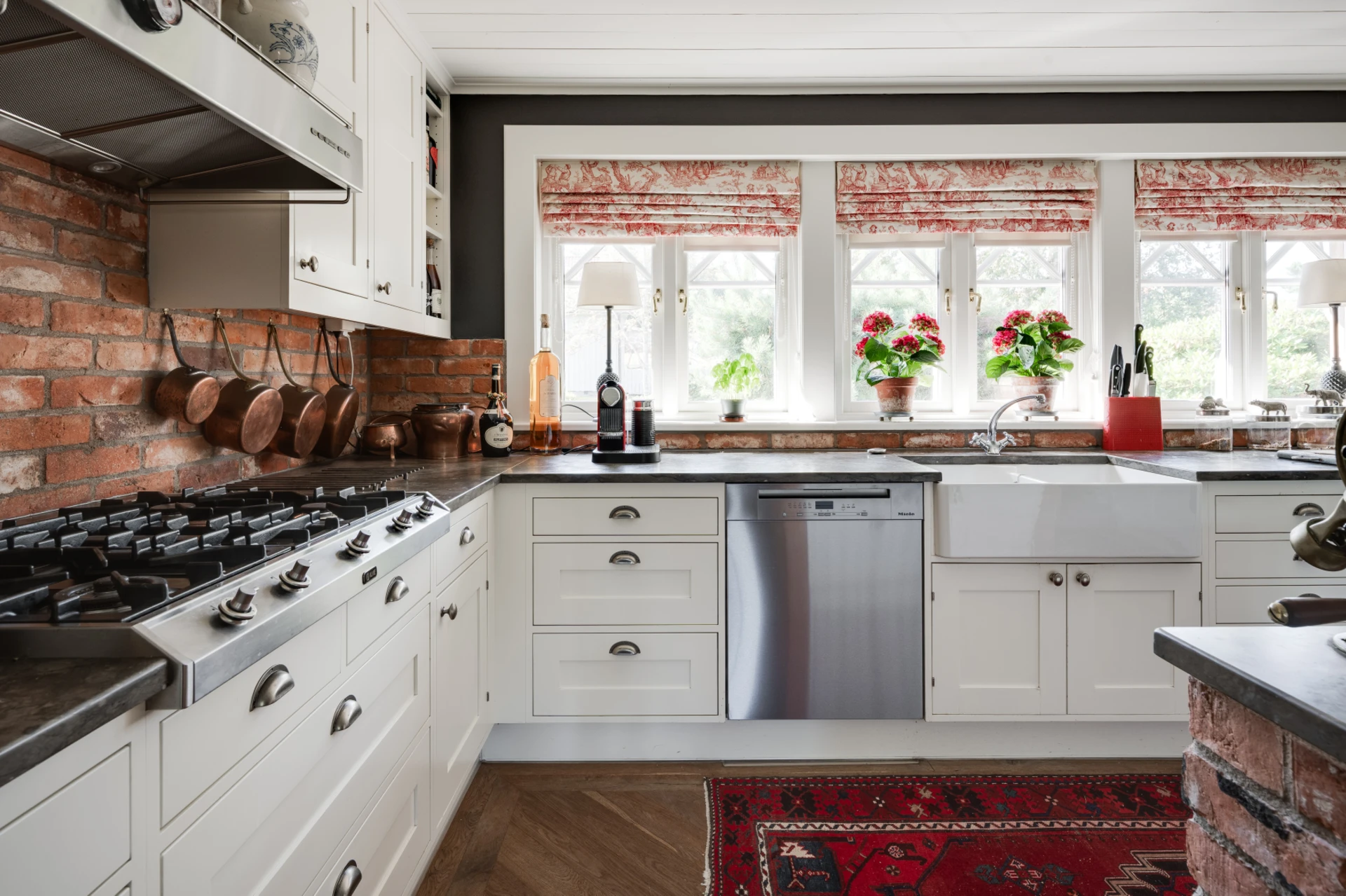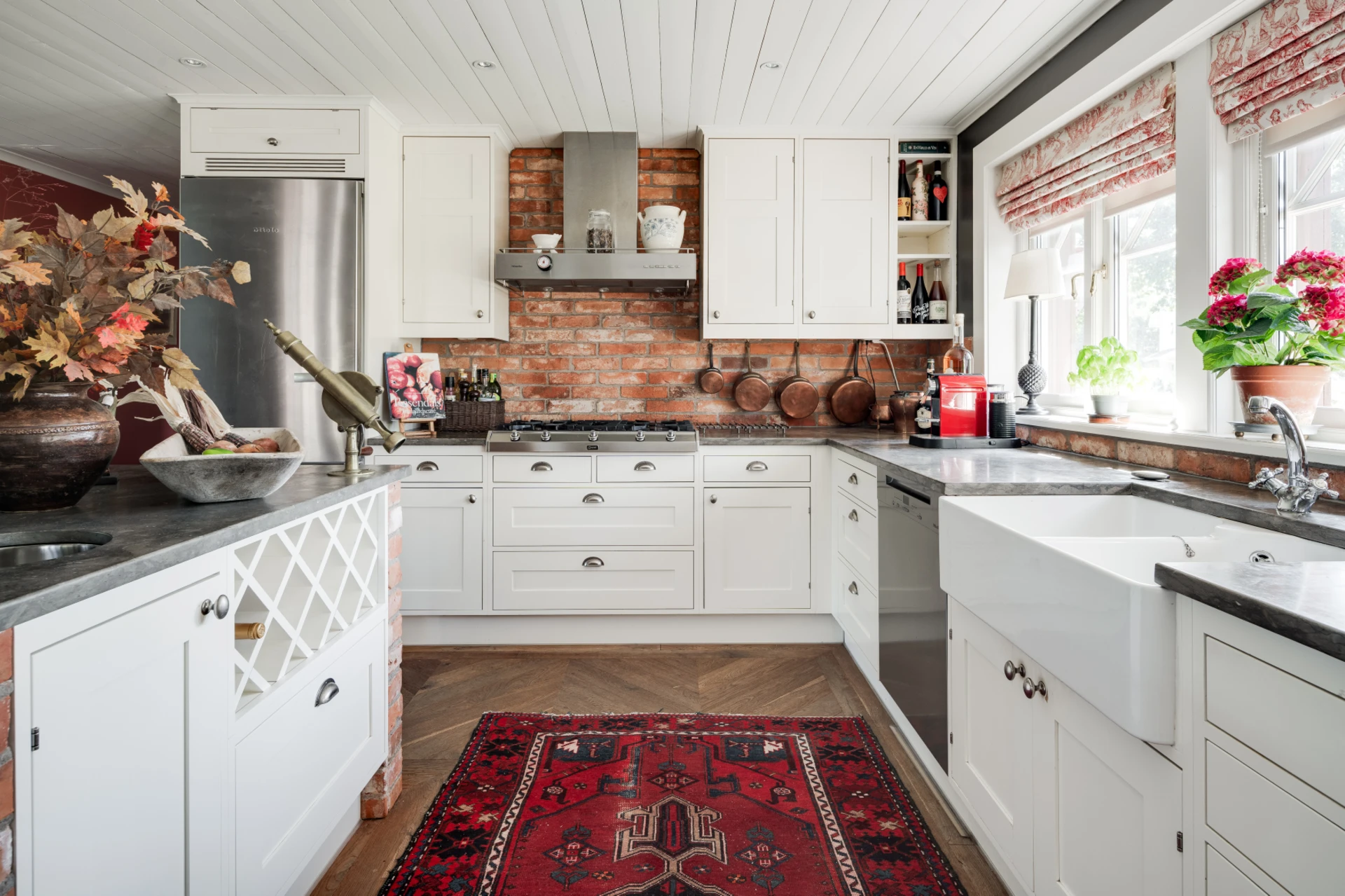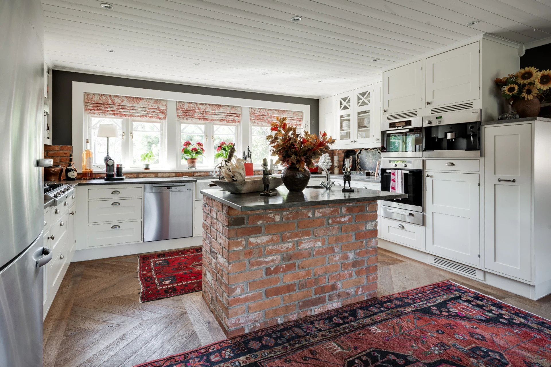Här ligger ett massivt ekgolv med golvvärme. Väggarna är till största delen klädda med rött tegel. Köksinredningen kommer från Lidhult i modellen Shaker. Bänkskivorna består av 30 mm mattpolerad kalksten. Med ett bänk- och skåpdjup på 680 mm får ni generösa arbetsytor samtidigt som förvaringen blir optimal. Köket är fullt utrustat med vardagslyx utöver det vanliga: gashäll från Ilve, Miele kommer kyl/frys, inbyggd ugn och mikro, kaffemaskin, porslinsvärmare samt diskmaskin. Från Siemens kommer vinkylen, medan vasken är från Villeroy & Boch. På köksön en utslagsvask. Här finns även ett skafferi som gör utrustningen helt komplett.