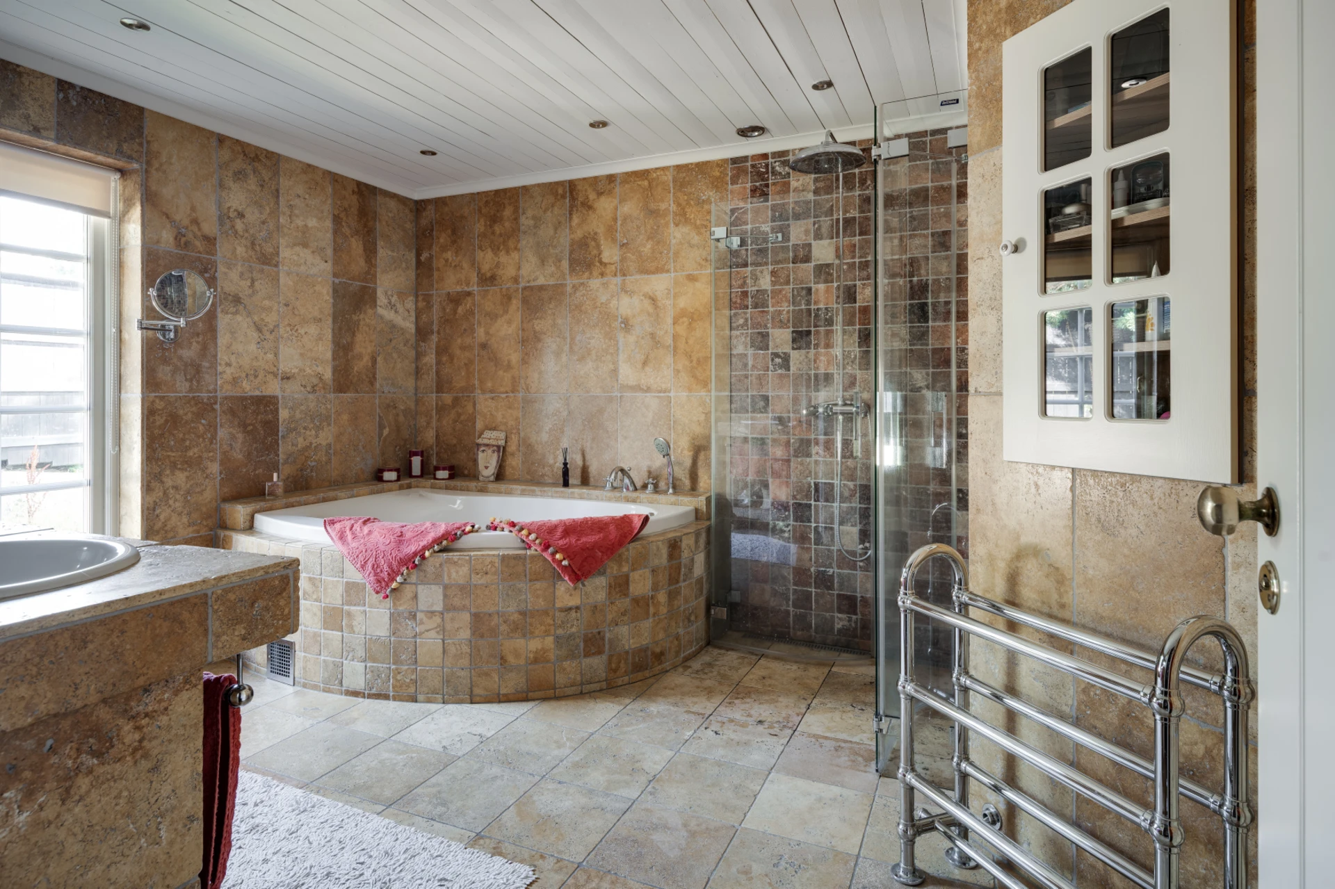 Väggarna är klädda med exklusiv travertin i nyanser av ockra och brunt. På golvet ligger klinker. Den påkostade utrustningen har det lilla extra såsom inbyggt badkar, rymlig duschhörna, dubbla handfat och en stor infälld spegel. Handdukstorken är golvmonterad och köpt genom Fired Earth.