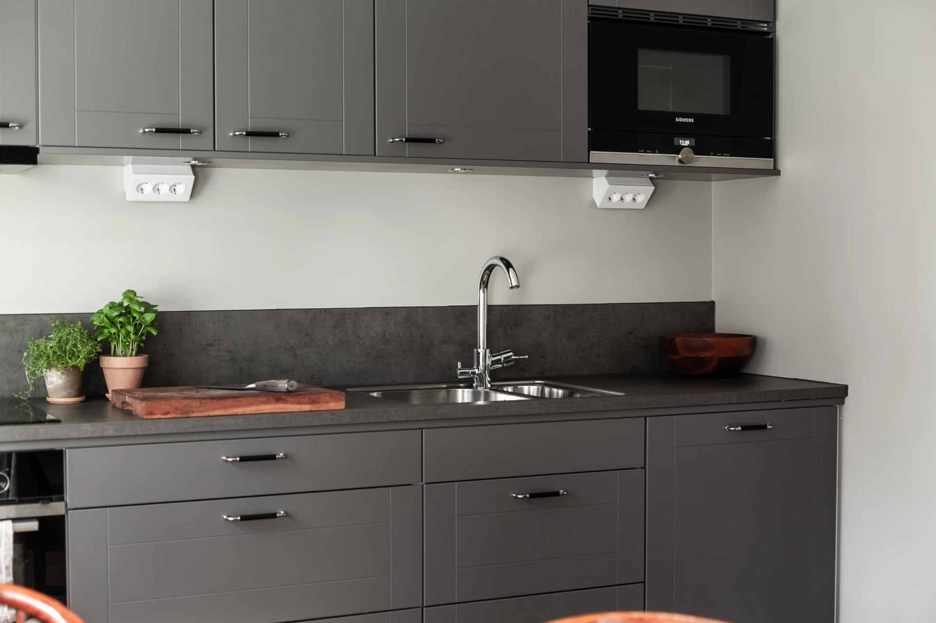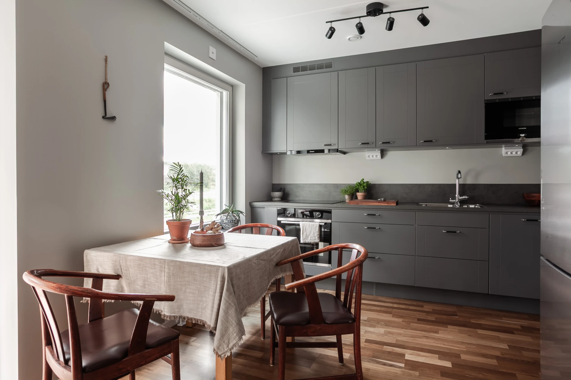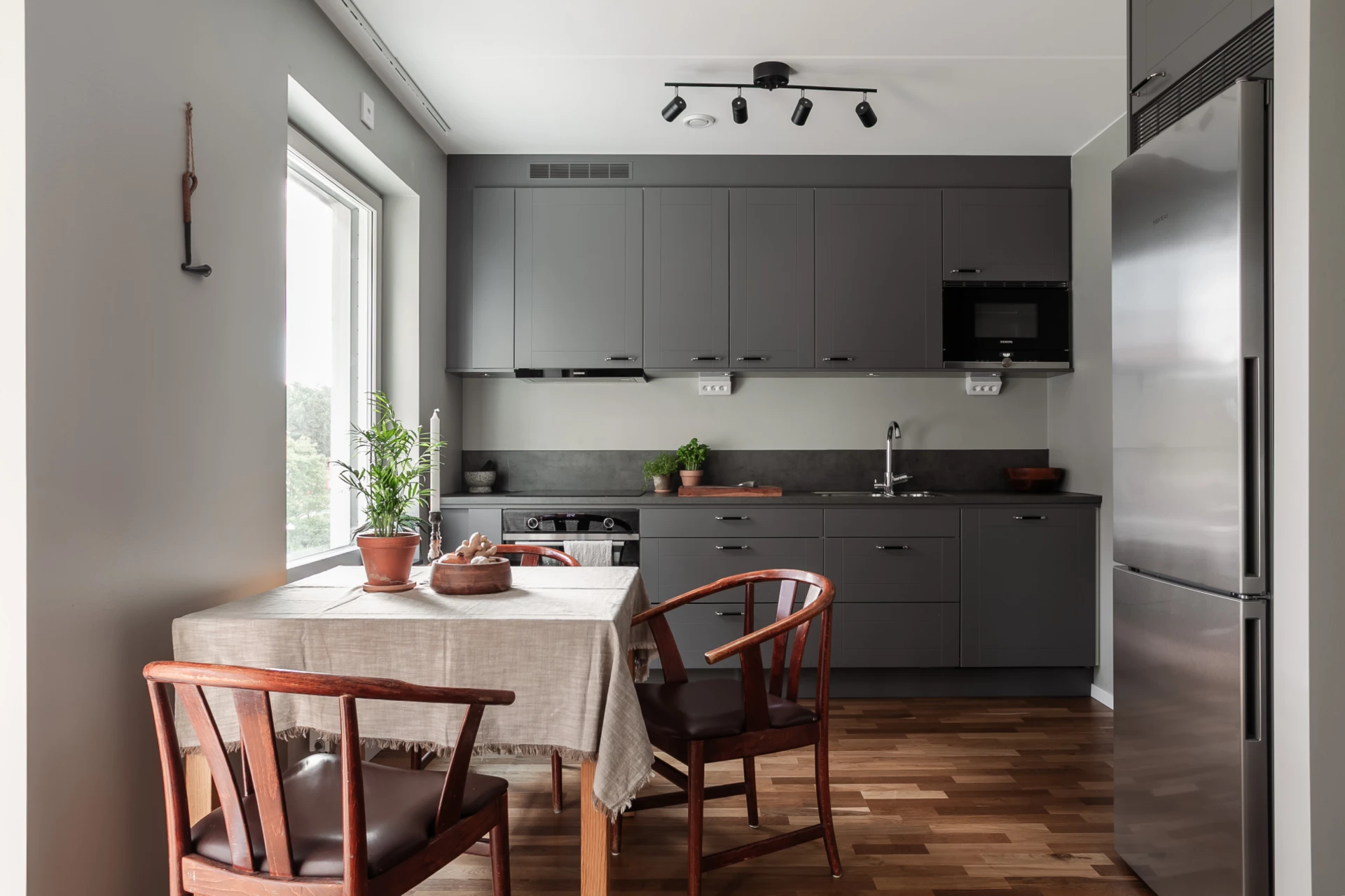Köket från HTH i stilrent grå ton är rymligt och erbjuder gott om förvaring och bänkyta. Bänkskiva i grått förlängs stilrent med samma material för stänkskydd. Den tekniska utrustningen består av inbyggd micro, ugn, spishäll med tillhörande fläkt, diskmaskin samt kombinerad kyl&frys.