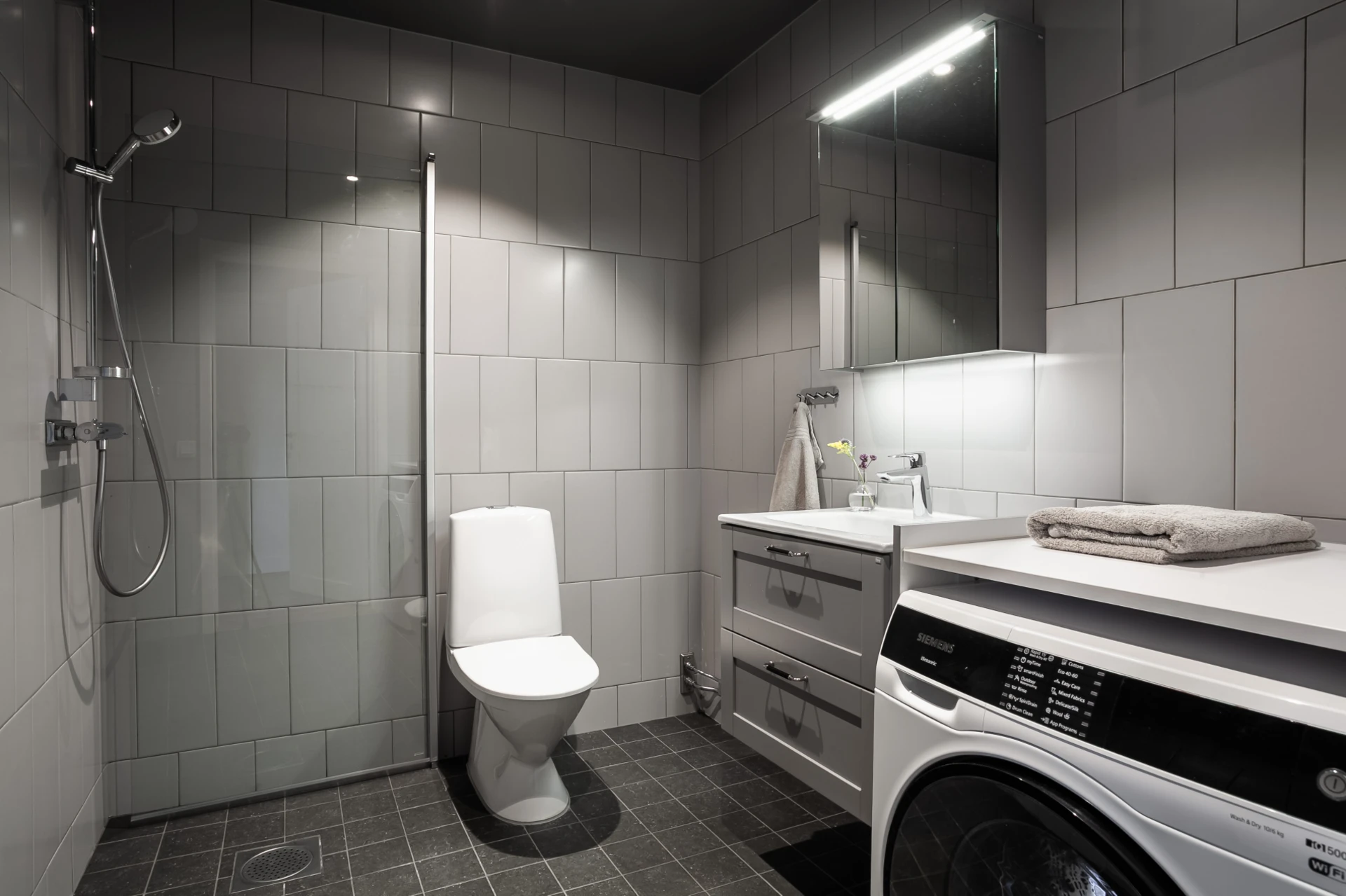 Det stora badrummet är fräscht och välutrustat med egen tvättutrustning allt för en bekväm vardag.