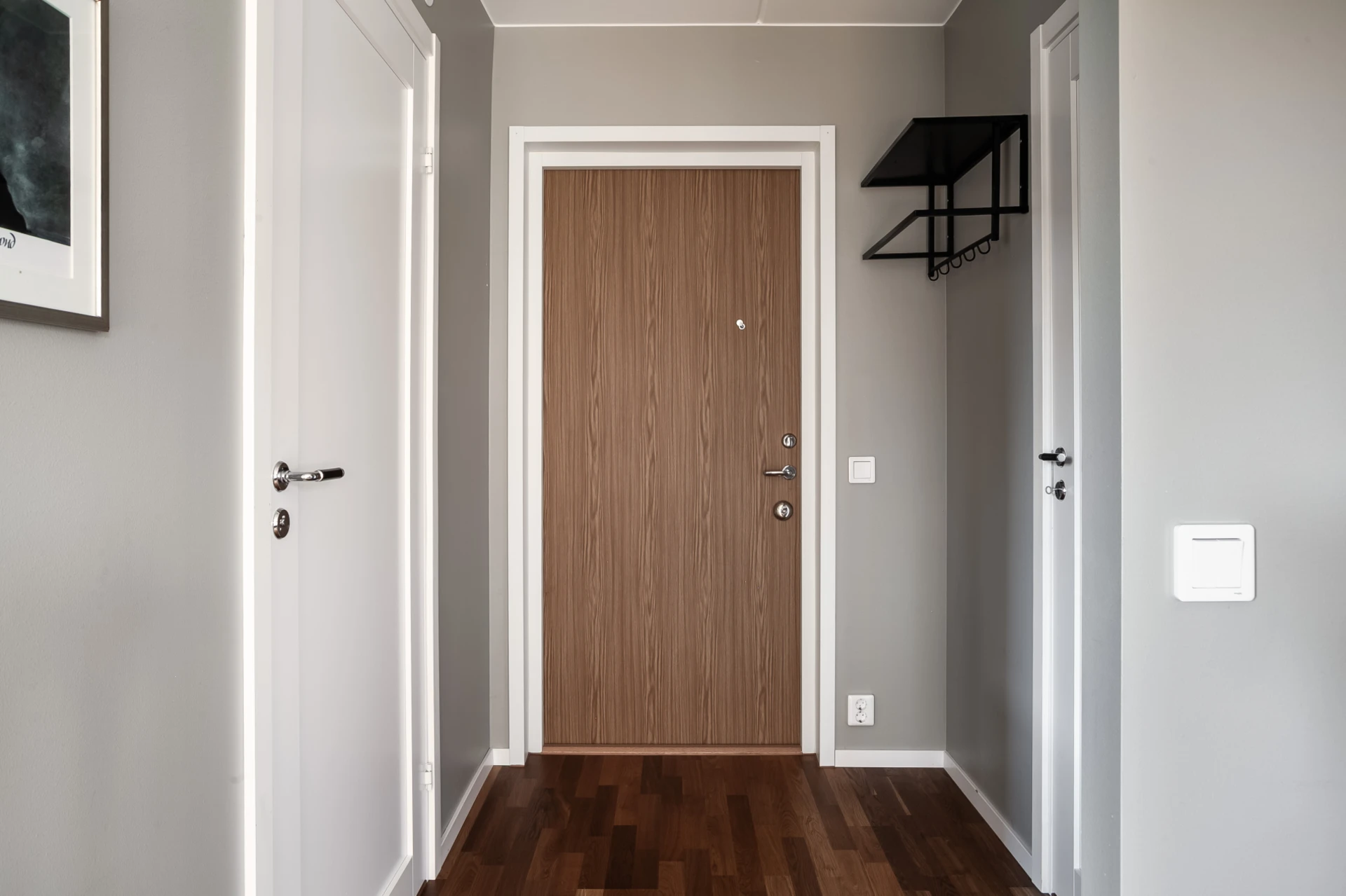 Varmt välkommen upp med hissen och kliv in i en välkomnande och rymlig hall med plats för avhägning och förvaring i klädkammare. Golvet pryds av stilig parkett, väggarna är målade i ljus kulör vilket är genomgående för hela bostaden.
