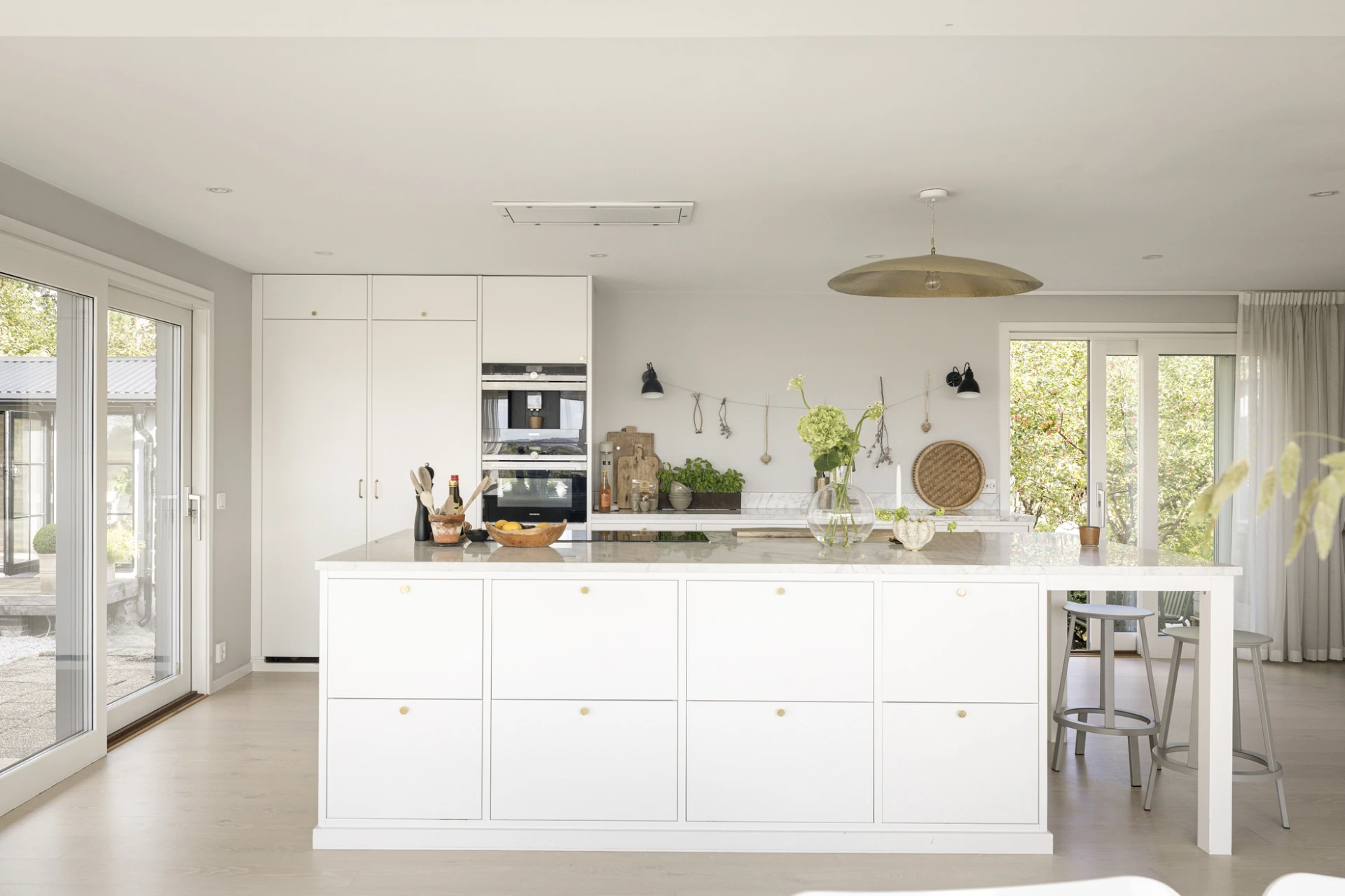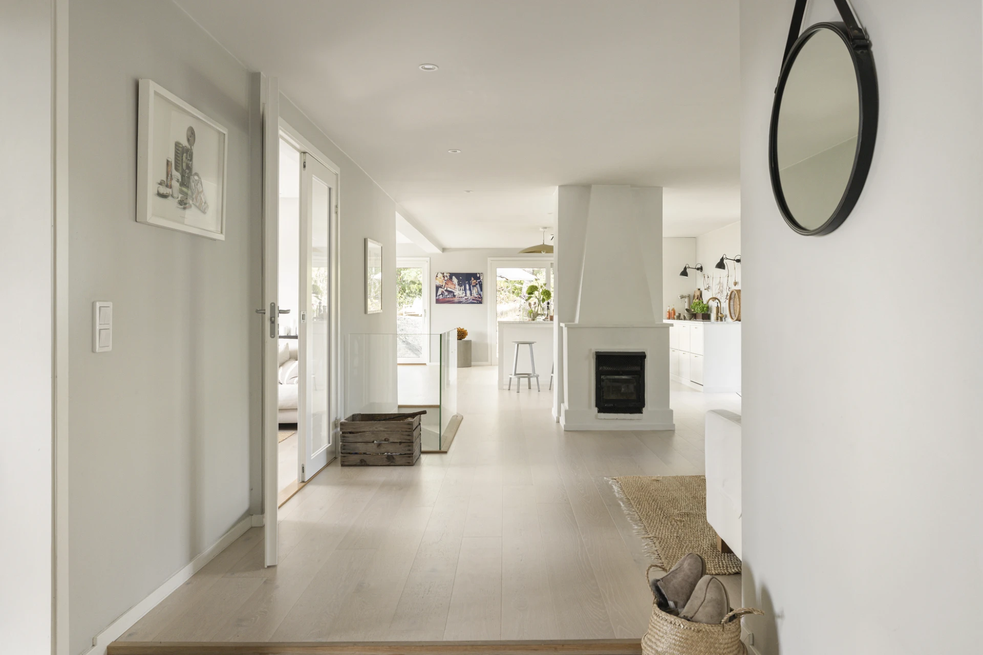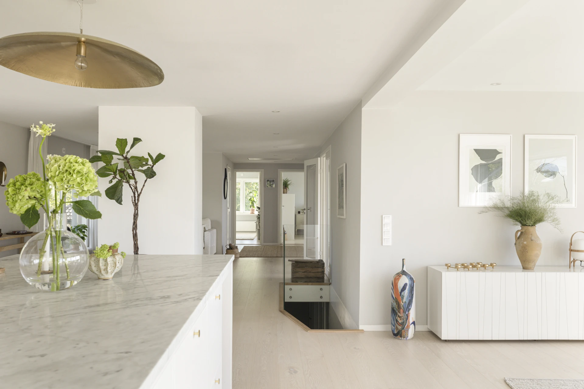 Huset är smakfullt renoverat med exklusiva materialval som Carraramarmor i kök och badrum, öppna ytor och stora fönsterpartier som släpper in ljuset från alla håll. Köket är både hemtrevligt och praktiskt, perfekt för både vardag och middagsbjudningar.