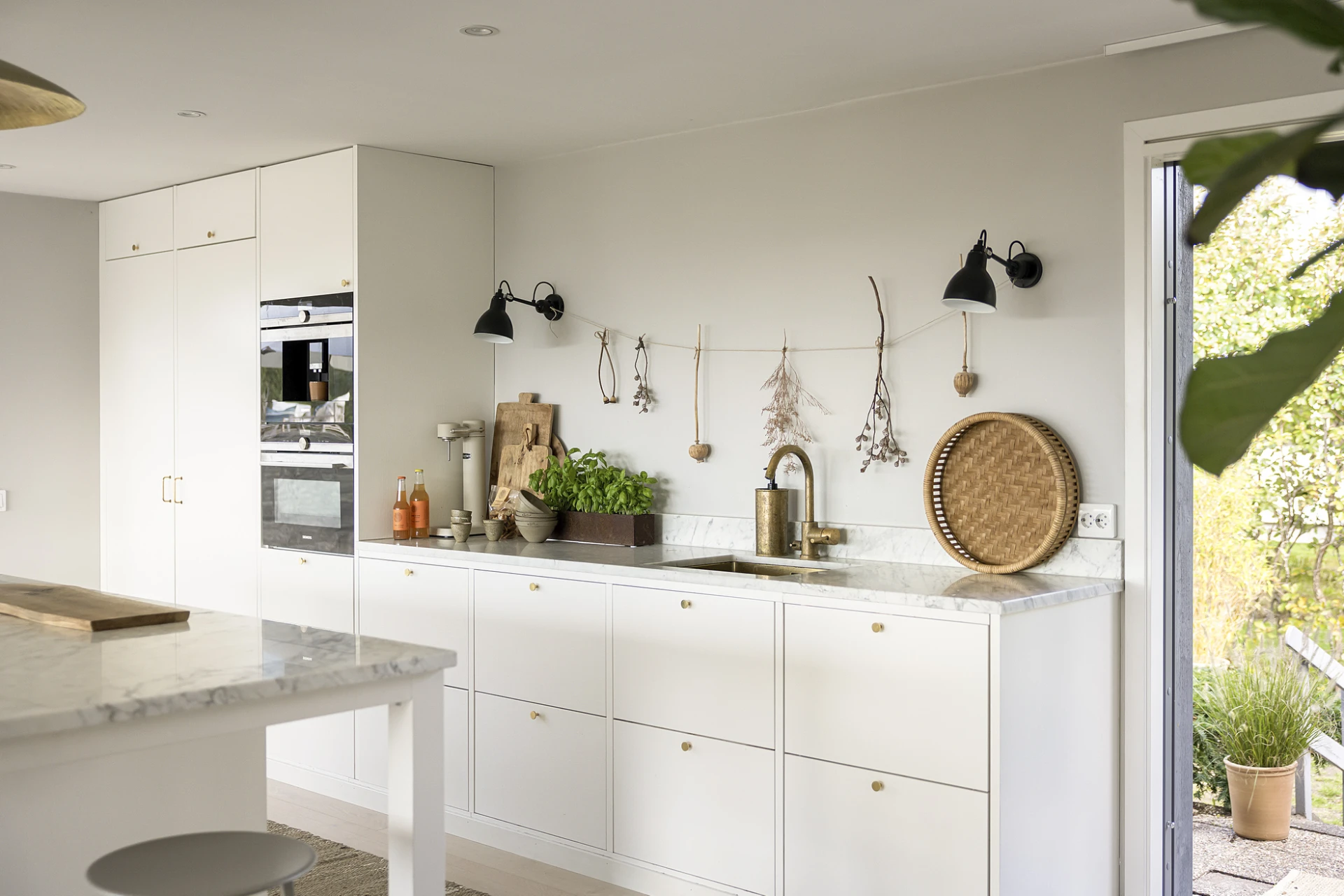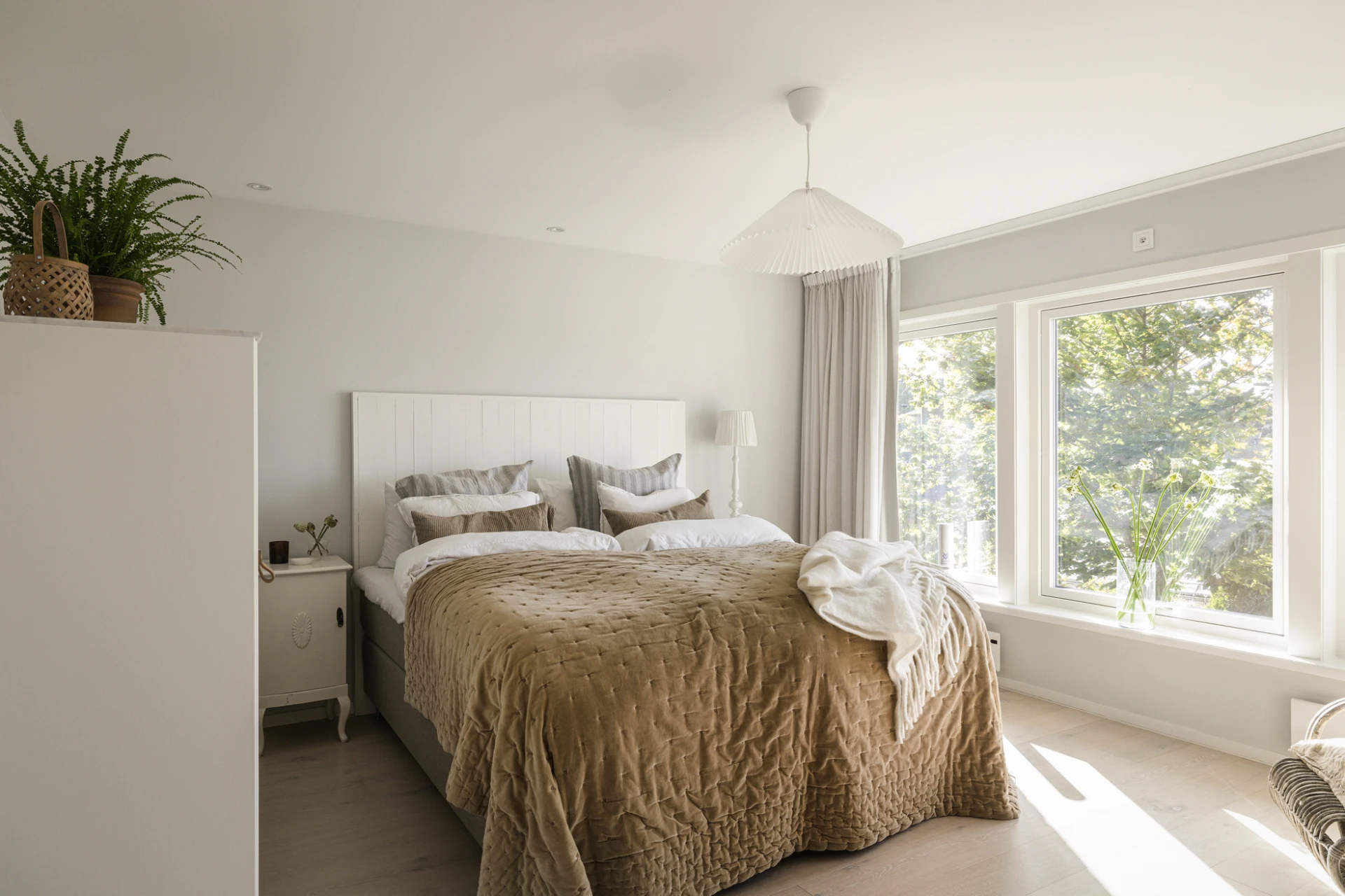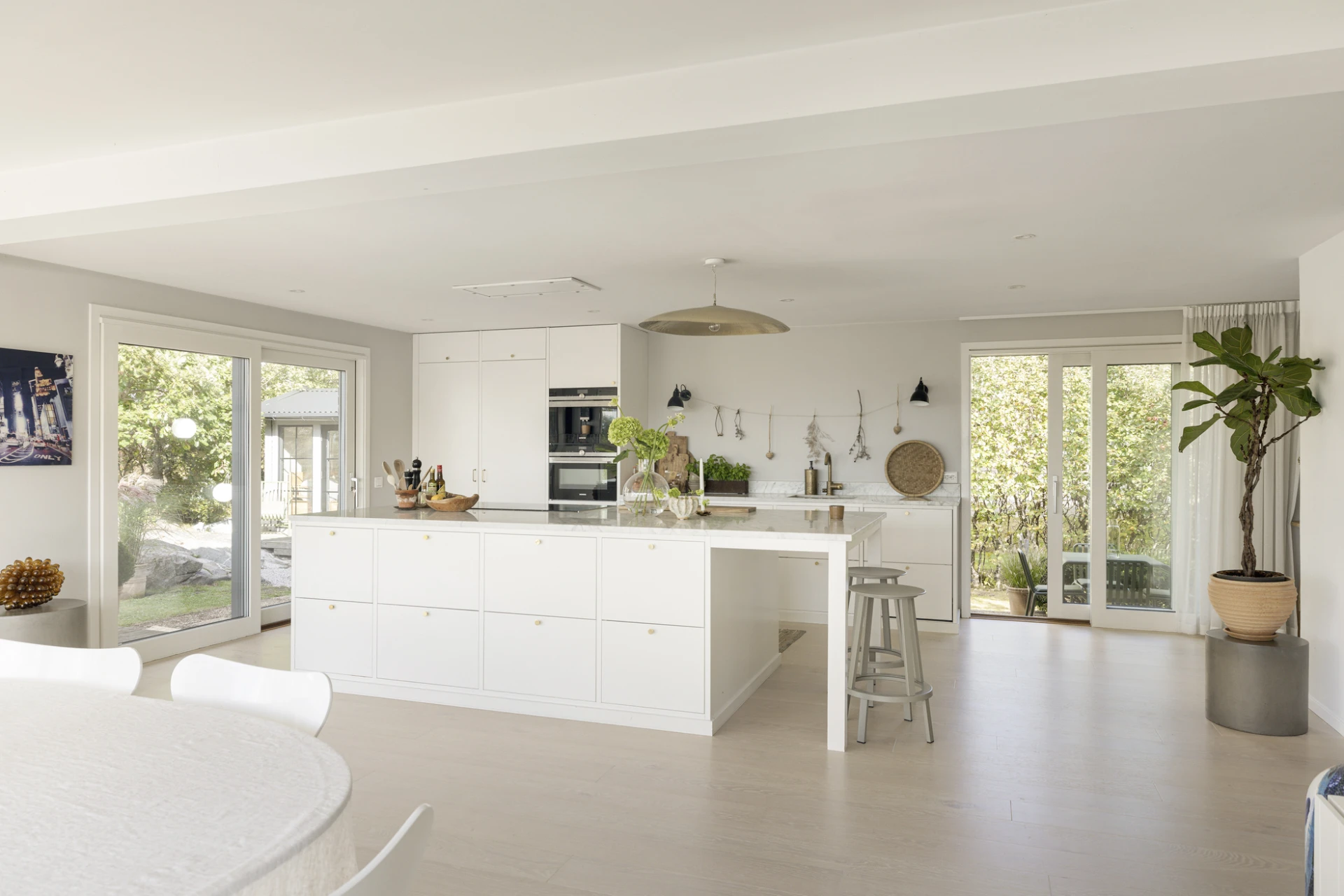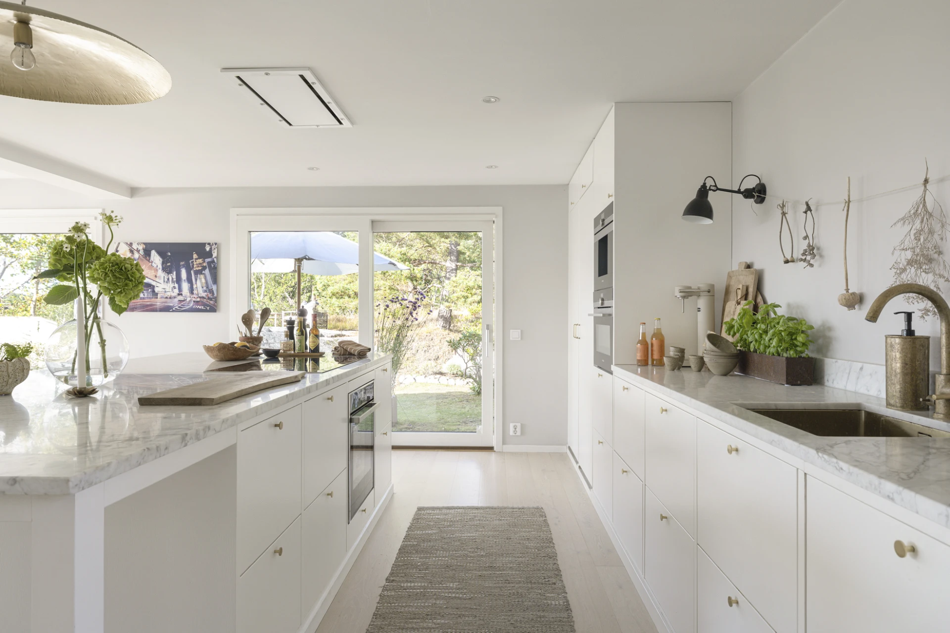 Huset är smakfullt renoverat med exklusiva materialval som Carraramarmor i kök och badrum, öppna ytor och stora fönsterpartier som släpper in ljuset från alla håll. Köket är både hemtrevligt och praktiskt, perfekt för både vardag och middagsbjudningar.