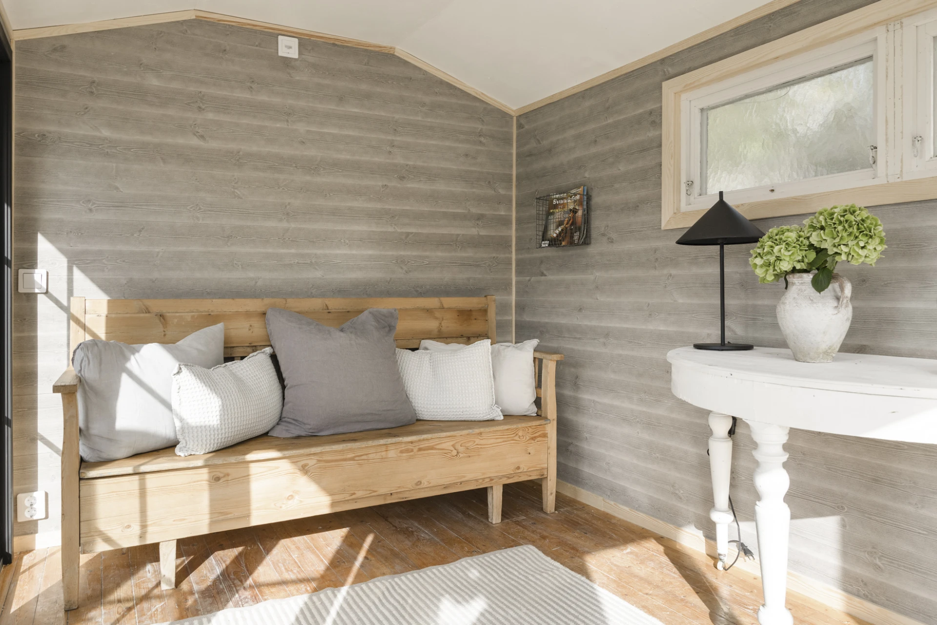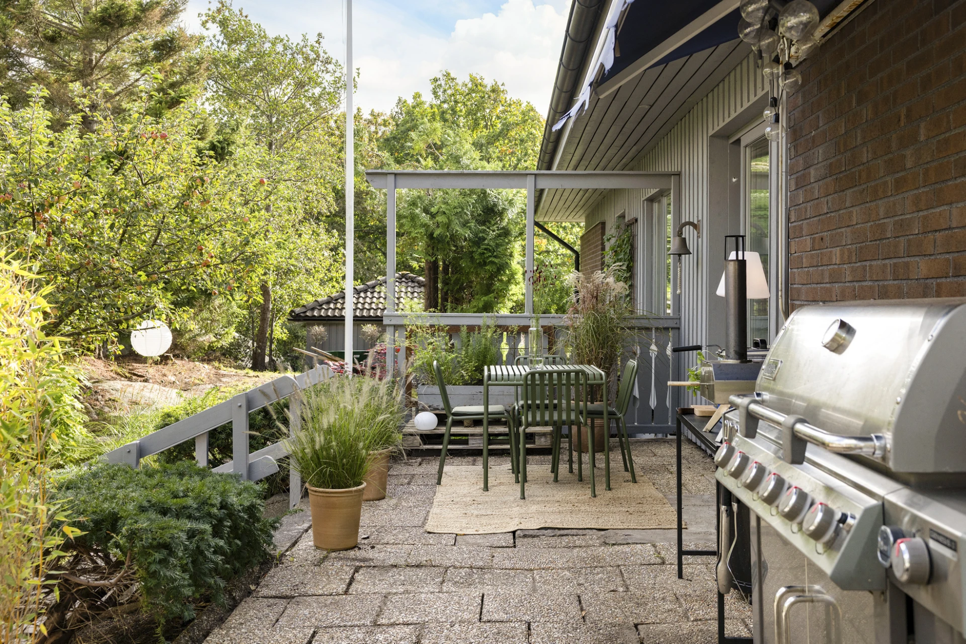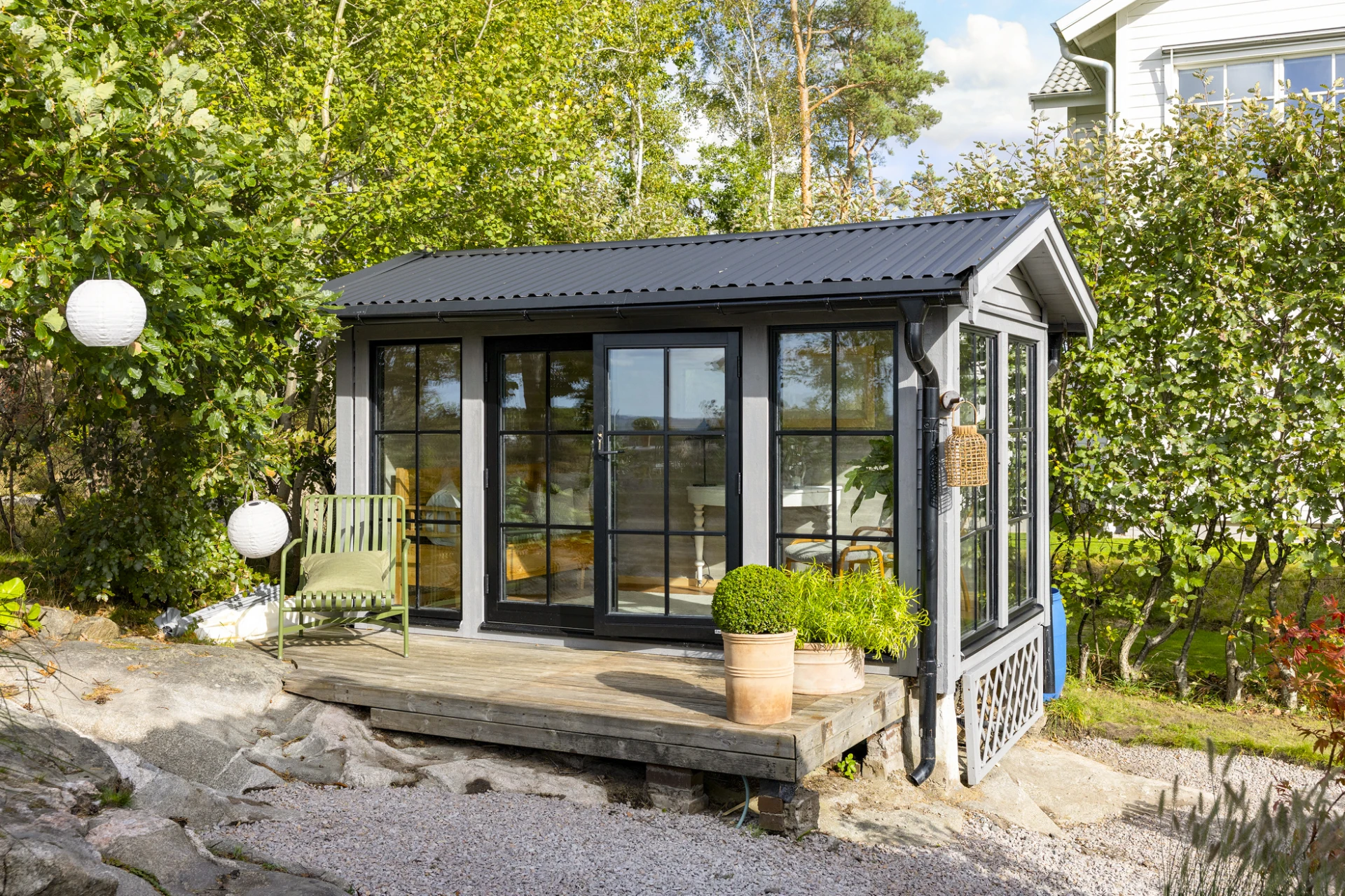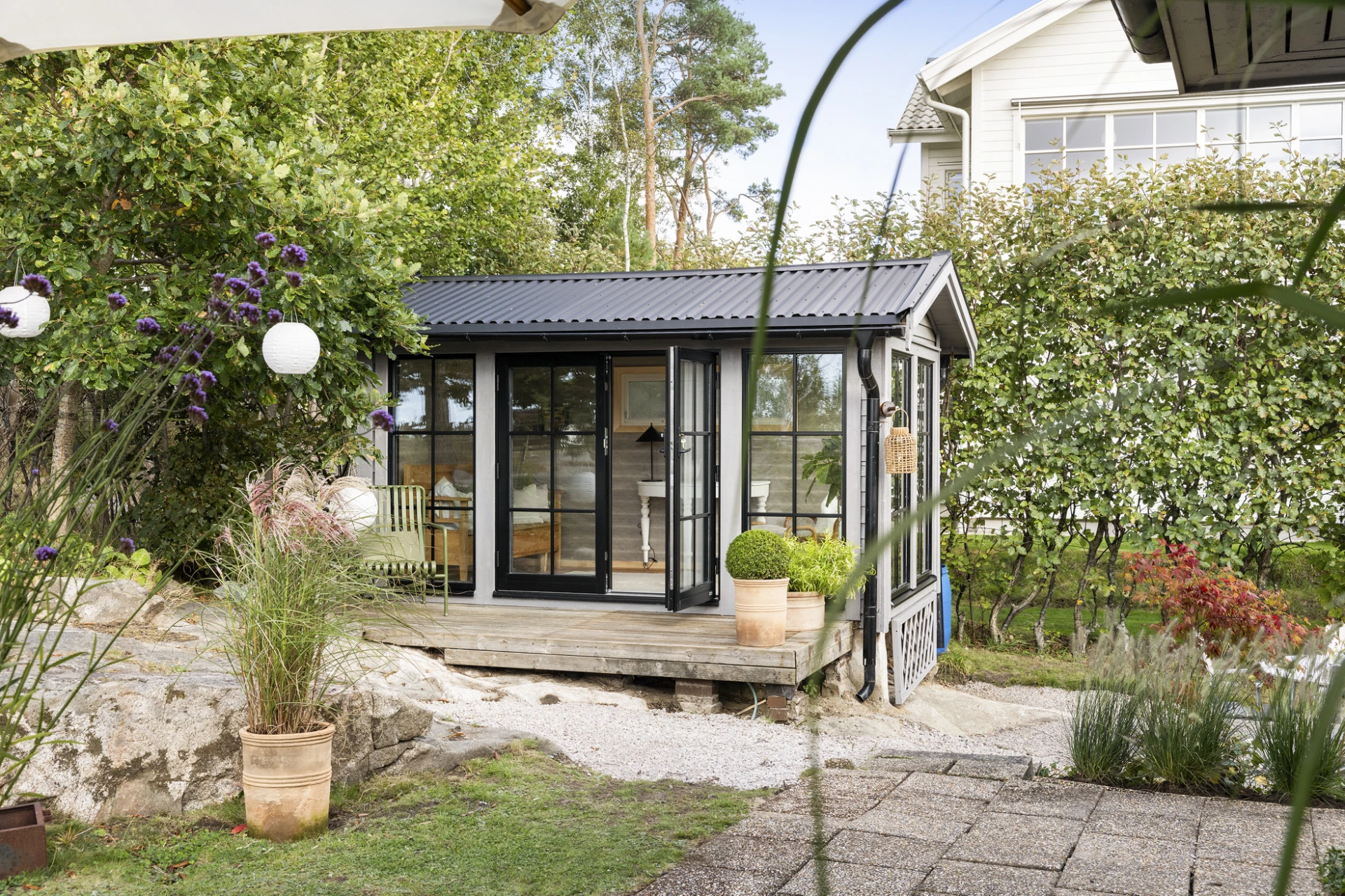 Den generösa tomten om 1100 kvm bjuder på grönska, fruktträd och flera uteplatser för både umgänge och avkoppling. Här finns plats för odling, lek och framtida pool. Uthuset med el, dubbeldörrar och altan kan bli gästhus, ateljé eller hemmakontor – alltid med naturen och havet som kuliss. Ett rymligt garage med plats för både bil och förvaring kompletterar fastigheten.