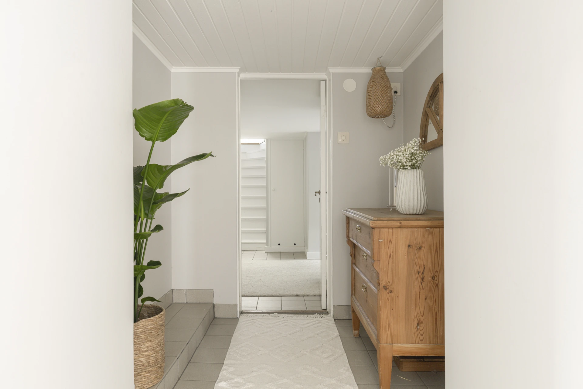 Marmorgolv samt parkettgolv och målade väggar i ljusgrå kulör. Här finns plats för avhängning och förvaring i garderober. I taket sitter spotlights.