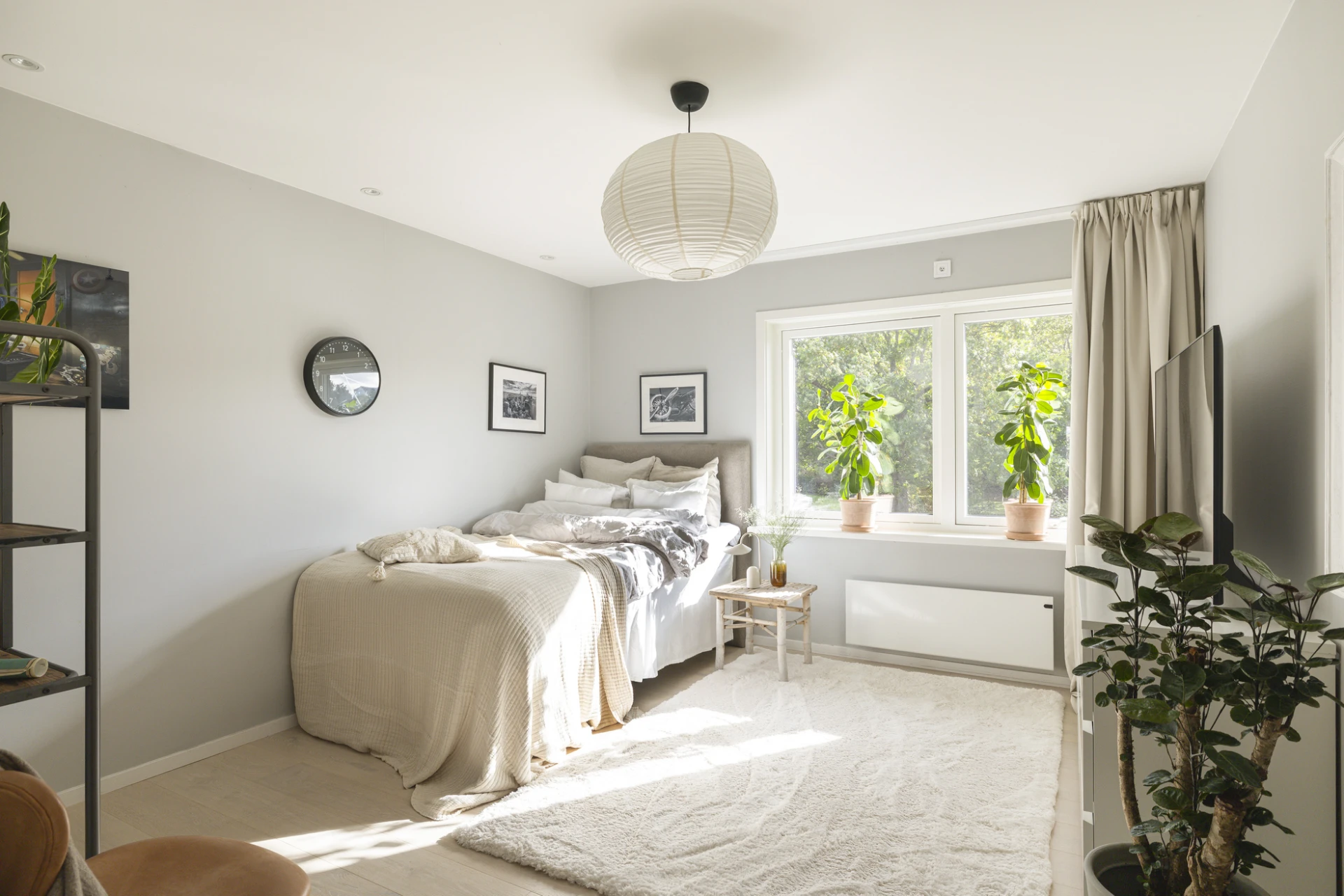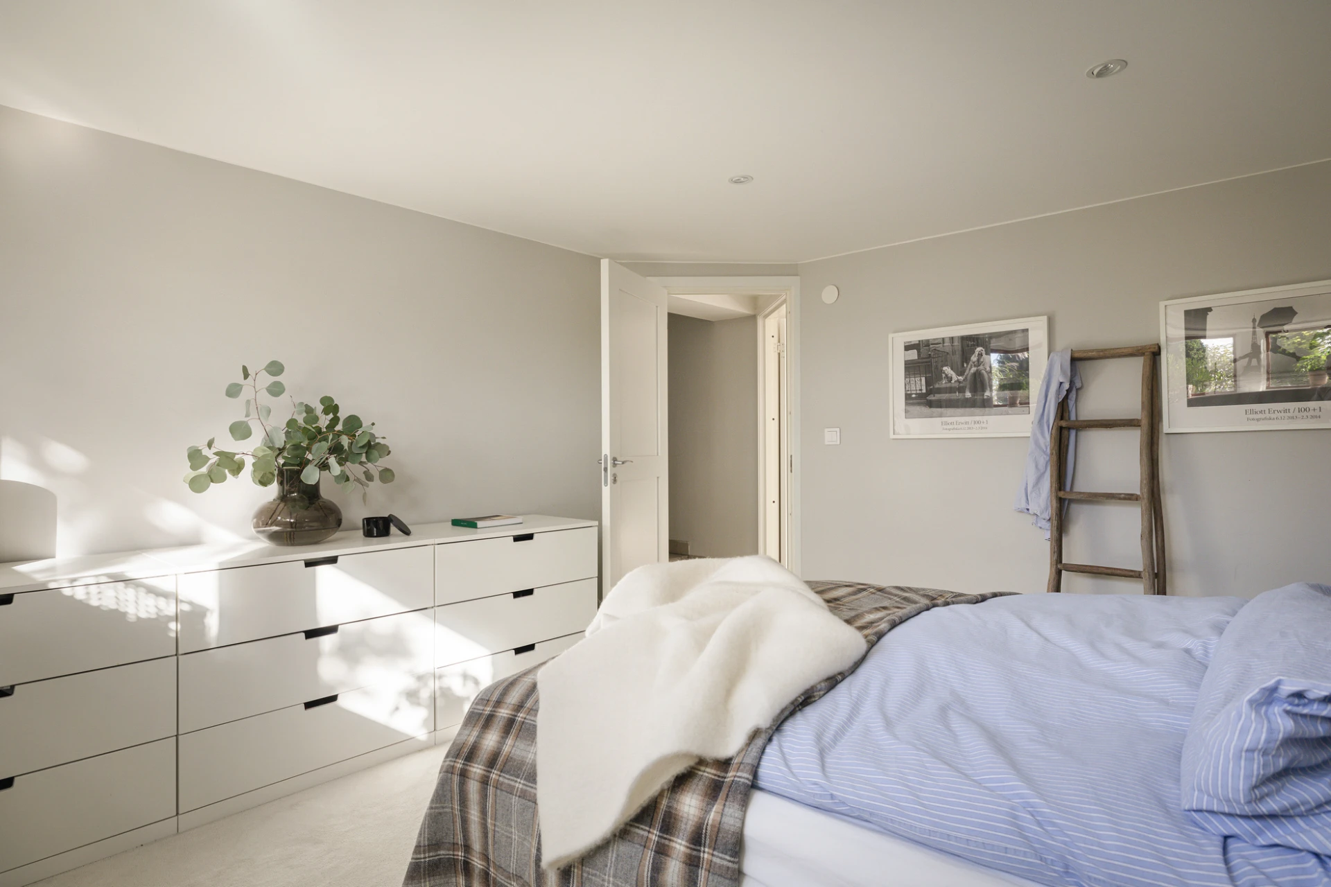 Parkettgolv och målade väggar i grå kulör. Här finns plats för dubbelsäng med tillhörande möblemang. Förvaring sker i garderober. I taket sitter dimbara spotlights samt inbyggd spotlights i fönsterfogar.