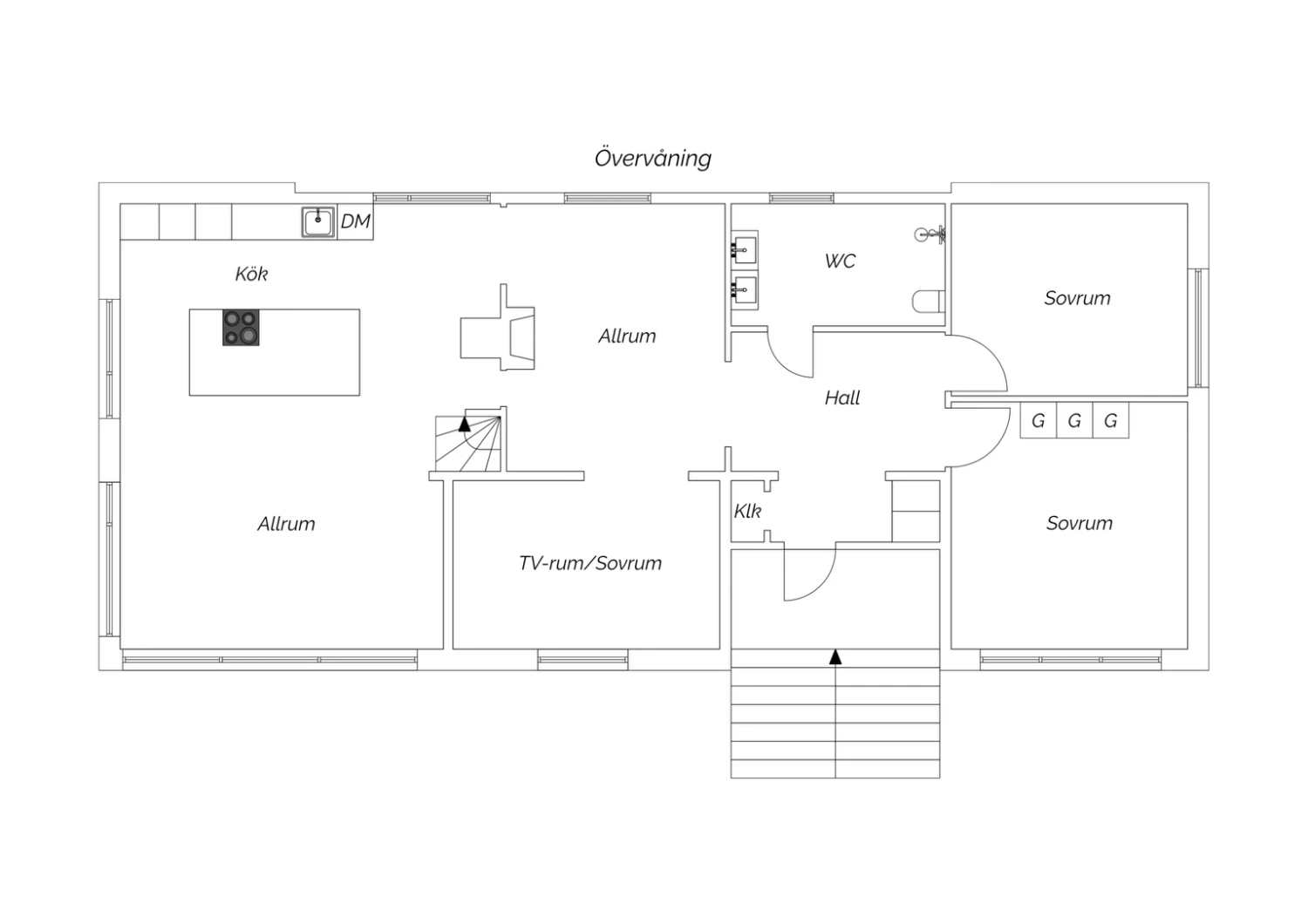 Renovering av både över- och undervåning med ny planlösning, nya innerväggar och innertak (gips).