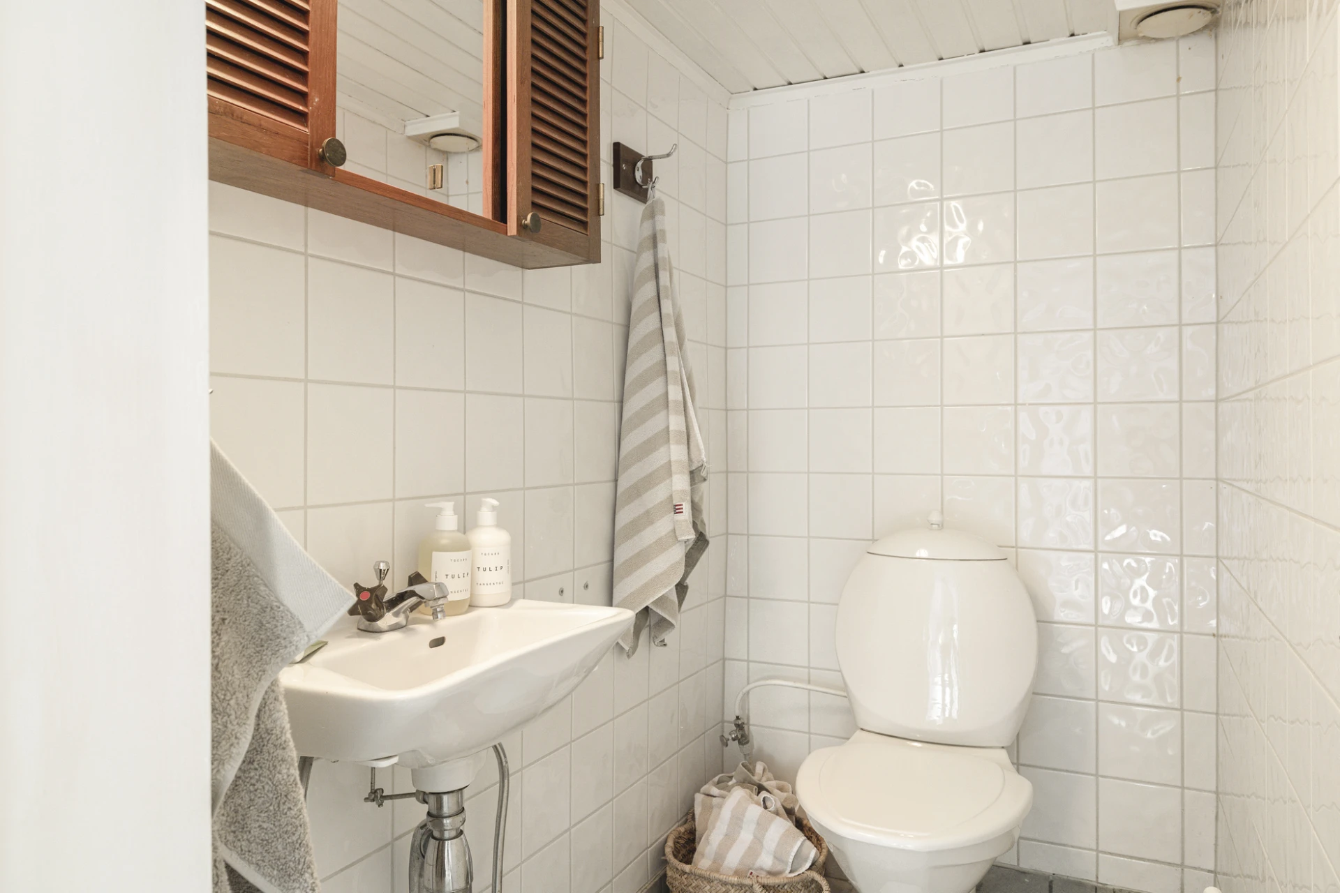 Klinkergolv i en grå nyans och vita helkaklade väggar. Utrustat med WC, handfat och spegelskåp.