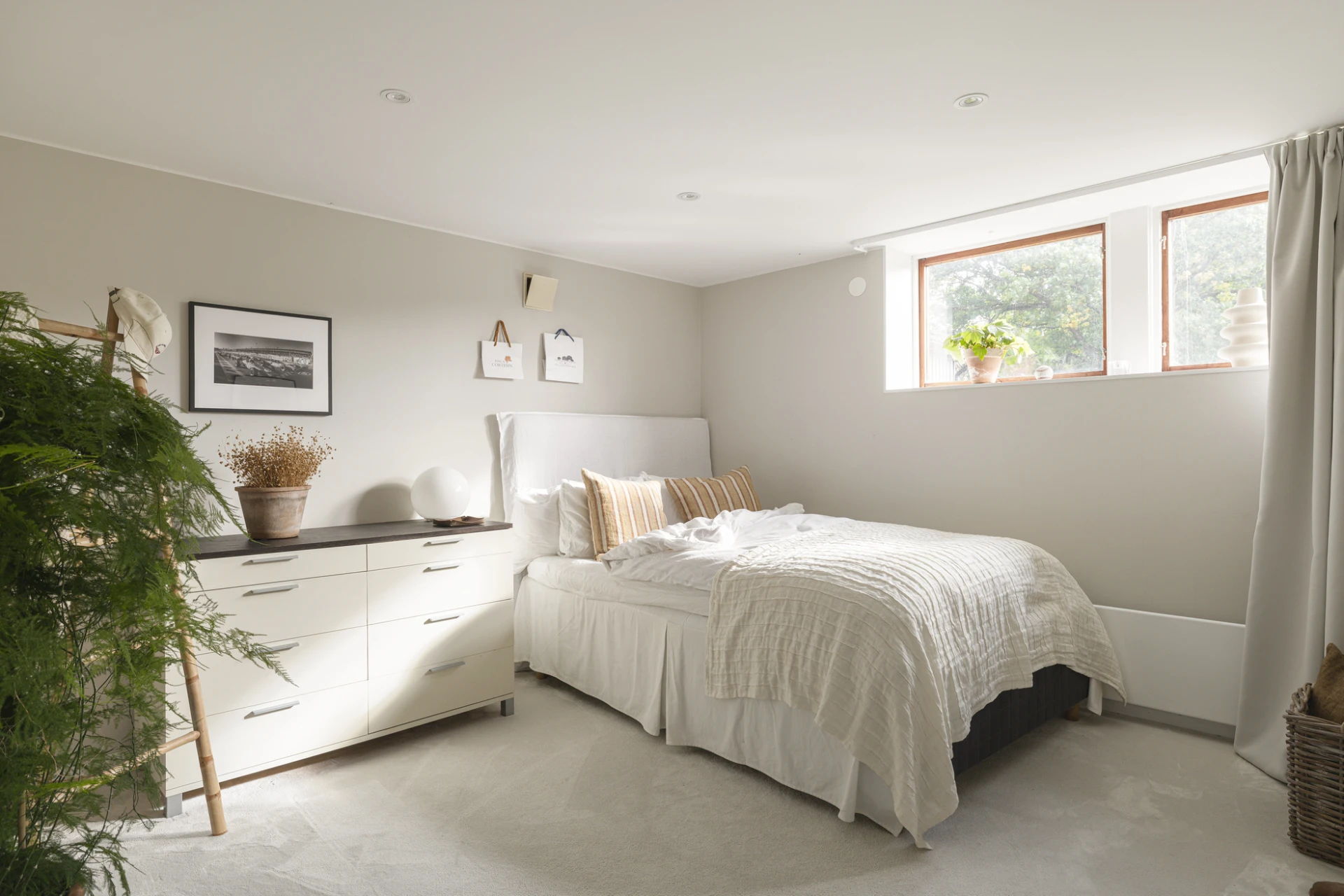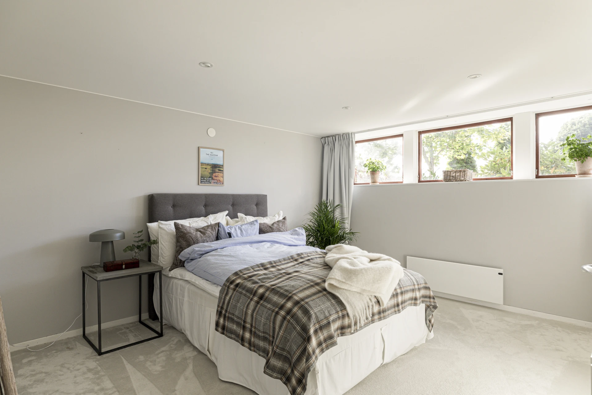 Parkettgolv och målade väggar i grå kulör. Här finns plats för dubbelsäng med tillhörande möblemang. I taket sitter dimbara spotlights samt inbyggd spotlights i fönsterfogar.