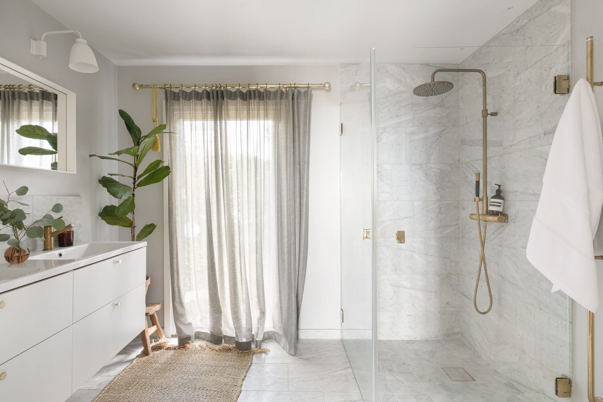 Marmorgolv med golvvärme och gråa väggar. Badrummet är utrustat med WC, handfat med kommod, spegel, dusch med vikbara glasdörrar samt handdukstork. I taket sitter dimbara spotlights. Utgång till trädgård.