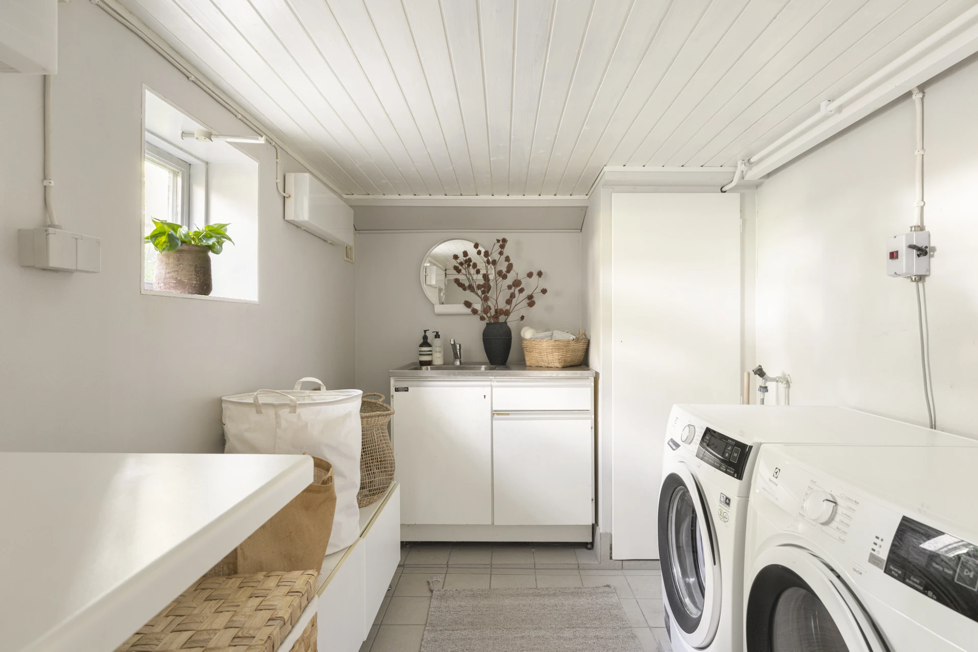 Klinkergolv i en grå nyans och väggar i grå kulör. Utrustat med tvättmaskin, torktumlare, arbetsbänk med diskho samt förvaringsskåp.