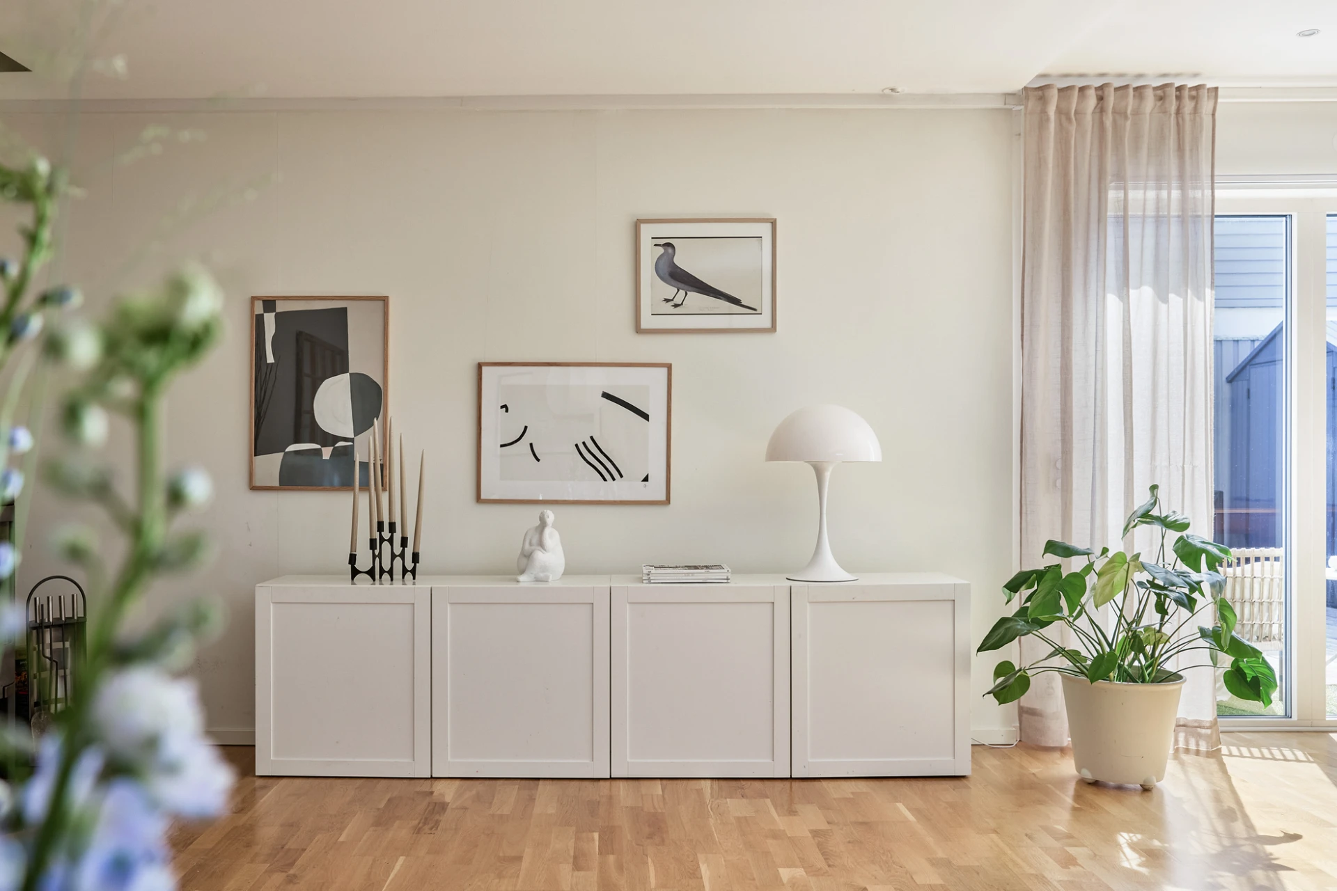 Parkettgolv och ljusa väggar. Här finns plats för bäddsoffa och tv-bänk. Används idag som ett allrum men kan göras om till sovrum. Utgång till bostadens privata altan. I taket sitter dimbar belysning.