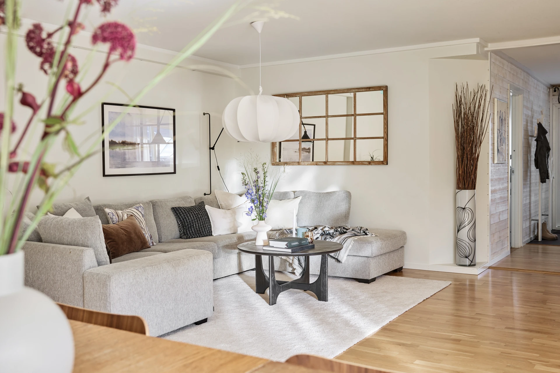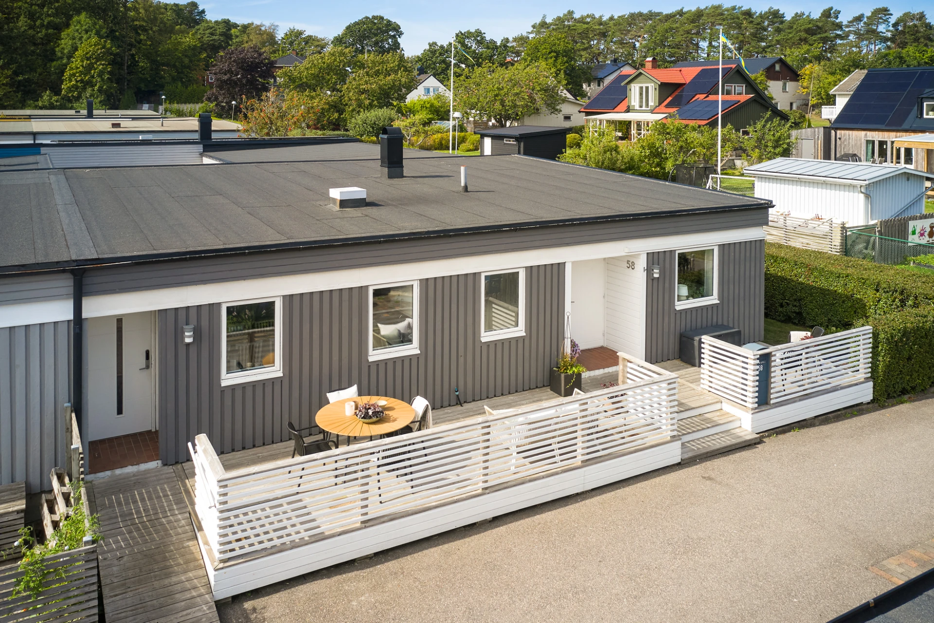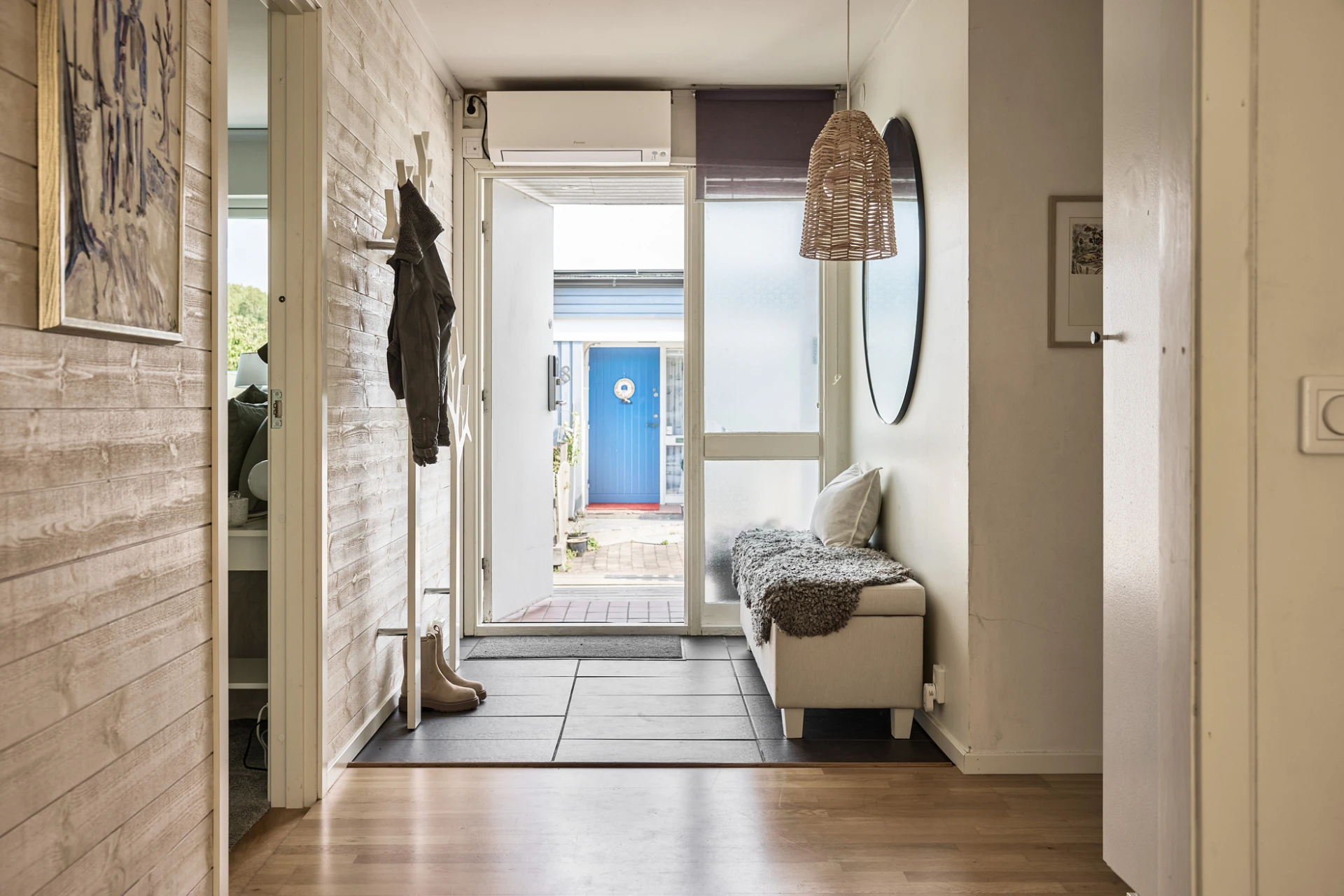 På en insynsskyddad hörntomt finner du detta inbjudande gavelradhus som kombinerar ljusa, generösa ytor med en härlig känsla av avskildhet. Det stora vardagsrummet blir husets naturliga mittpunkt och tillsammans med den flexibla planlösningen finns möjlighet att skapa upp till fem sovrum – perfekt för den stora familjen eller för dig som önskar både arbetsrum och gästrum.