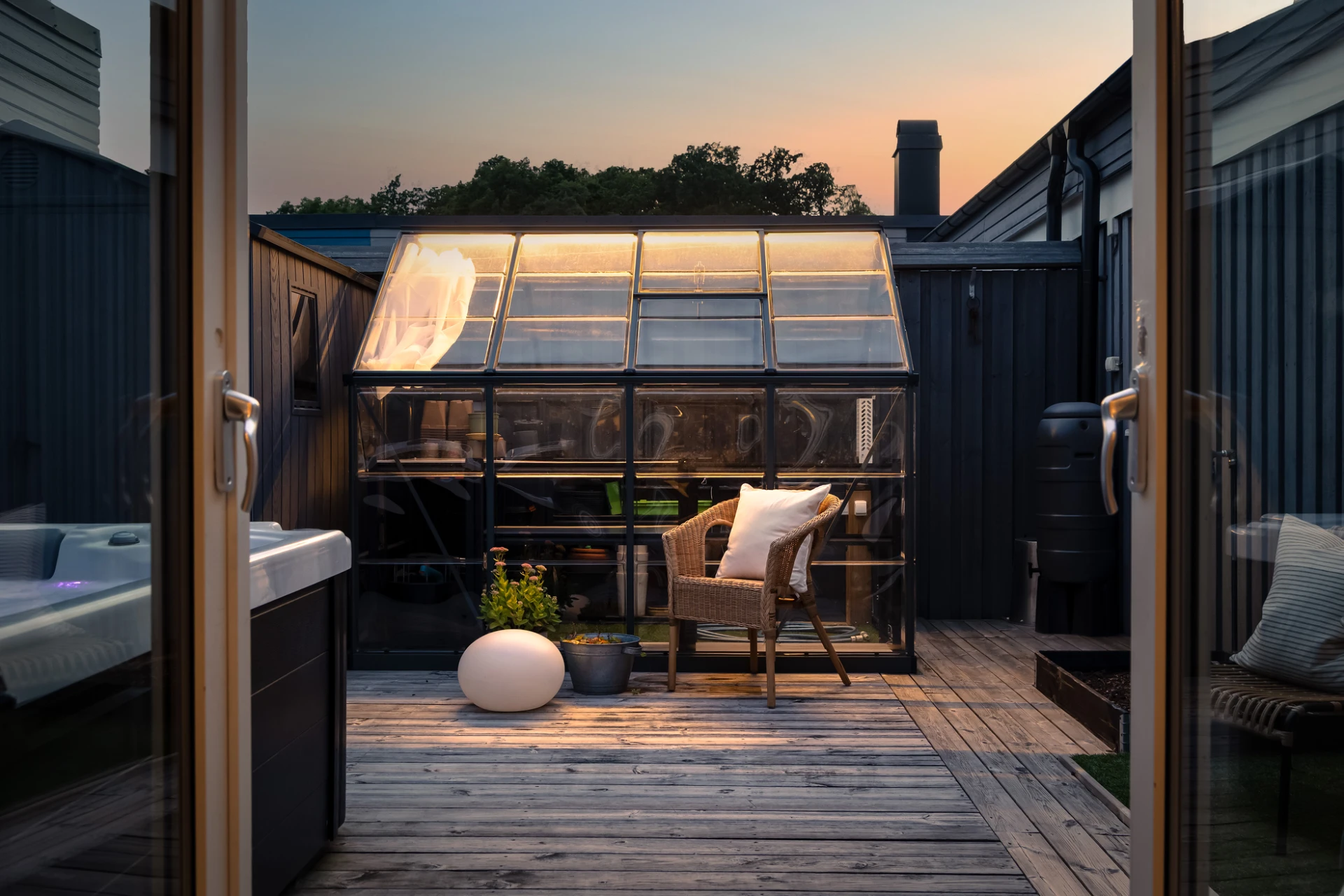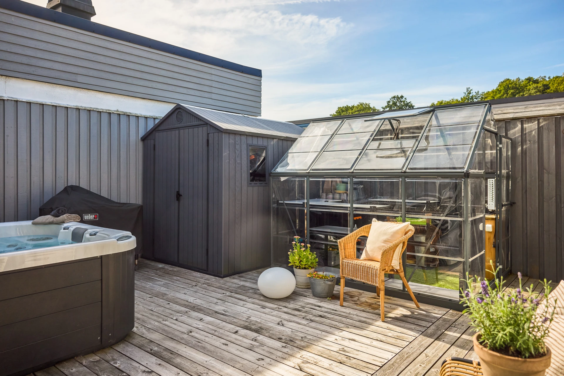 Master bedroom bjuder på en lyxig atmosfär med egen walk in closet, medan hemmets utomhusmiljöer ger vardagen det lilla extra. Här finns tre trivsamma uteplatser för sol och umgänge, ett växthus och fina odlingsmöjligheter samt en privat jacuzzi att njuta av året runt.