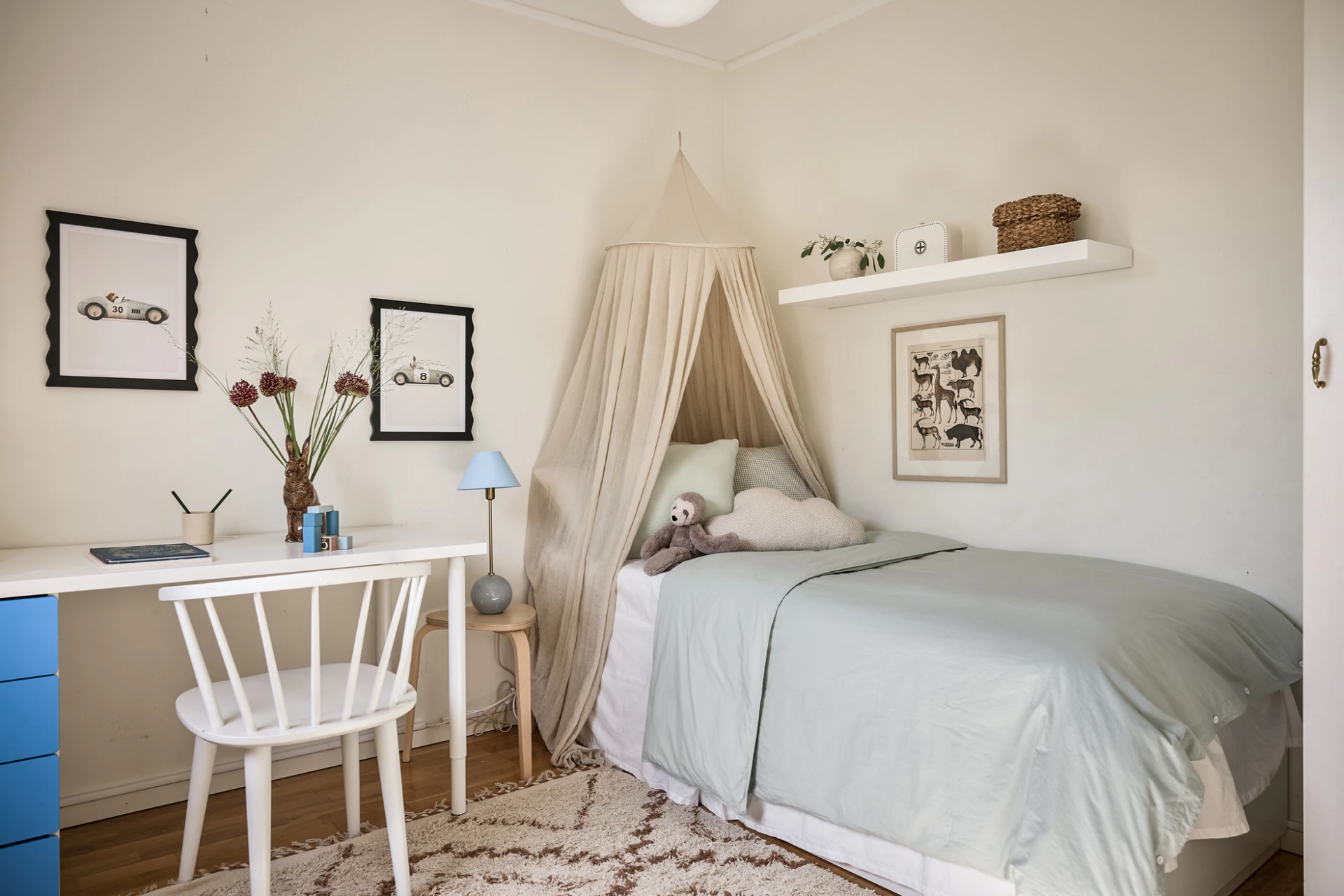 Parkettgolv och ljusa väggar. Här finns plats för enkelsäng och skrivbord. Förvaring sker i en garderob.