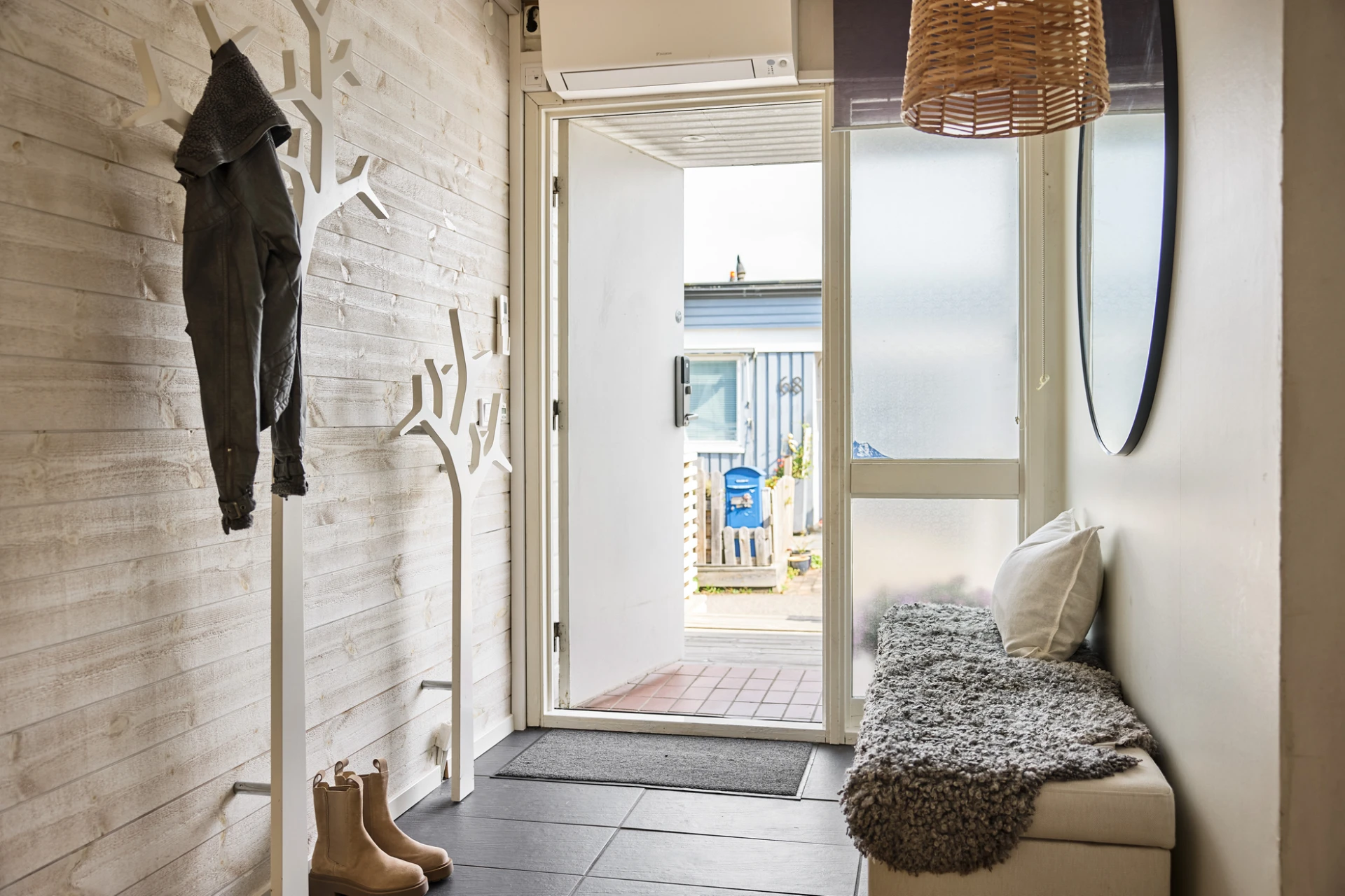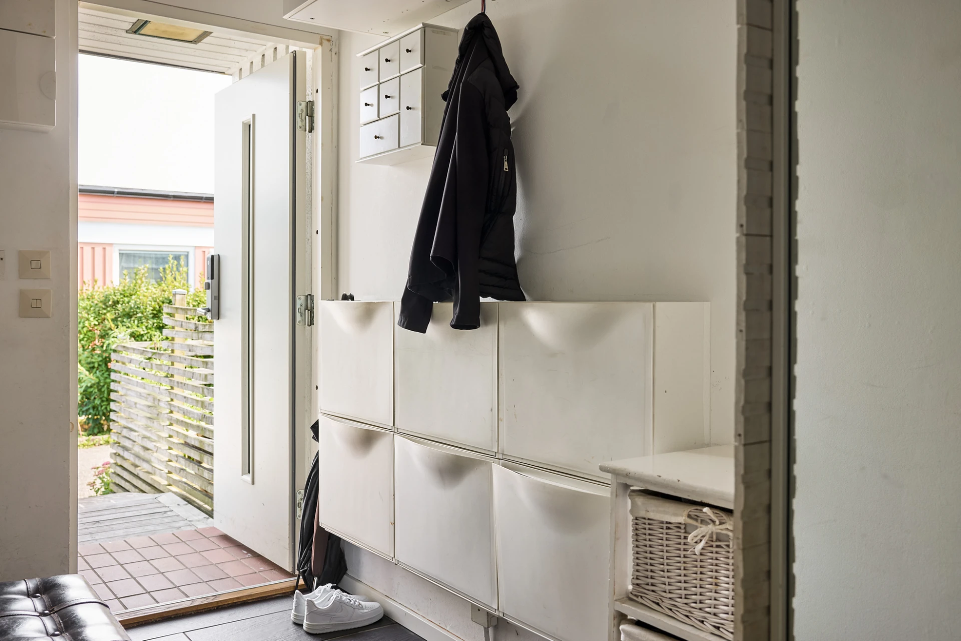 Klinkergolv i grå nyans och ljusa väggar. Här finns plats för avhängning och förvaring inbyggda garderober.