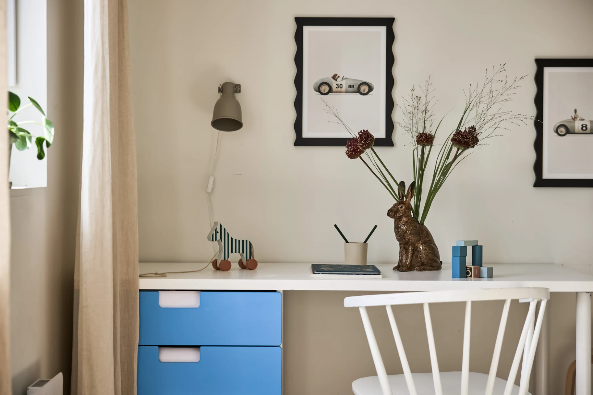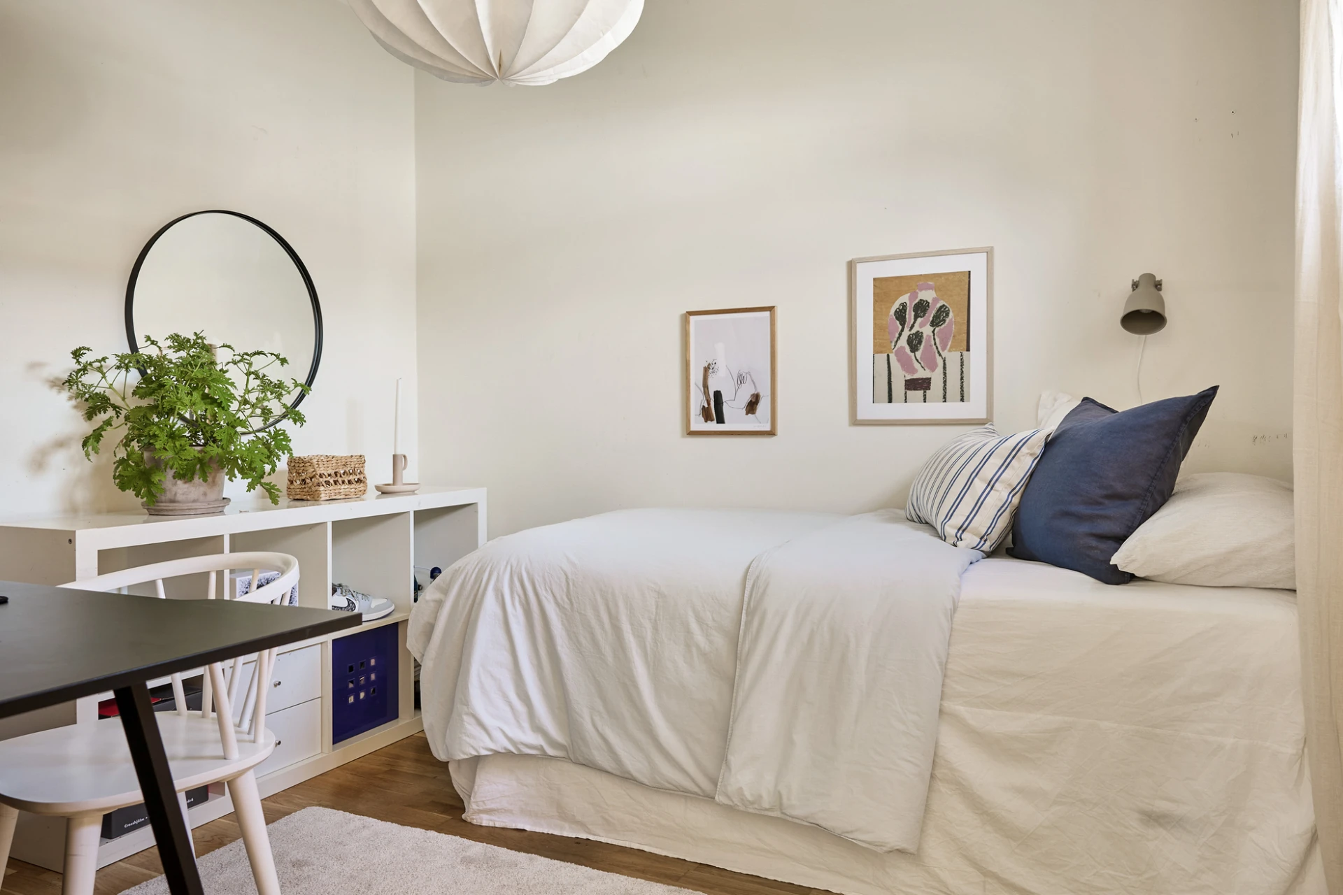 Ljusa väggar. Här finns plats för arbetshörna med tillhörande möblemang.