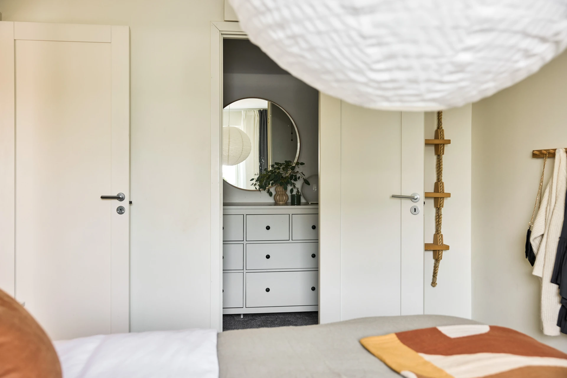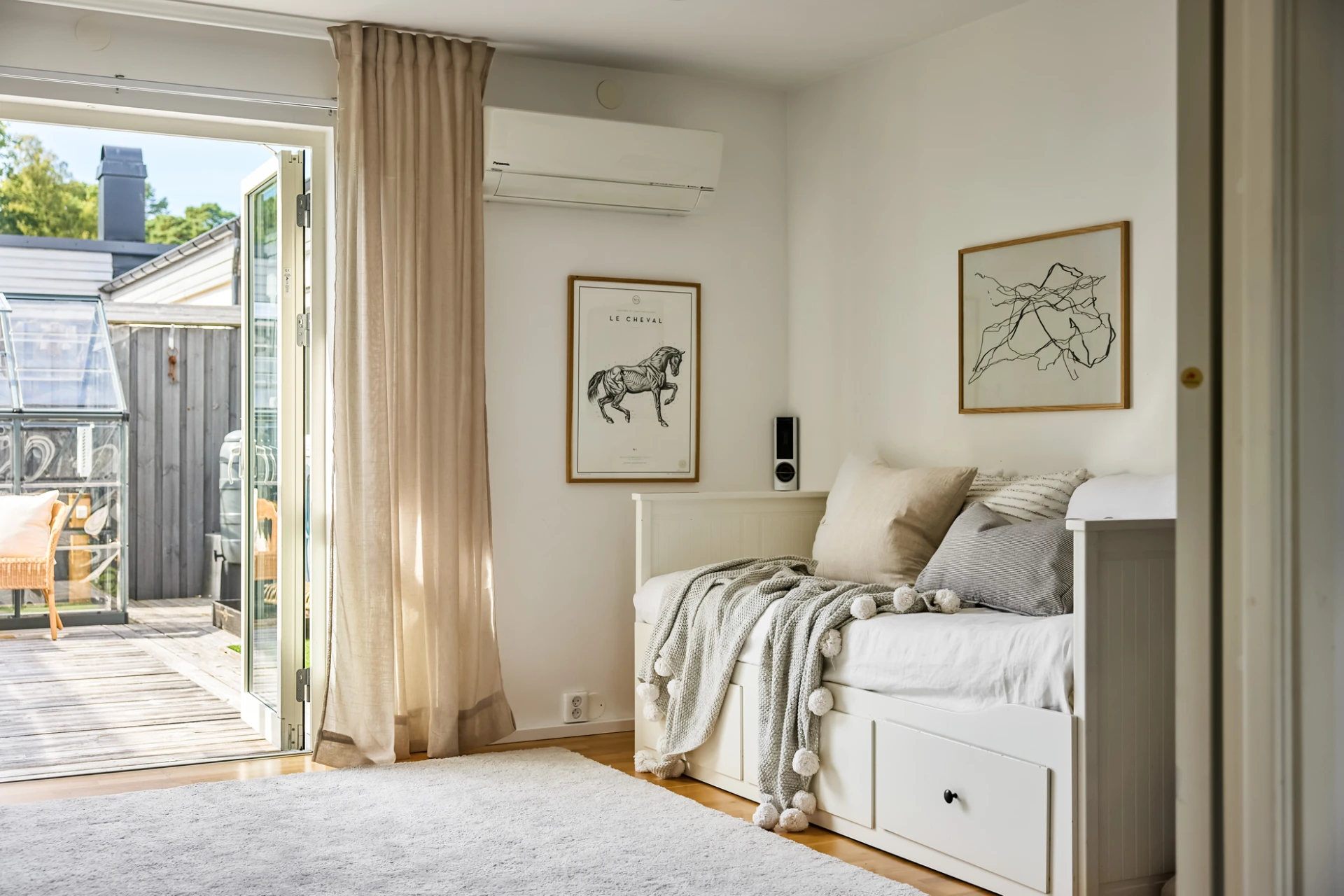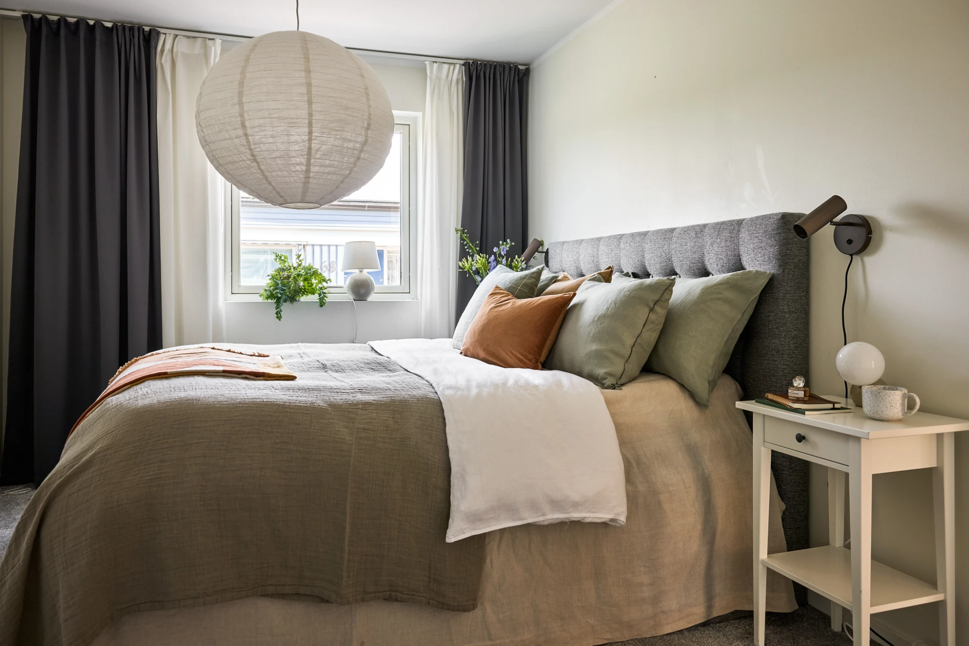 Ljust målade väggar. Här finns plats för dubbelsäng med tillhörande möblemang. Förvaring sker i en walk in closet.