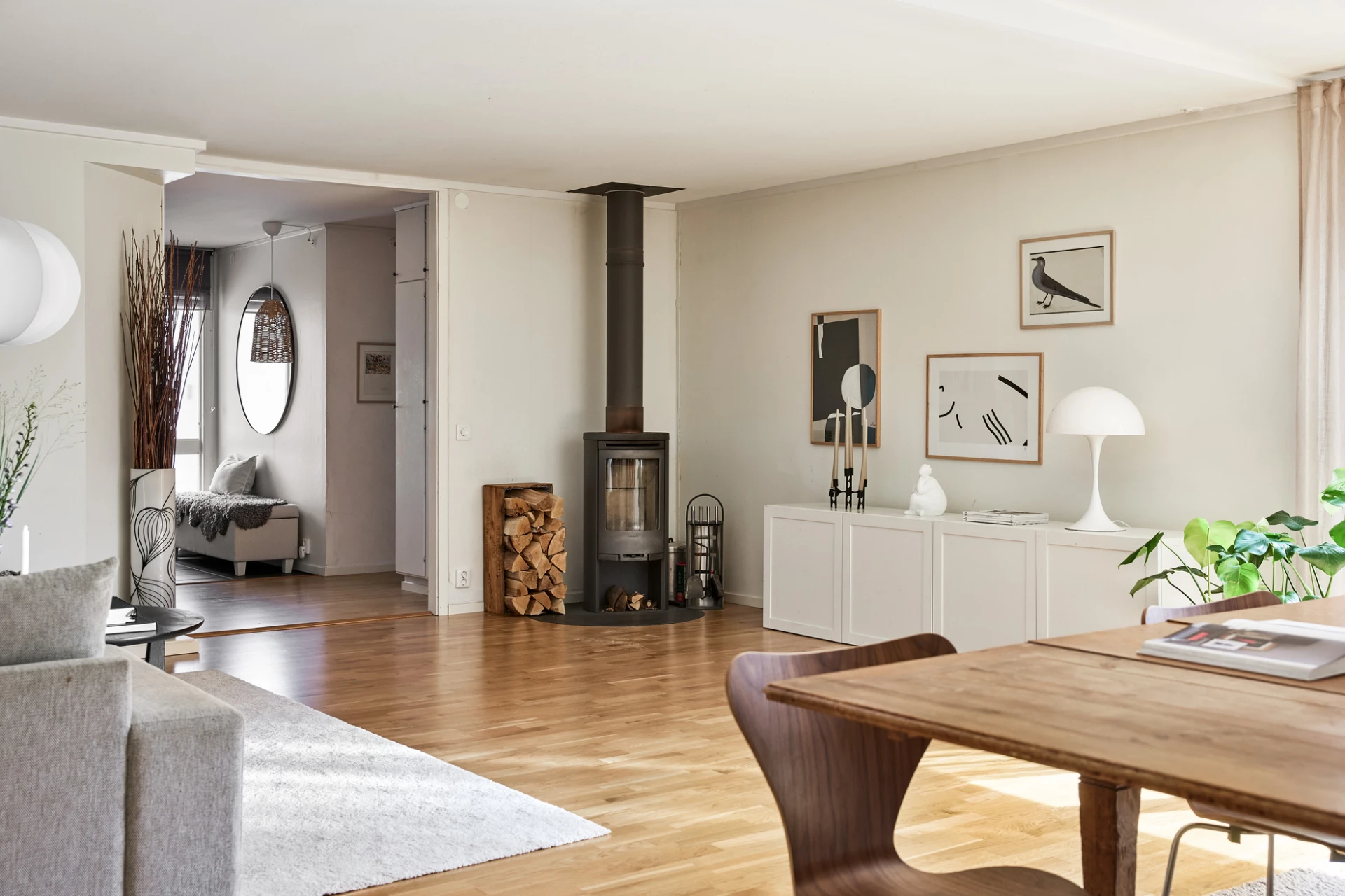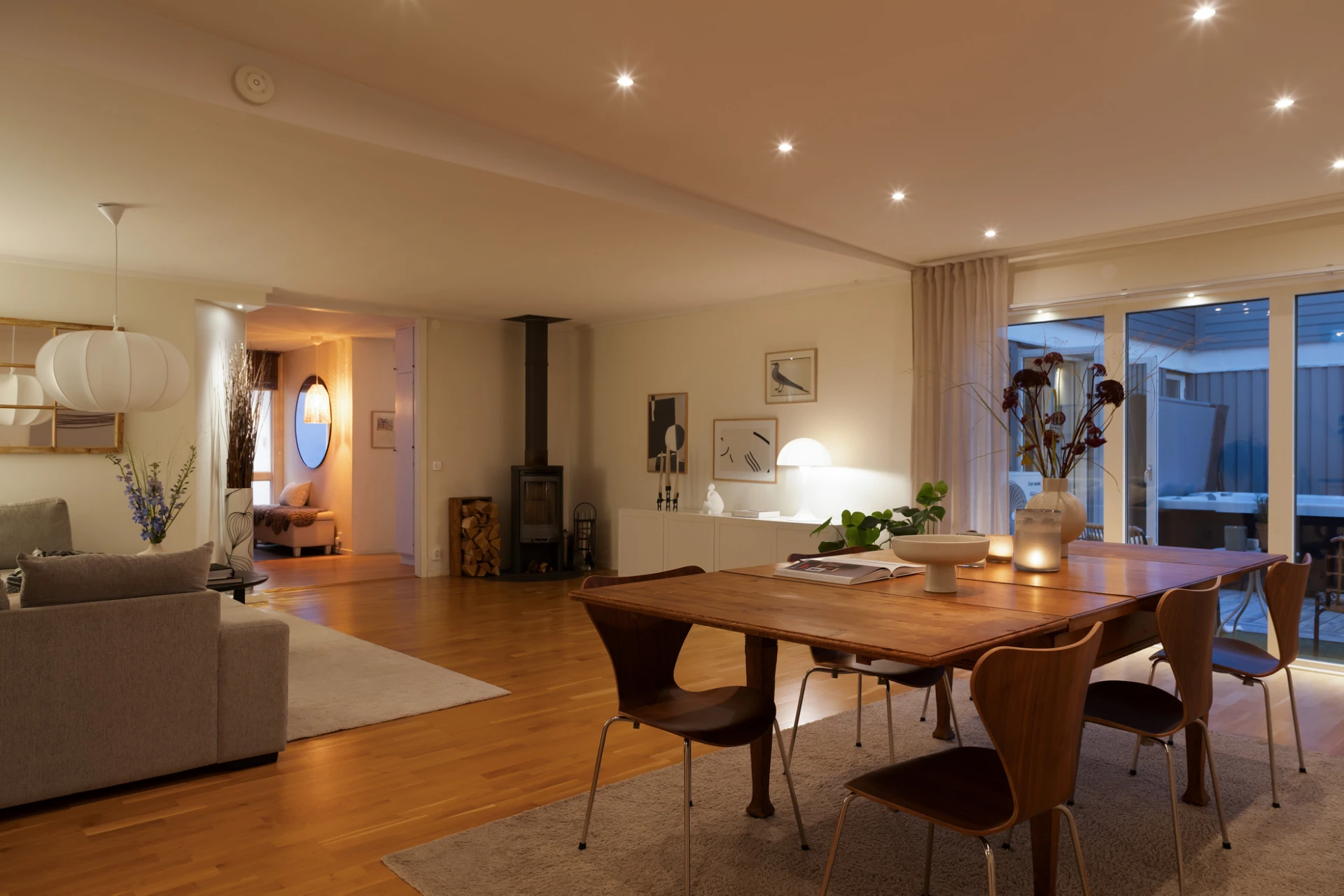 Parkettgolv och ljusa väggar. Här finns plats för soffgrupp med tillhörande möblemang samt matsalsdel. I taket sitter dimbar belysning.