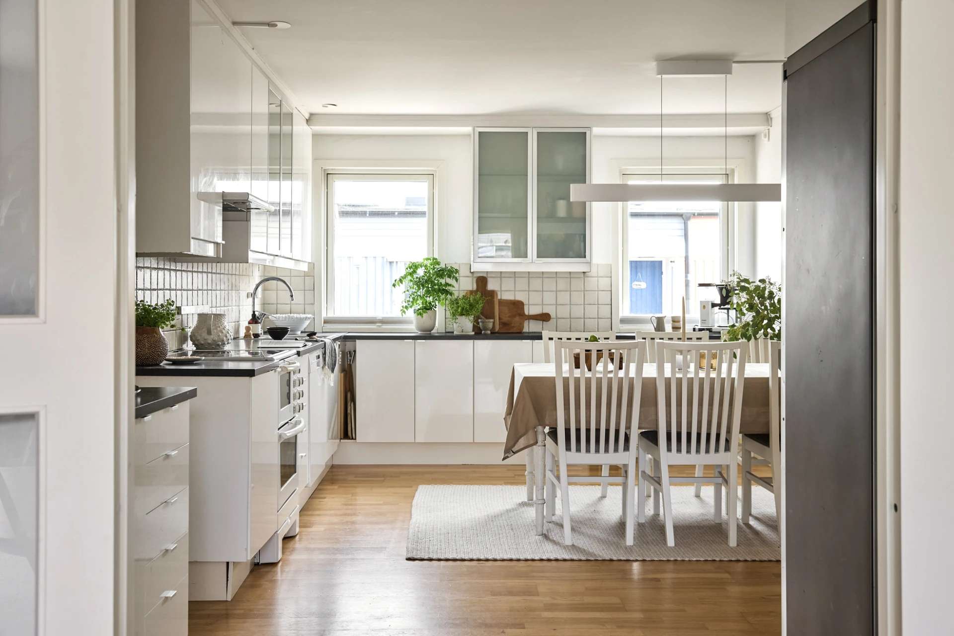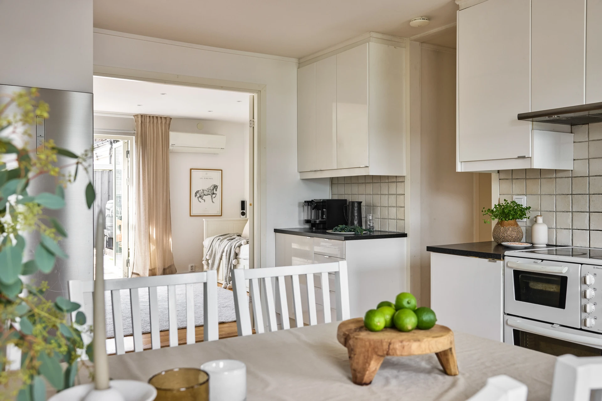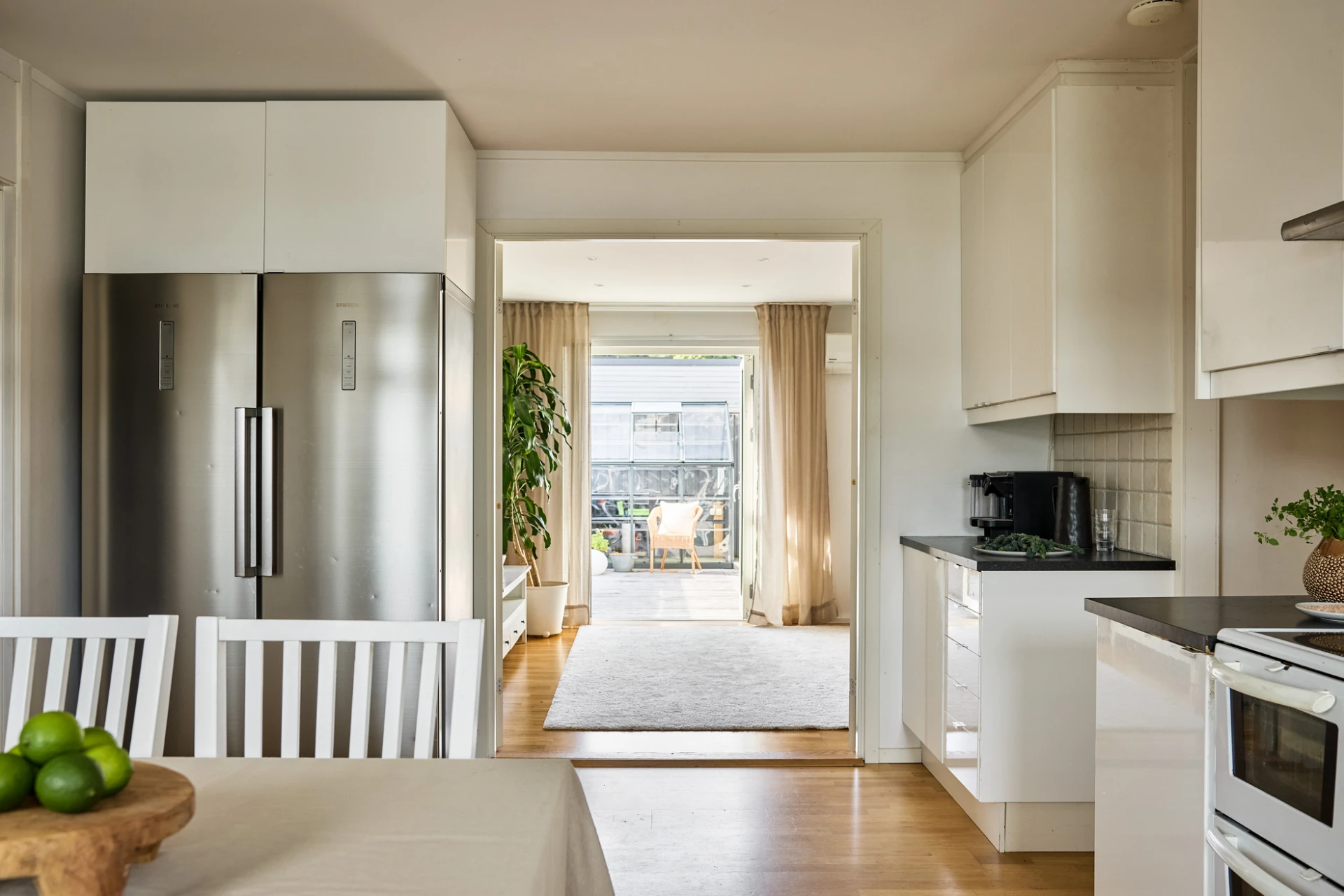 Parkettgolv och ljusa väggar. Köksinredning i vitt och ovanför den mörka arbetsbänken sitter ljust kakel. Vitvarorna består av kyl och frys i fullhöjd, diskmaskin, spis med ugn samt köksfläkt. Här finns matplats för ca 6 personer. I taket sitter dimbar belysning.