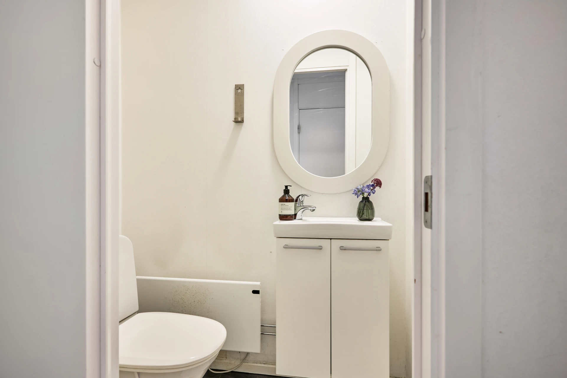 Mörkt golv och ljusa väggar. Utrustat med WC, handfat med kommod samt spegel.