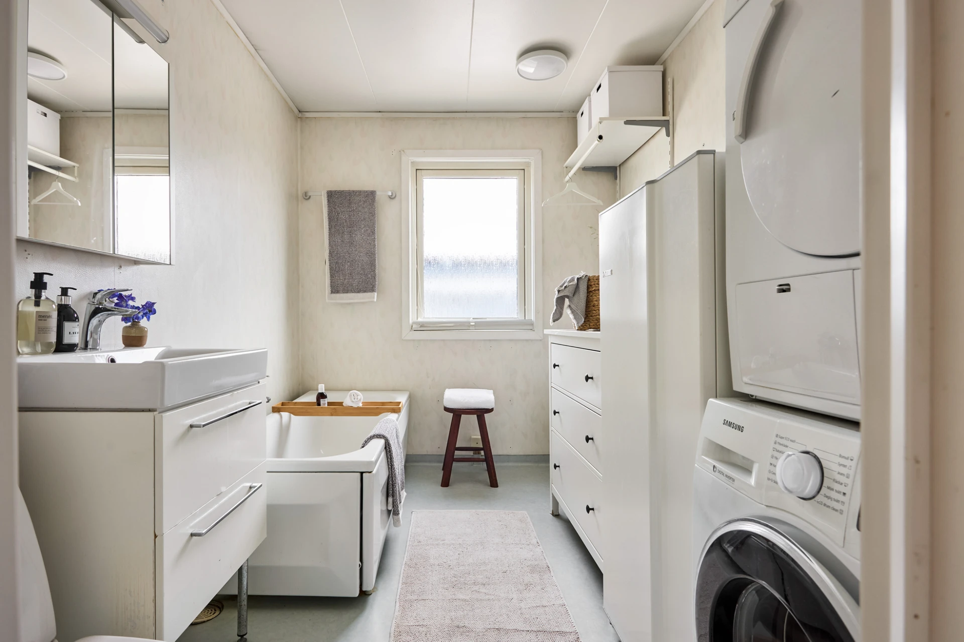Golv i ljus nyans och ljusa väggar. Badrummet är utrustat med WC, handfat med kommod, spegelskåp, badkar, tvättmaskin och torktumlare.