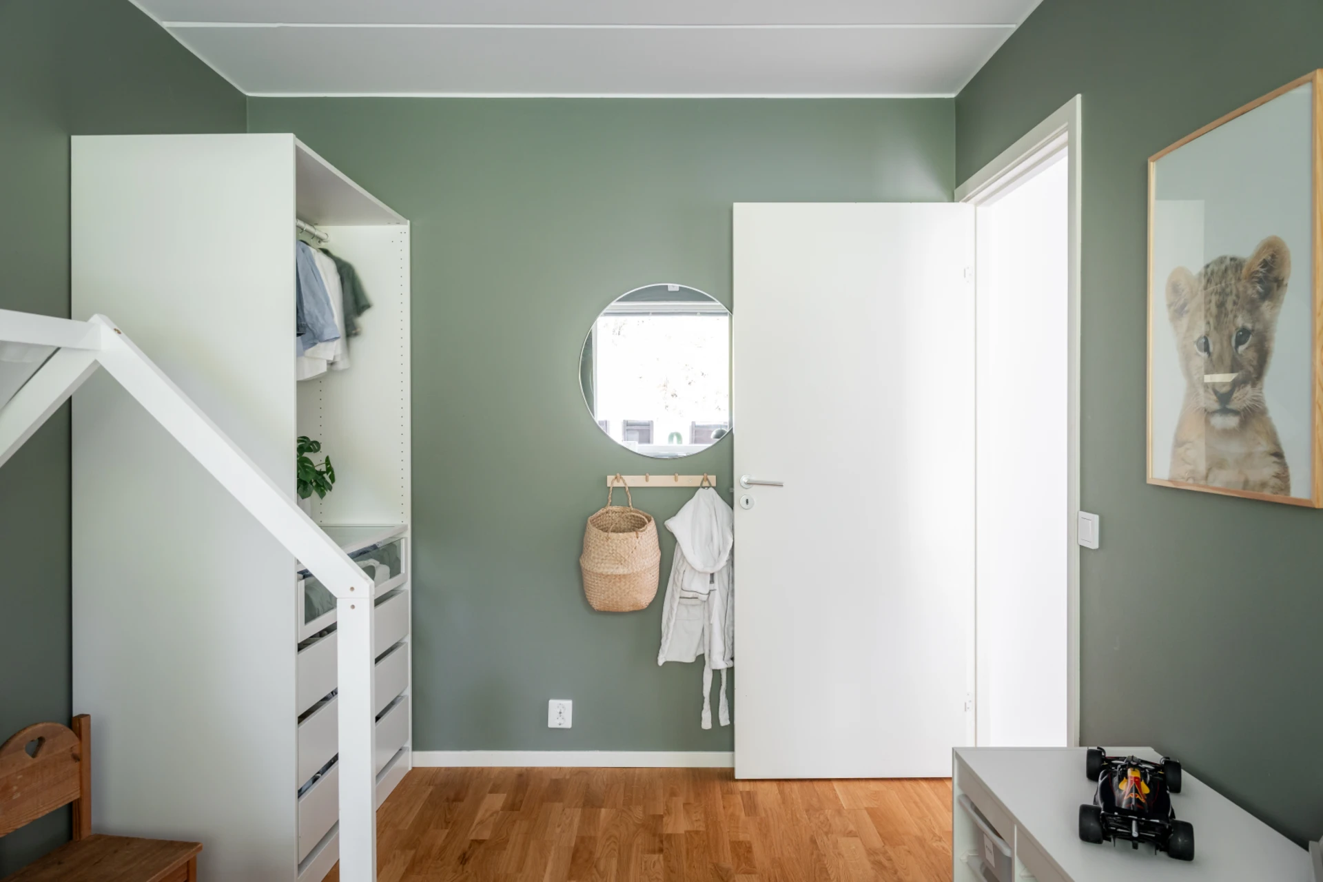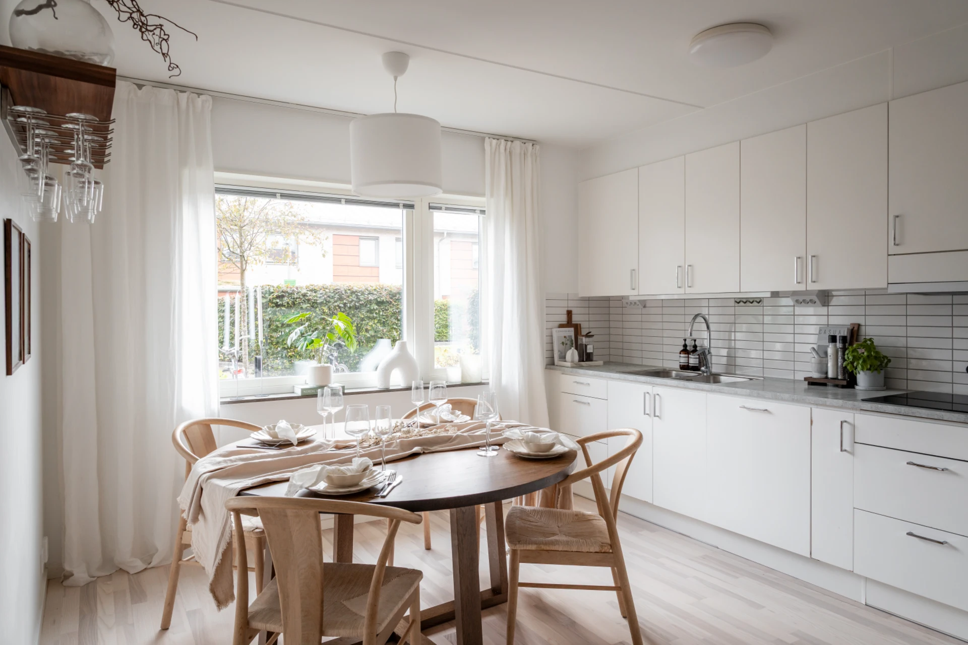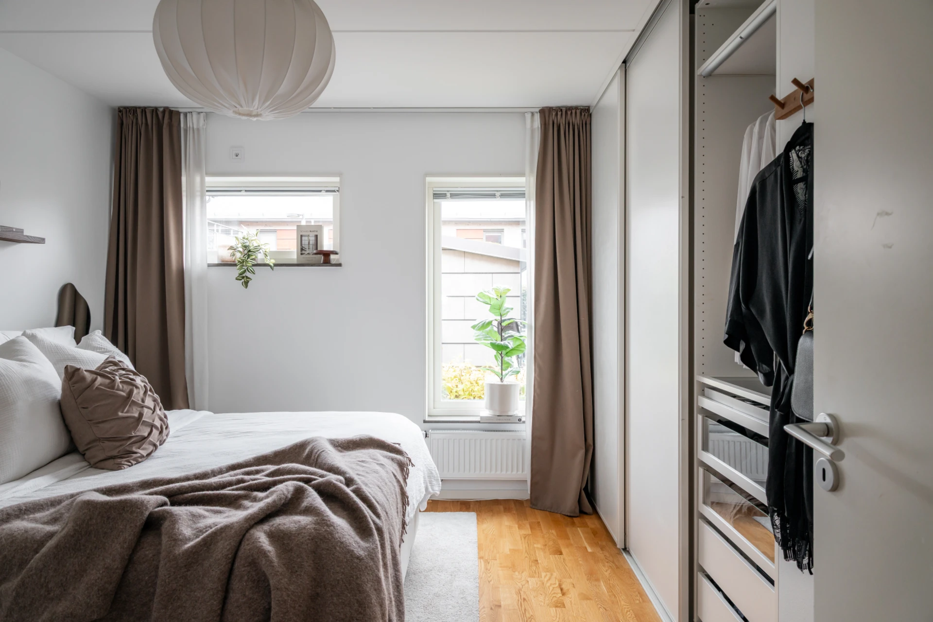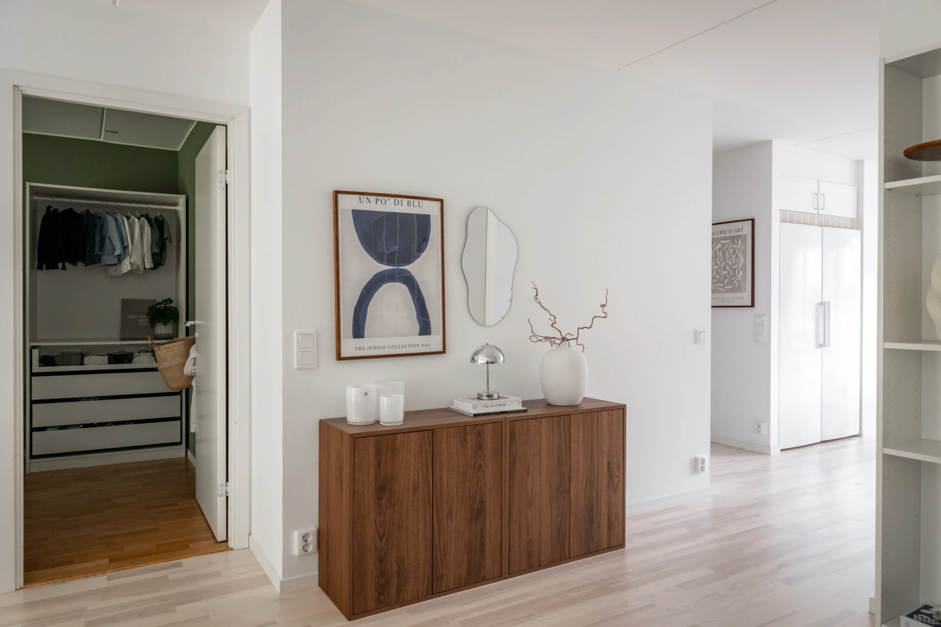 Det stilrena köket i vitt är både praktiskt och snyggt, med fullhöjds kyl och frys, goda arbetsytor och förvaringsmöjligheter. Här finns en naturlig matsalsdel vid fönstret där du njuter av middagar i kvällssolen. Intill köket och vardagsrummet ligger en flexibel klädkammare – som enkelt kan användas som hemmakontor, walk-in closet eller extra rum.