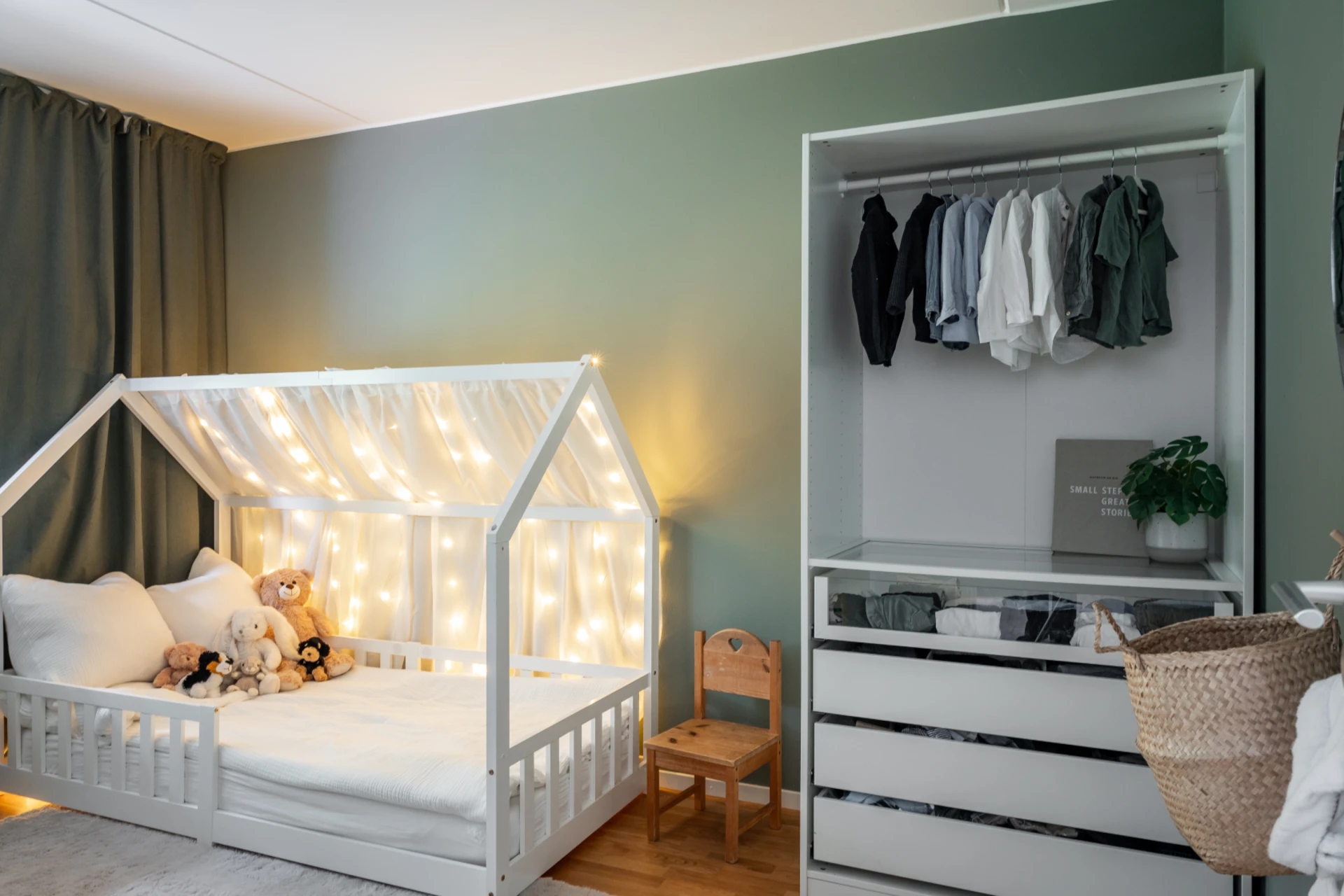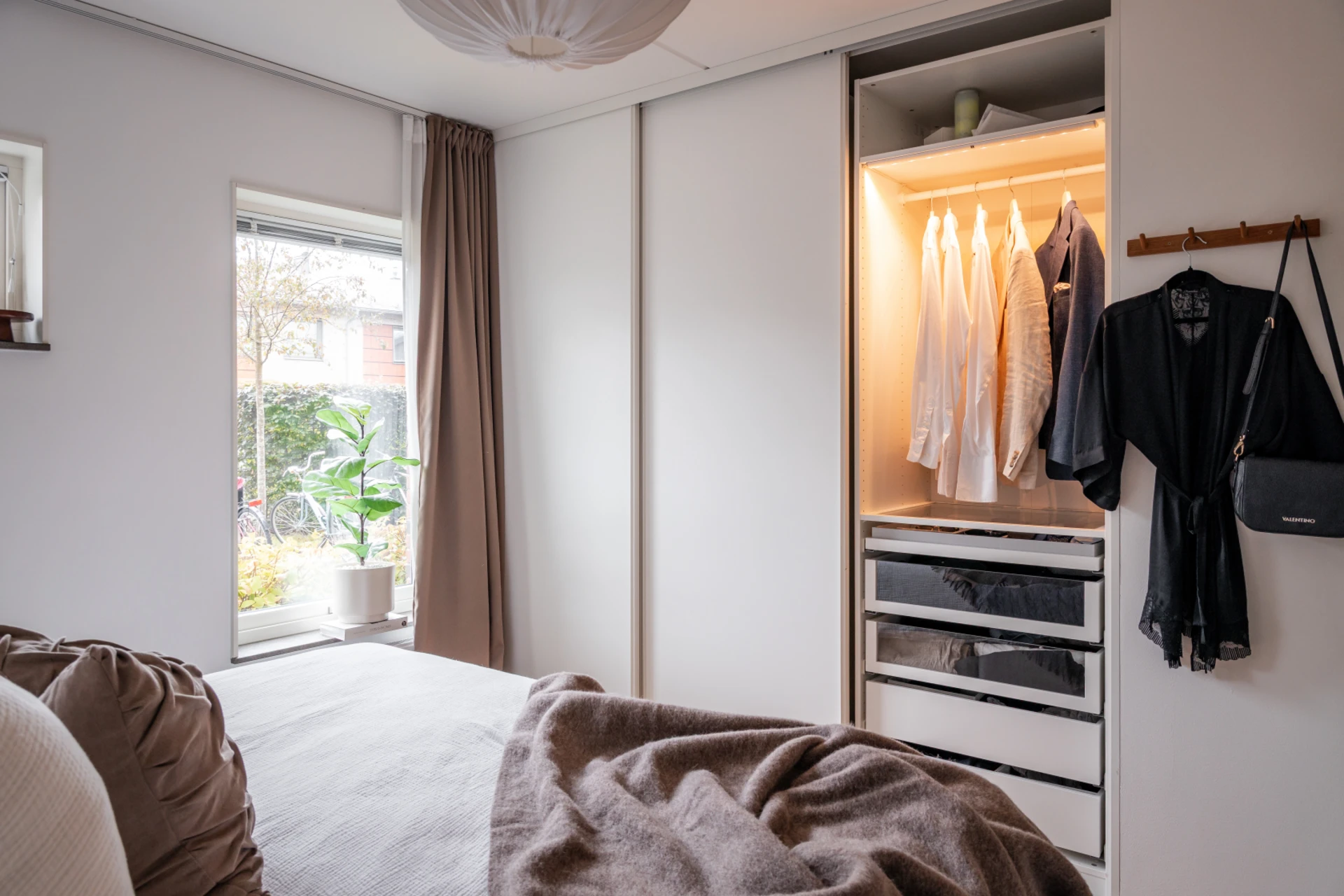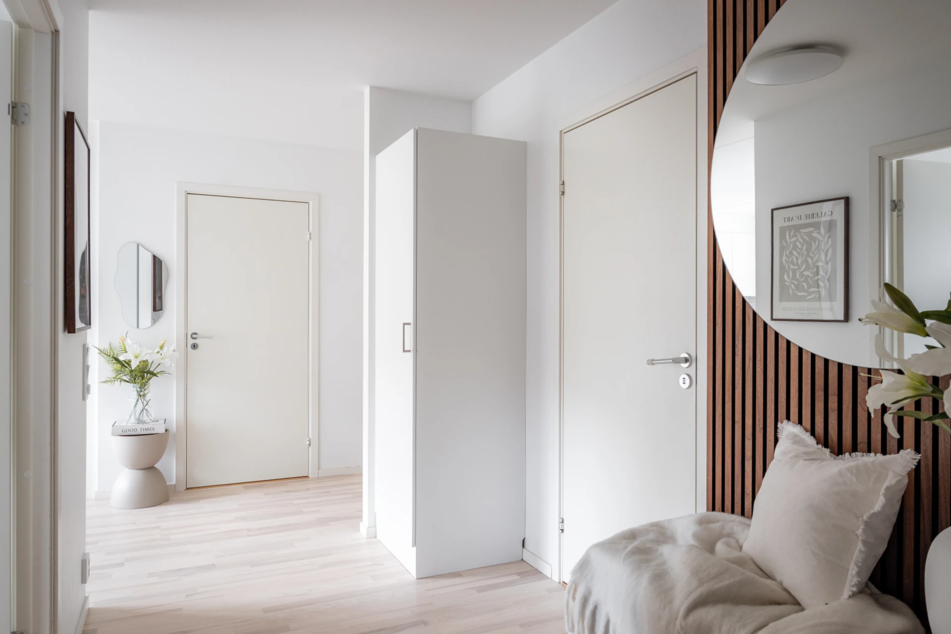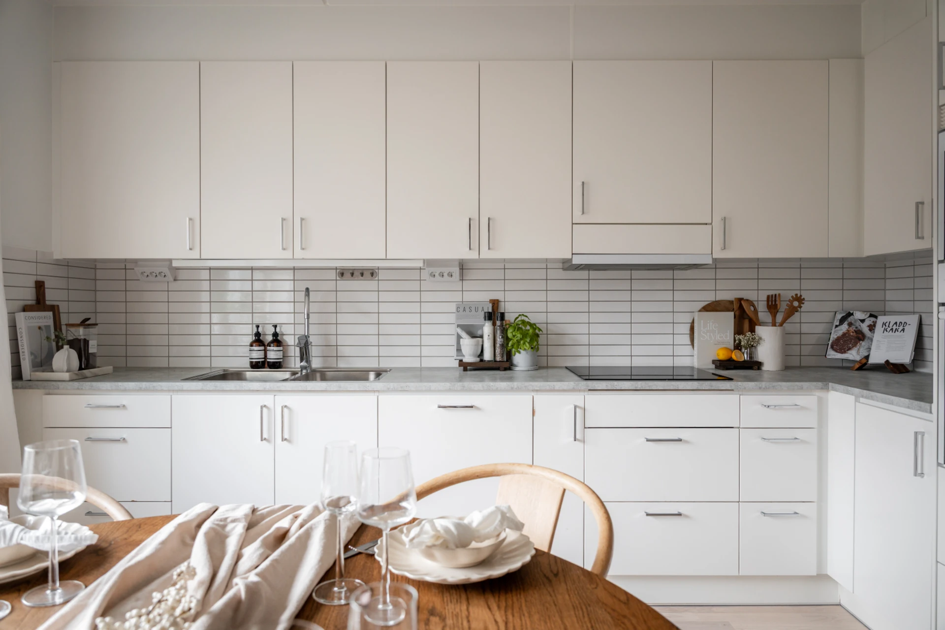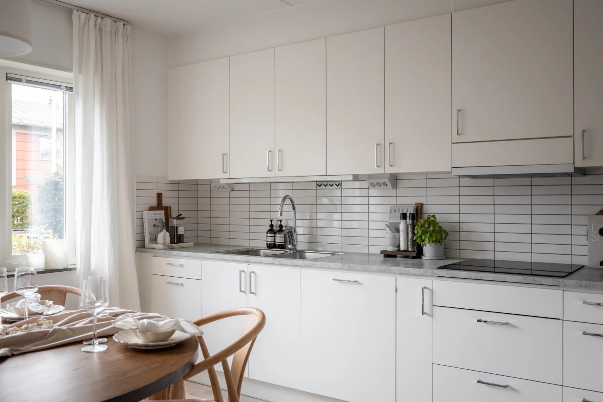 Det stilrena köket i vitt är både praktiskt och snyggt, med fullhöjds kyl och frys, goda arbetsytor och förvaringsmöjligheter. Här finns en naturlig matsalsdel vid fönstret där du njuter av middagar i kvällssolen. Intill köket och vardagsrummet ligger en flexibel klädkammare – som enkelt kan användas som hemmakontor, walk-in closet eller extra rum.