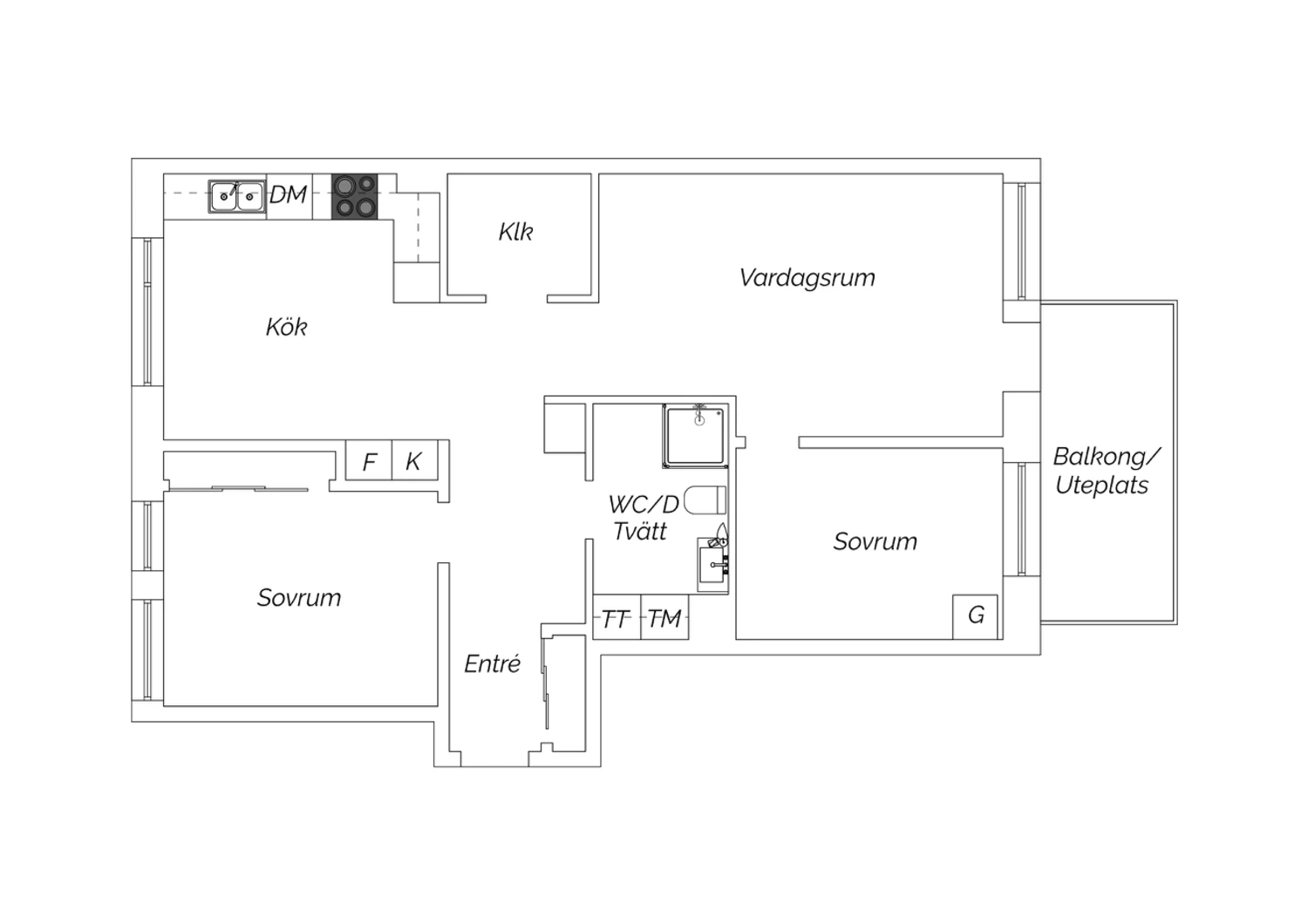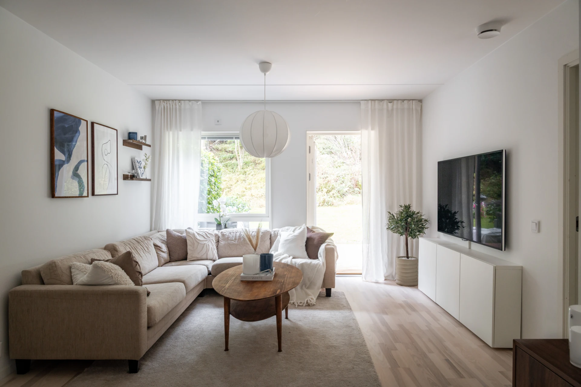 Lägenheten erbjuder två rymliga sovrum med stora fönster som släpper in rikligt med dagsljus, och som även har mycket god ljudisolering för en lugn natts sömn. Egen tvättutrustning i badrummet ger extra bekvämlighet i vardagen. Uteplatsen är något utöver det vanliga – stor nog för grillkvällar, utemöbler och umgänge i kvällssolen. Här lever du med naturen precis utanför dörren.