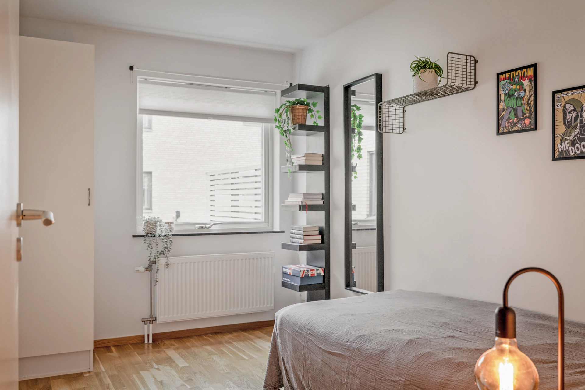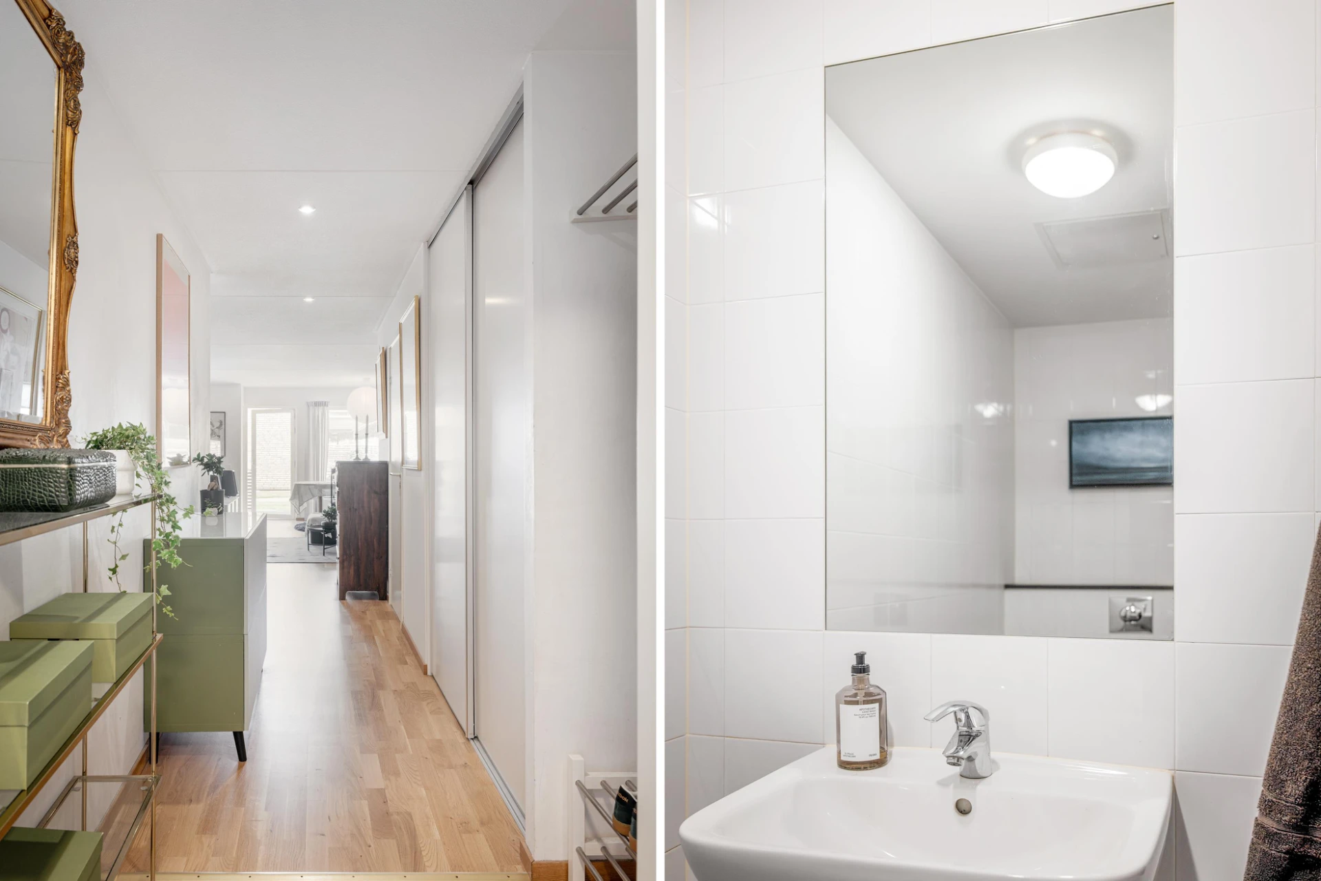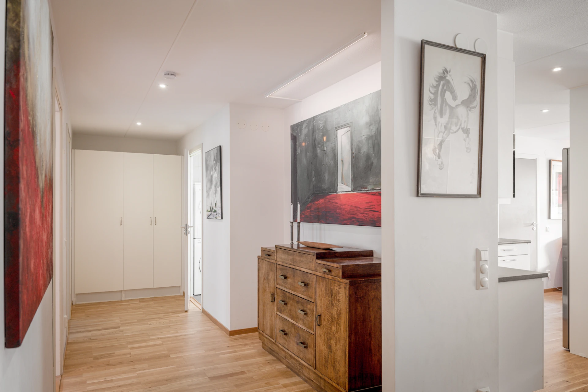 Ekparkett och vitmålade väggar. Här finns plats för avhängning samt förvaring i en skjutdörrsgarderob.