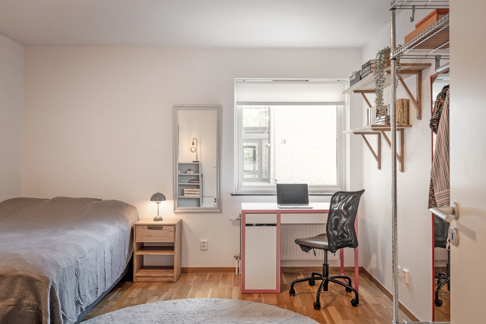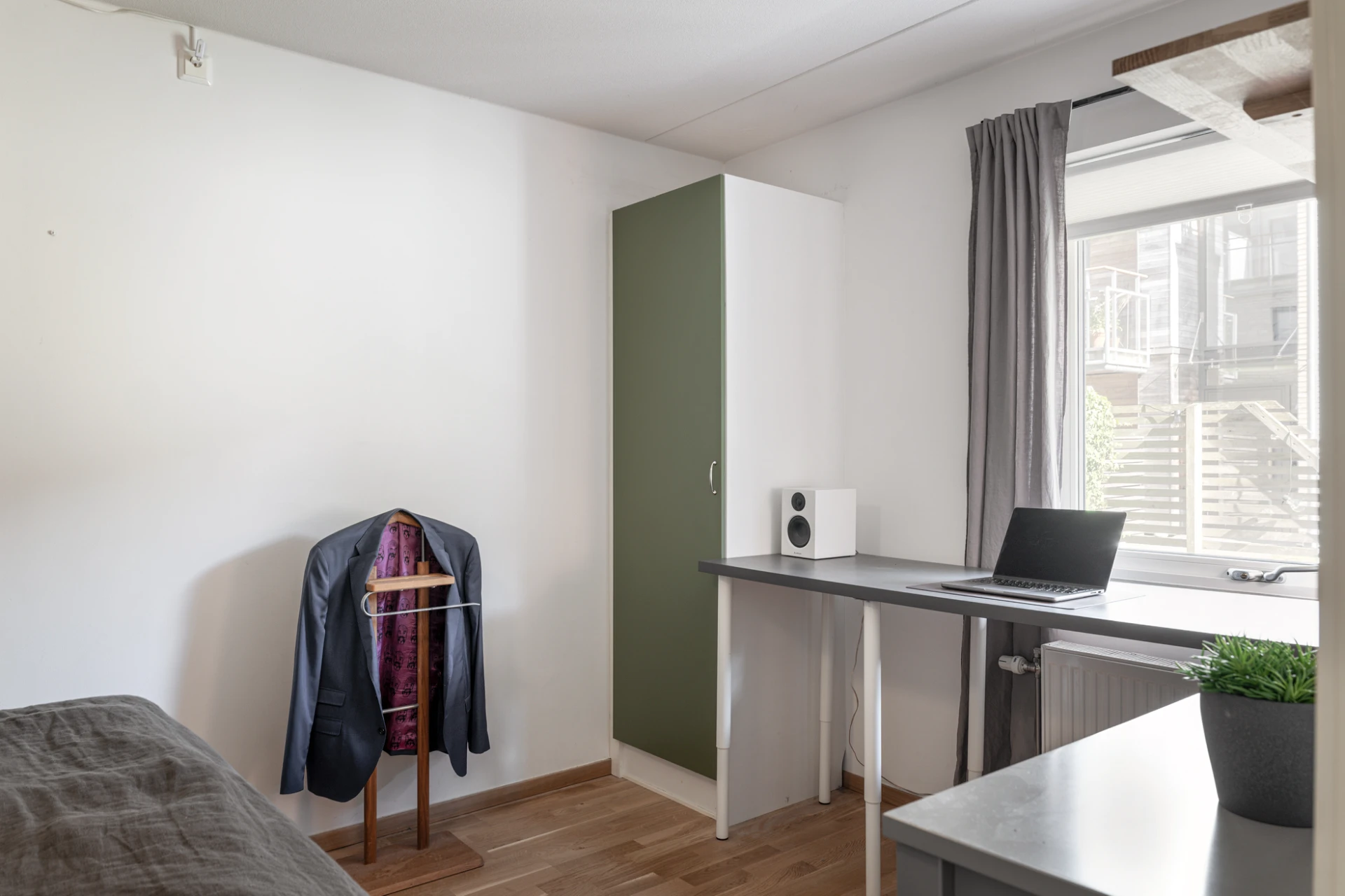 Ekparkett och vitmålade väggar. Här finns plats för enkelsäng med tillhörande möblemang samt skrivbord. Förvaring i en garderob.