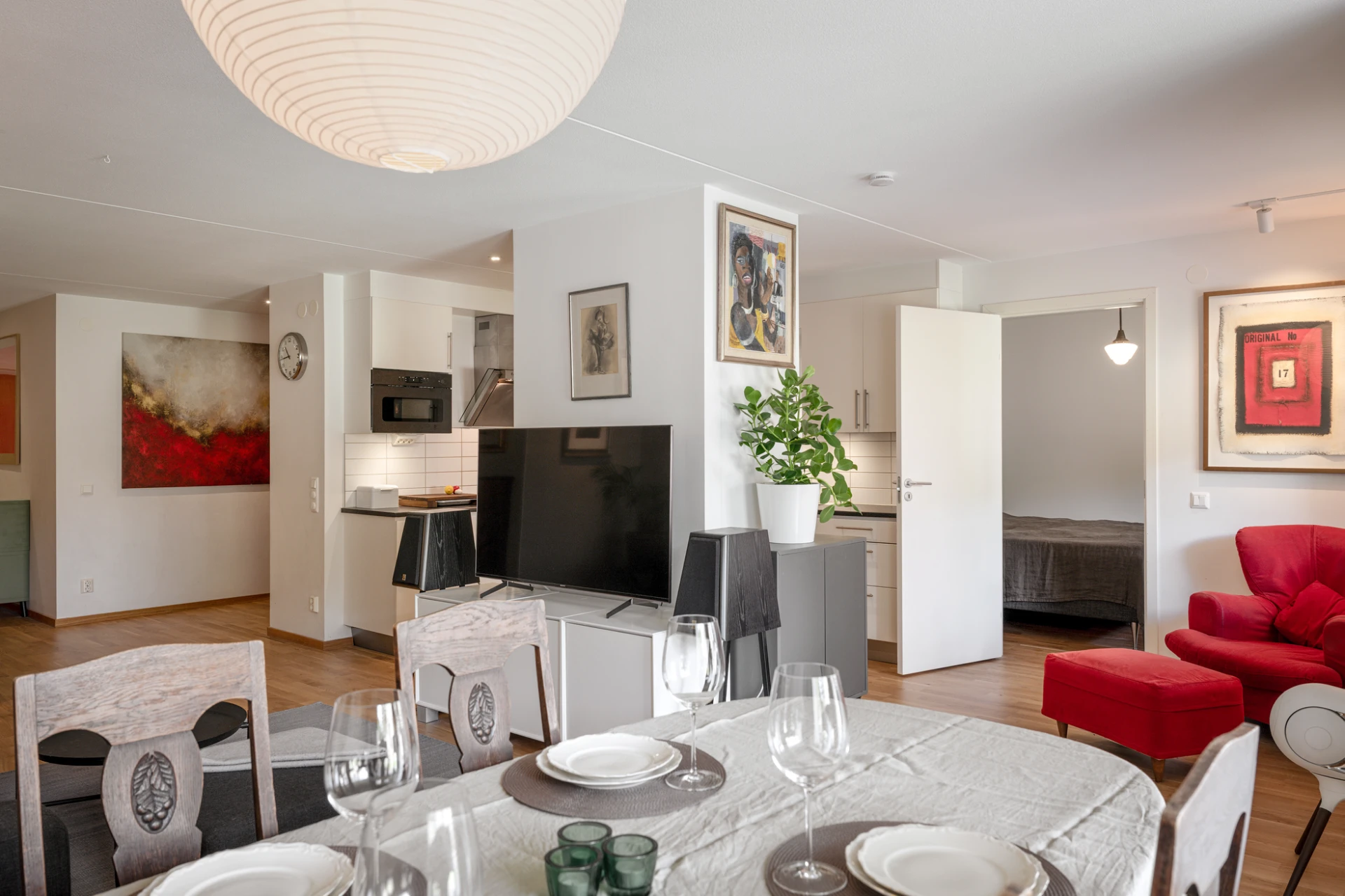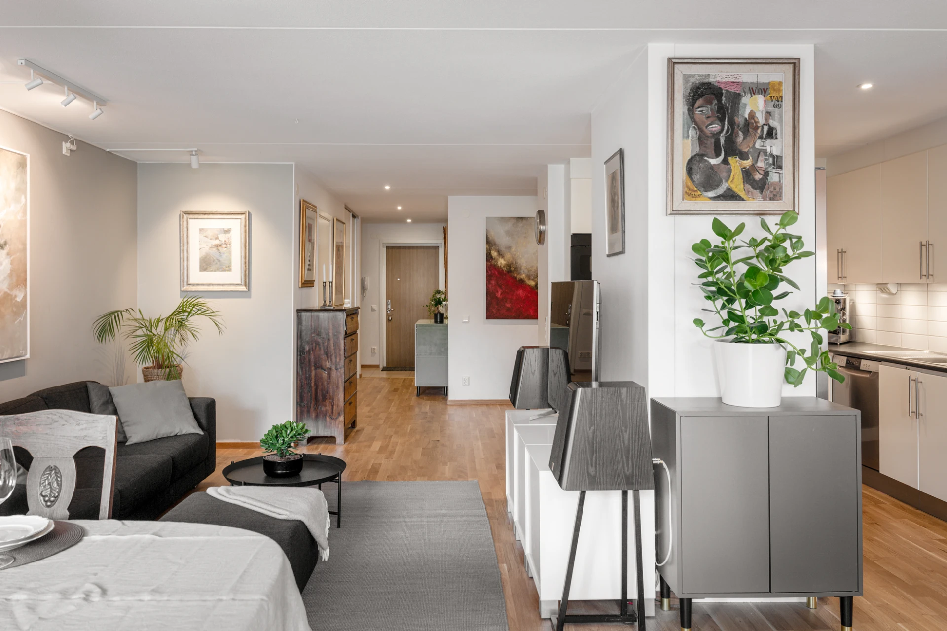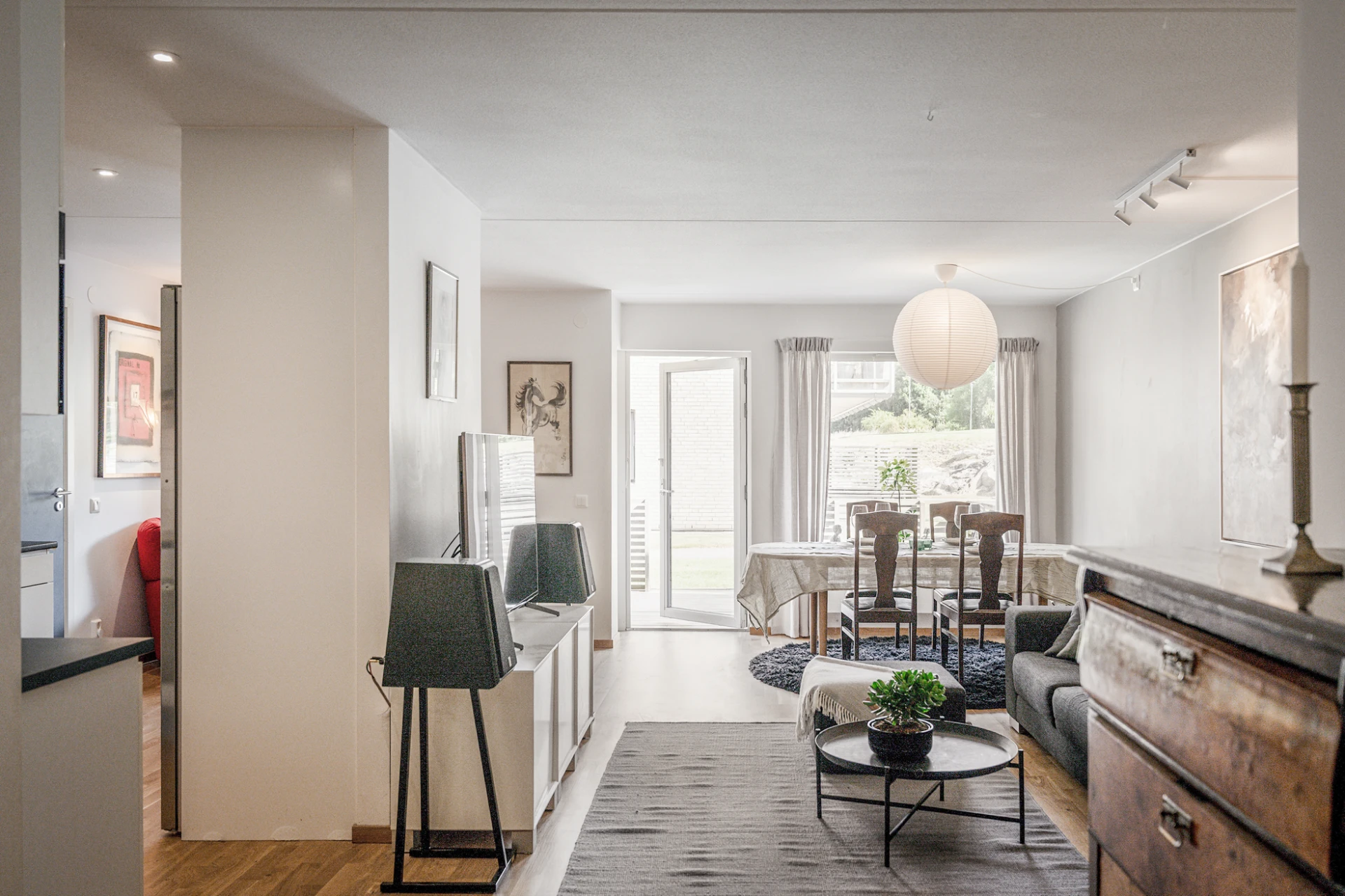 Ekparkett och vitmålade väggar. Här finns plats för soffgrupp med tillhörande möblemang samt matsalsbord. Utgång till bostadens uteplats med plats för utemöbler.