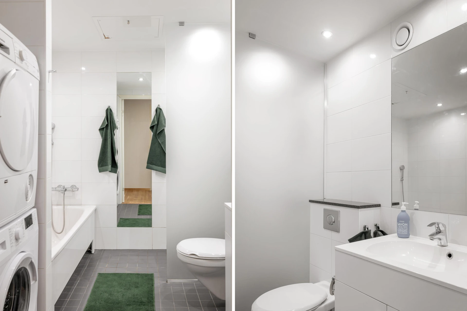 Grått klinkergolv med golvvärme och helkaklade väggar i vitt. Badrummet är utrustat med vägghängd WC, handfat med kommod, två speglar, badkar, tvättmaskin samt torktumlare.
