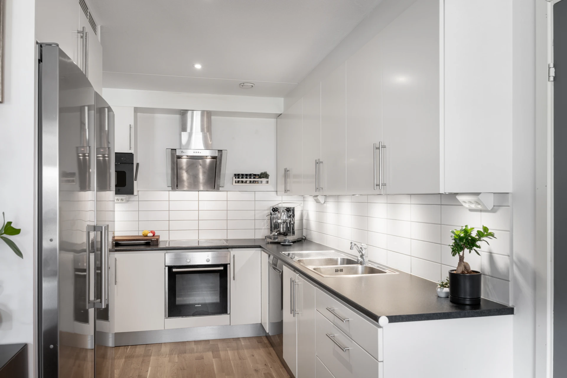 Ekparkett och vitmålade väggar. Köksinredning i vitt och ovanför bänkskivan i svart laminat sitter vitt kakel som belyses av spotlights. Köket är utrustat med kyl och frys, induktionshäll, inbyggd ugn, köksfläkt, inbyggd mikrovågsugn och diskmaskin.