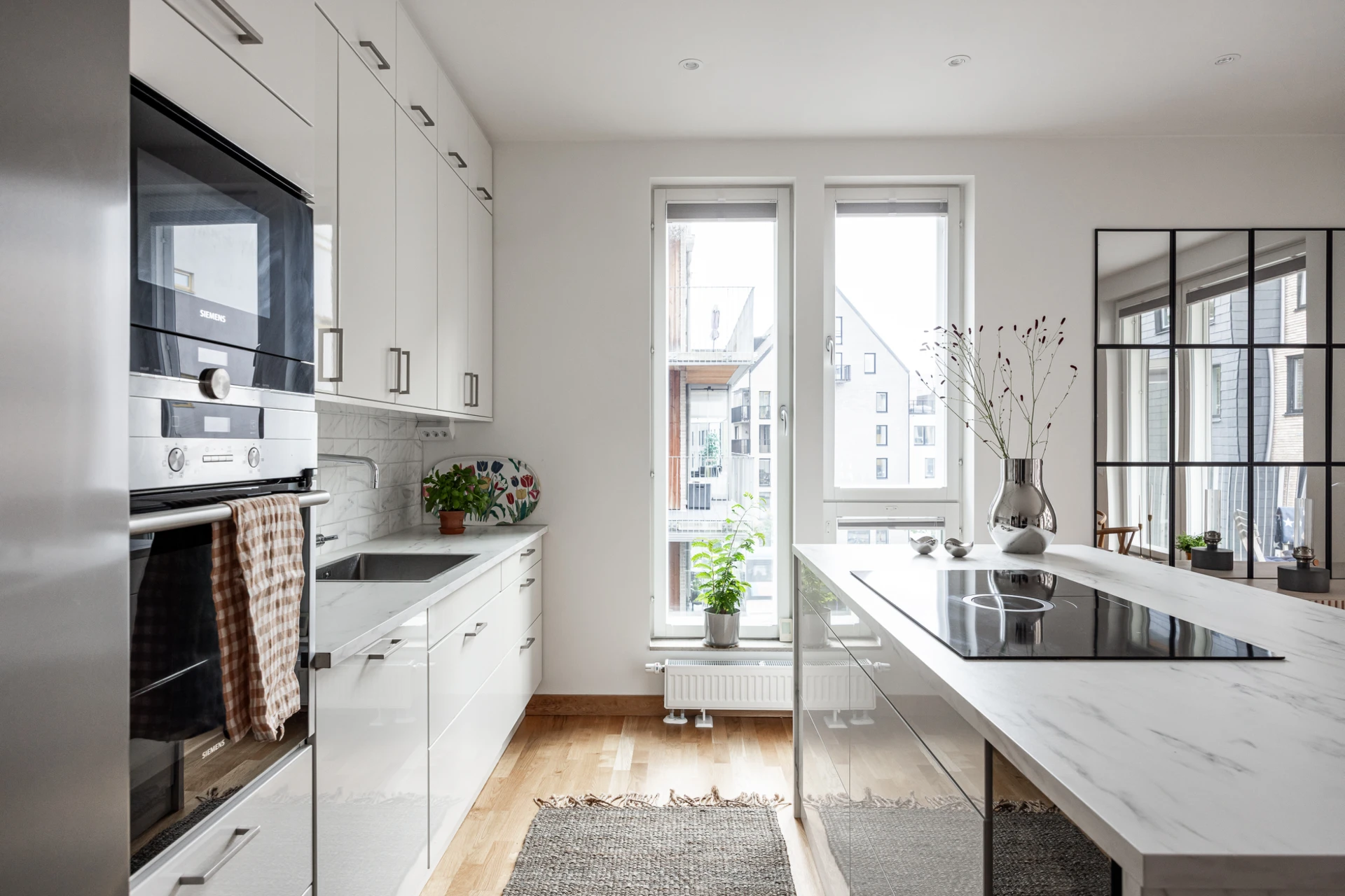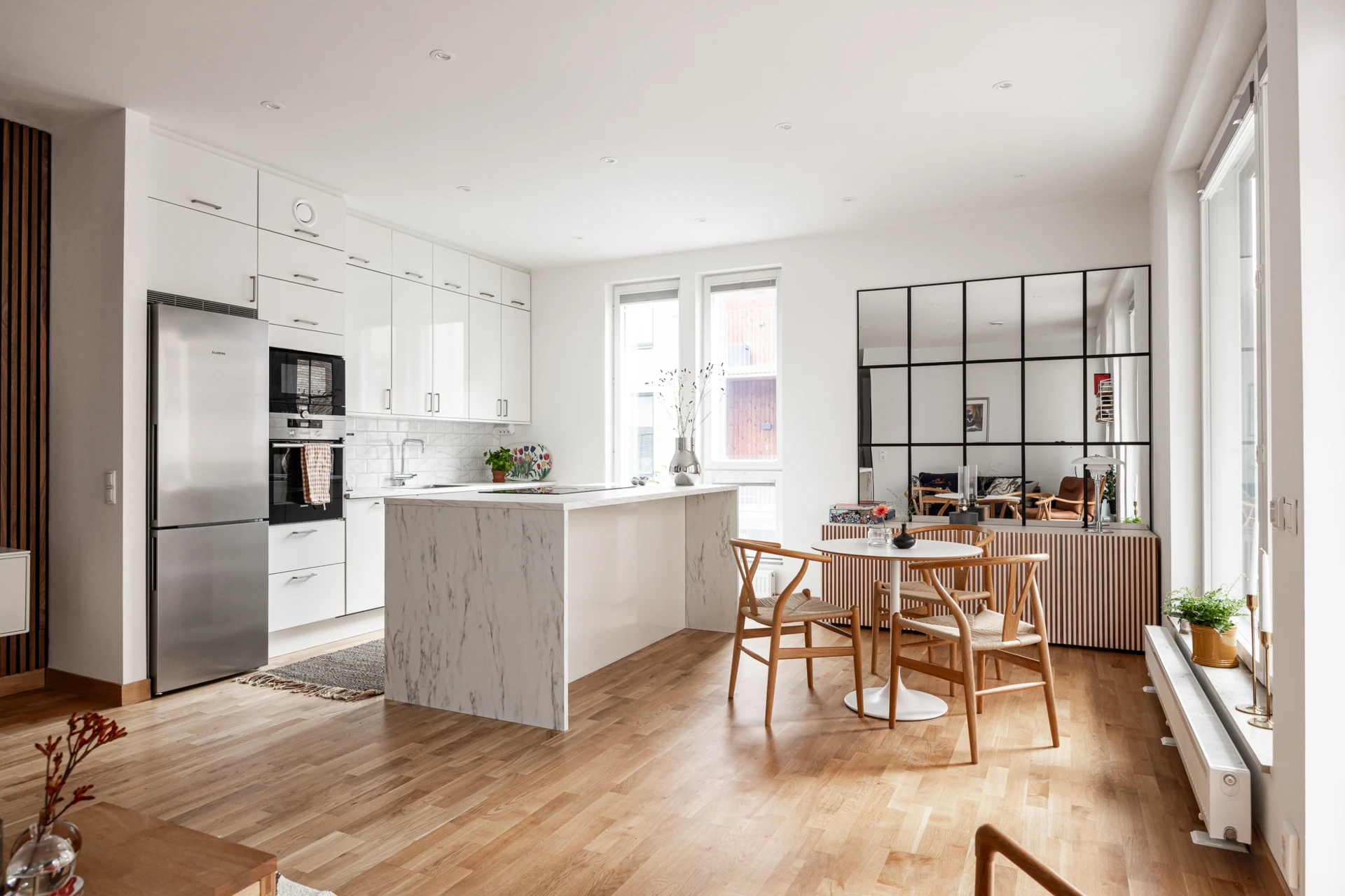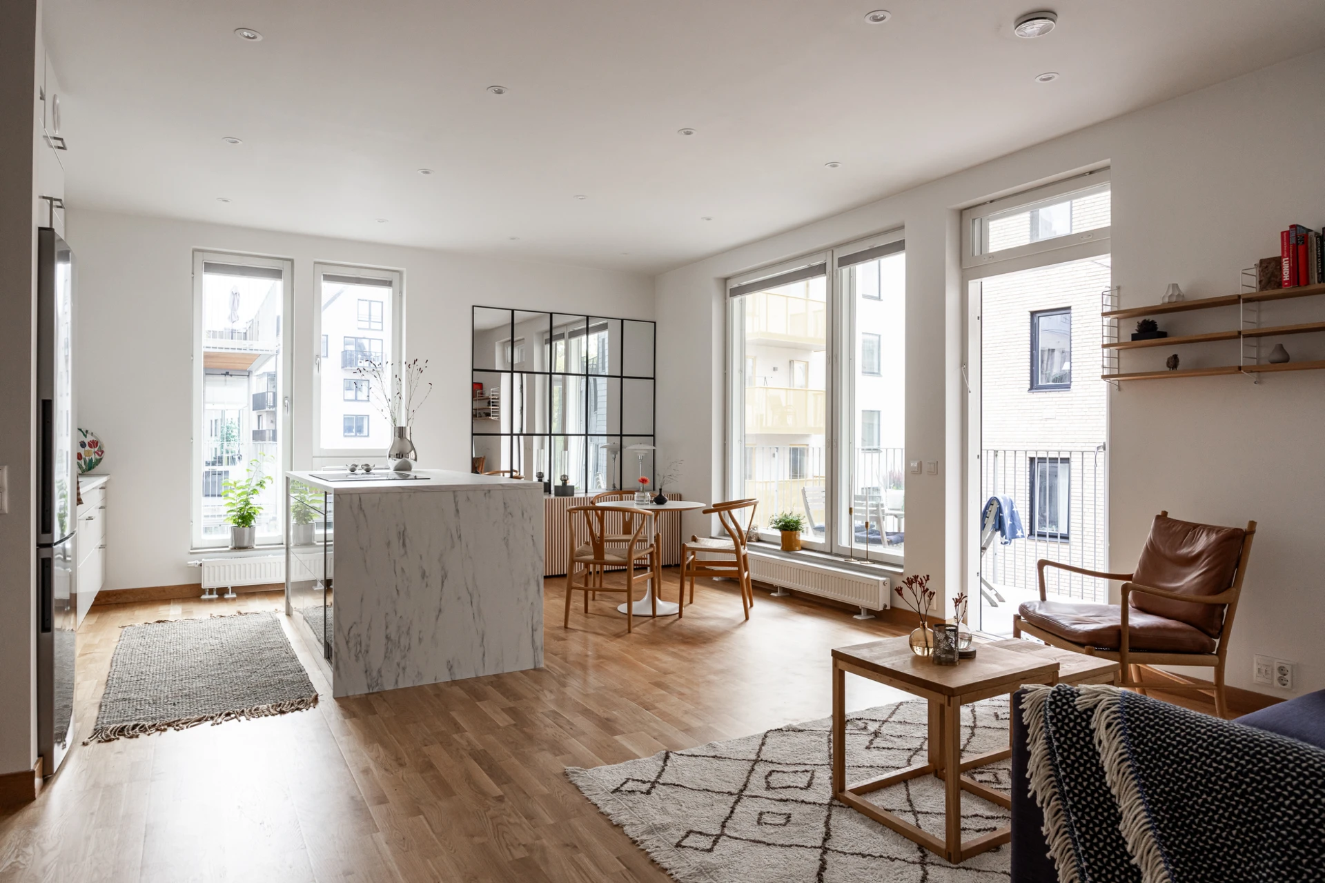 De stora fönsterpartierna i flera väderstreck fyller bostaden med ljus och förstärker känslan av rymd. Här finns en social planlösning där kök och vardagsrum flyter samman – perfekt för middagar, mingel och vardagsmys. Den stilrena köksön blir hemmets självklara samlingsplats, komplett med plats för fyra sittplatser och en elegant vinkyl.