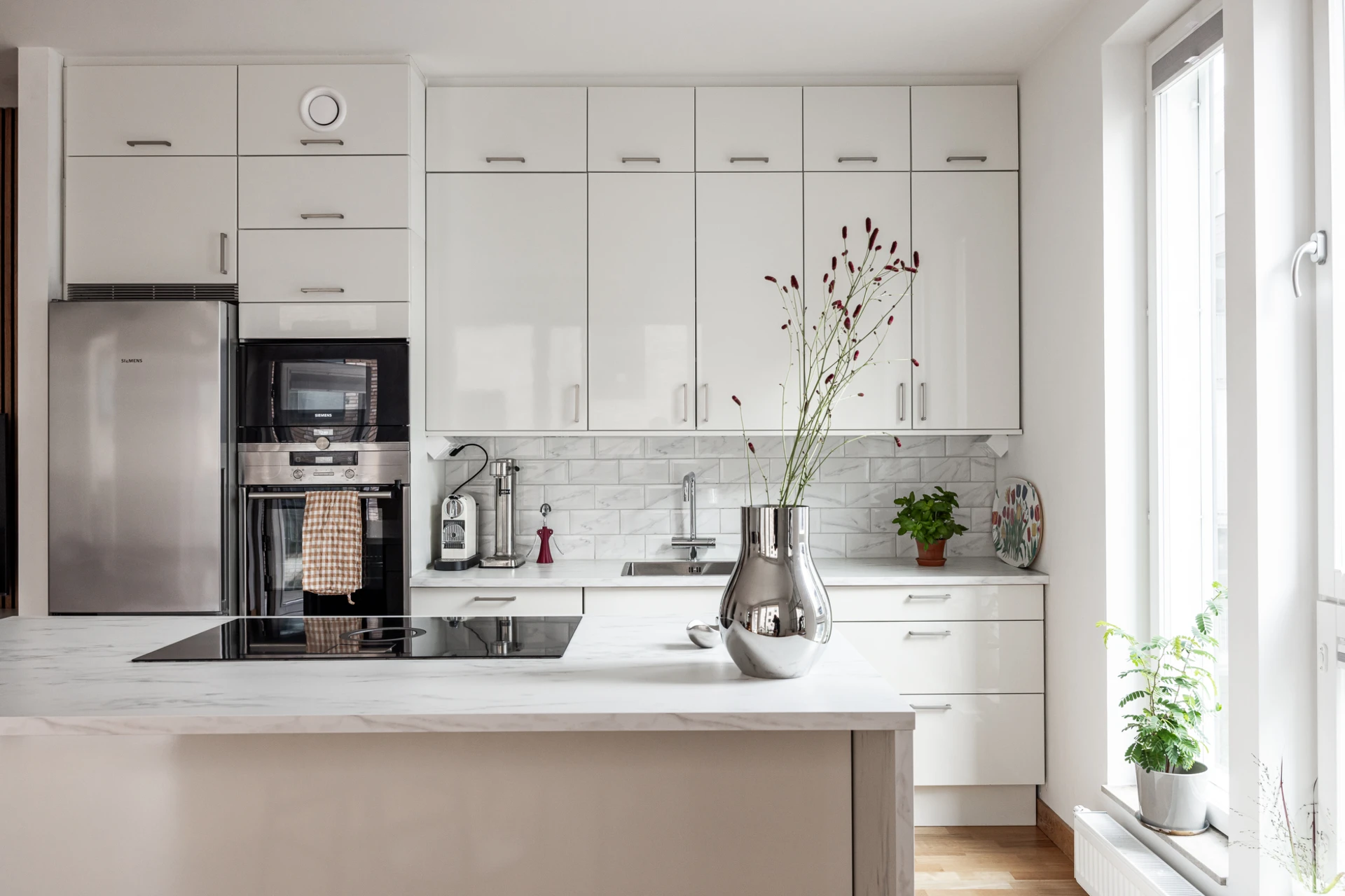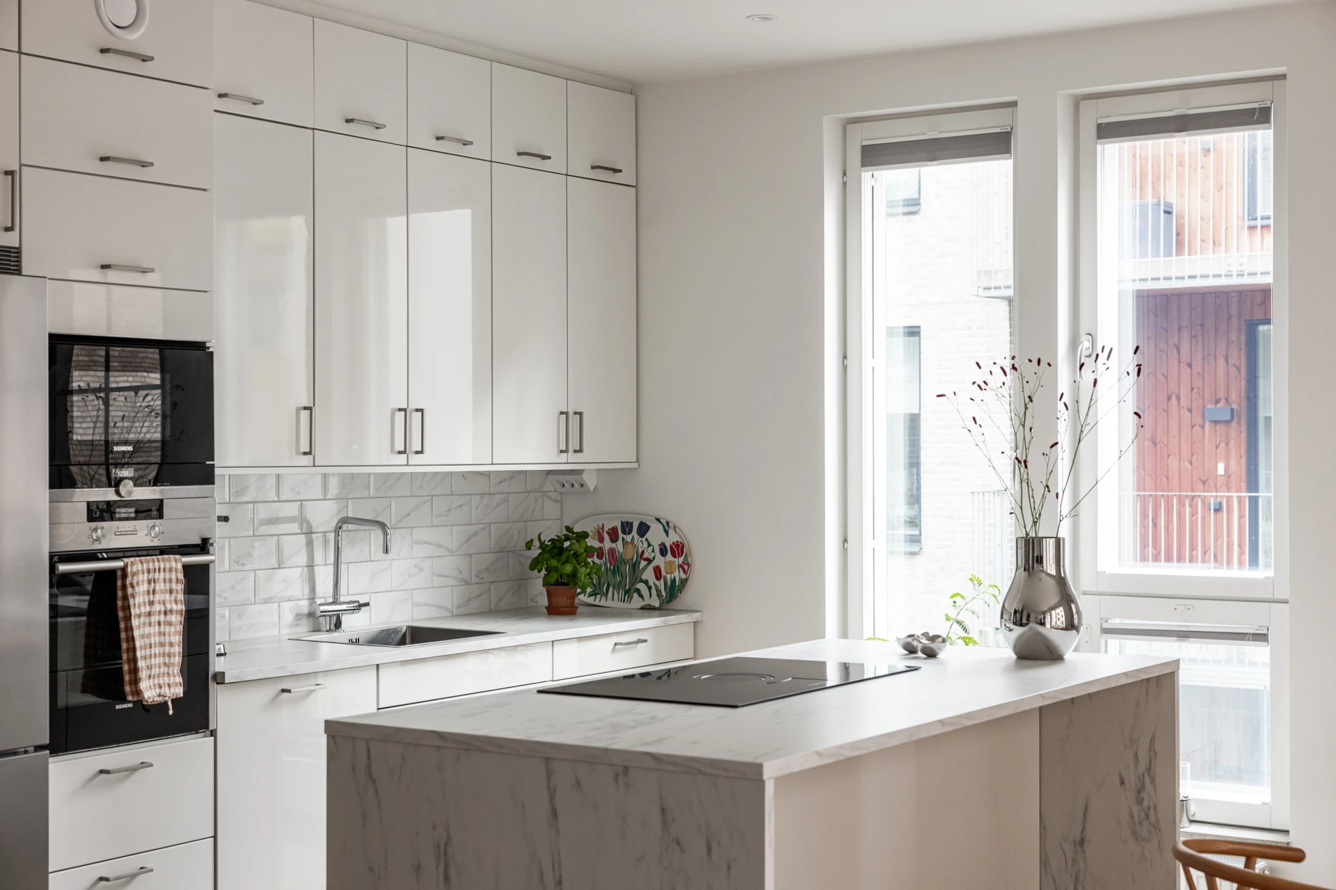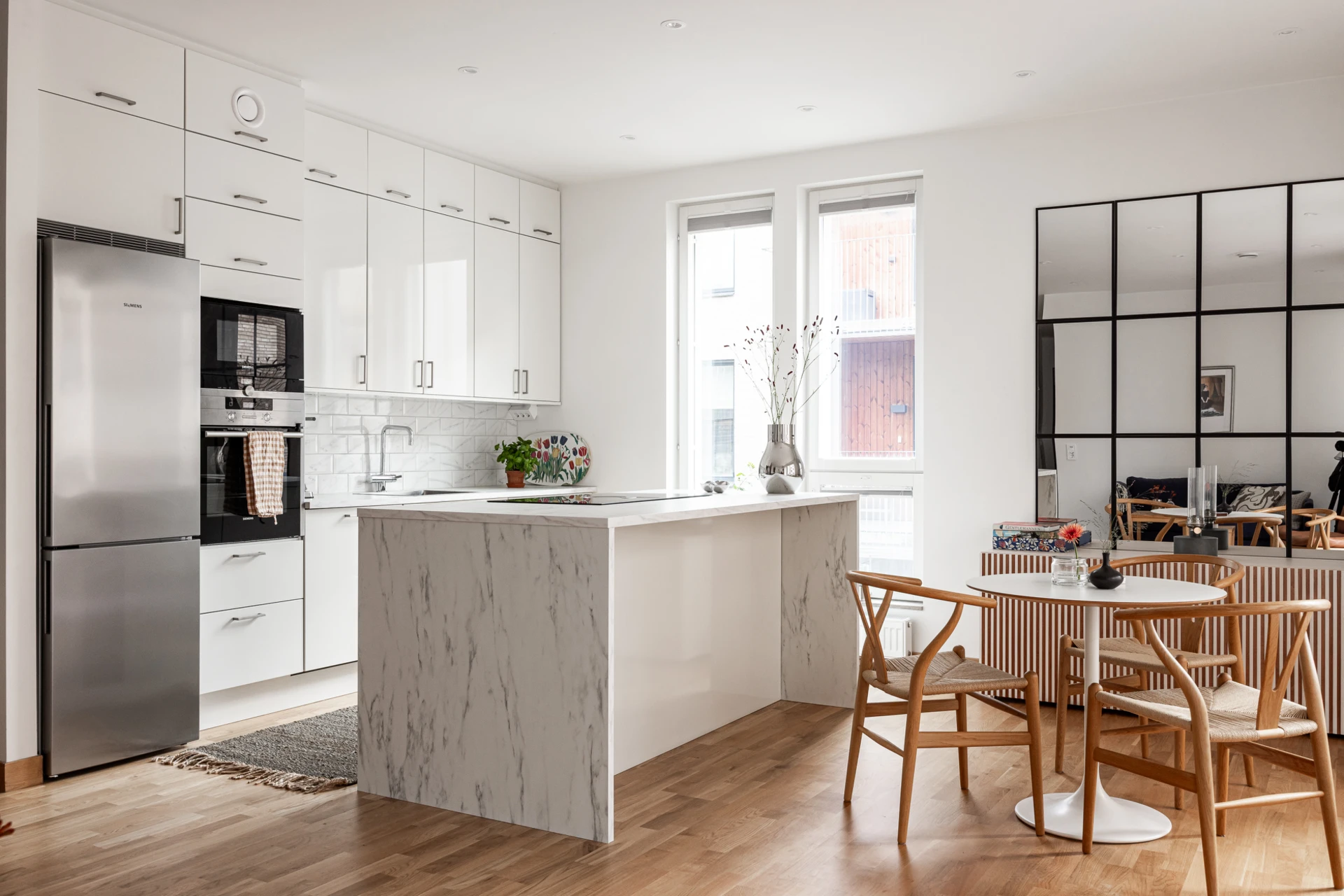 De stora fönsterpartierna i flera väderstreck fyller bostaden med ljus och förstärker känslan av rymd. Här finns en social planlösning där kök och vardagsrum flyter samman – perfekt för middagar, mingel och vardagsmys. Den stilrena köksön blir hemmets självklara samlingsplats, komplett med plats för fyra sittplatser och en elegant vinkyl.