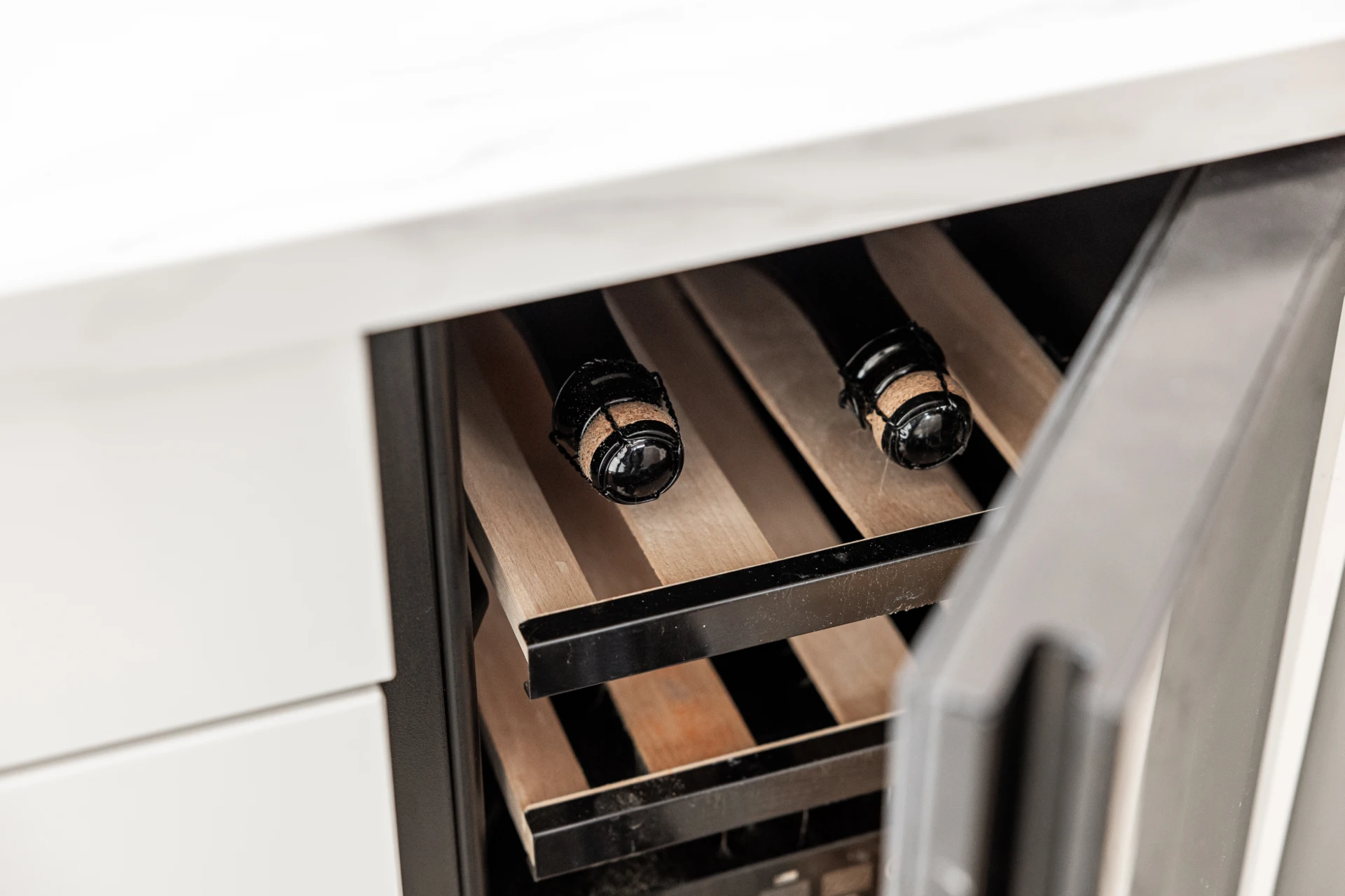 Parkettgolv och vita väggar. Köksinredning i vitt och ljus bänkskiva med ljust kakel ovan samt infällda spotlights. Köket är utrustat med kyl/frys, spis, ugn, mikrovågsugn samt en inbyggd vinkyl. Här finns även stora arbetsytor på den ljusa köksön där det även får rum fyra sittplatser. I taket sitter infällda spotlights.