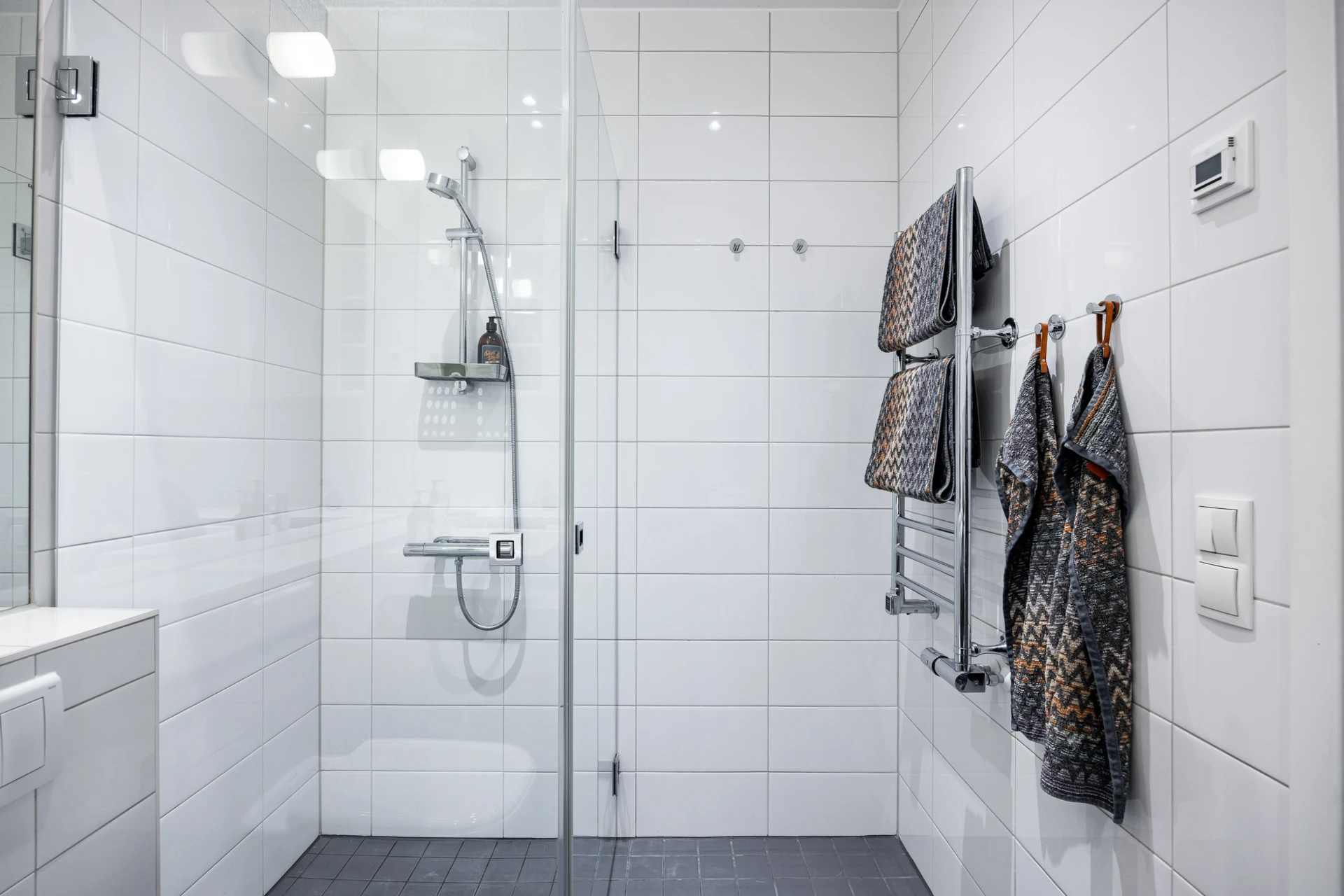 Grått klinkergolv och helkaklade väggar i vitt. Badrummet är utrustat med WC, handfat, spegel, dusch med invikbara glasdörrar, tvättmaskin och torktumlare från Siemens med arbetsbänk och skåp ovan. I taket sitter infällda spotlights.