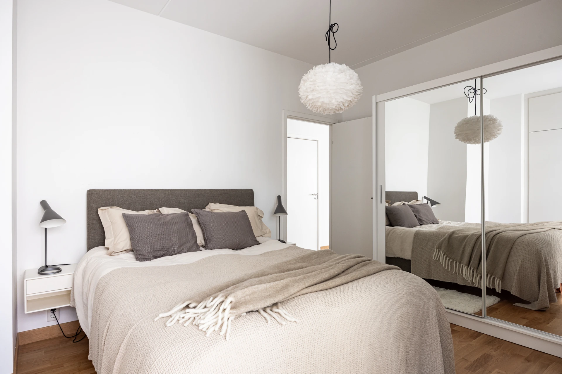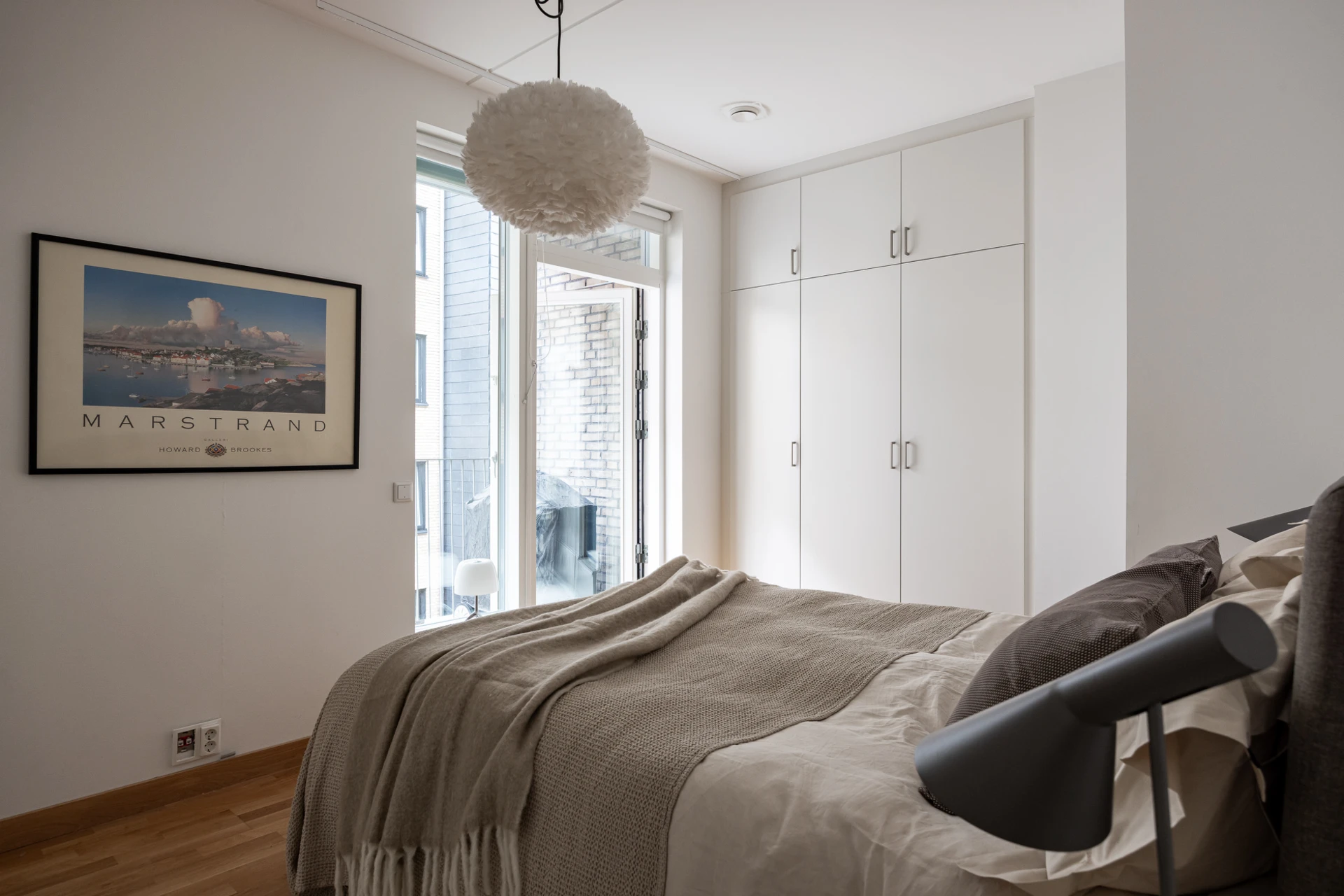 Parkettgolv och vita väggar. Plats för dubbelsäng och förvaringsmöjligheter i rummet tre inbyggda garderober med överskåp. Härifrån nås hemmets rymliga balkong.