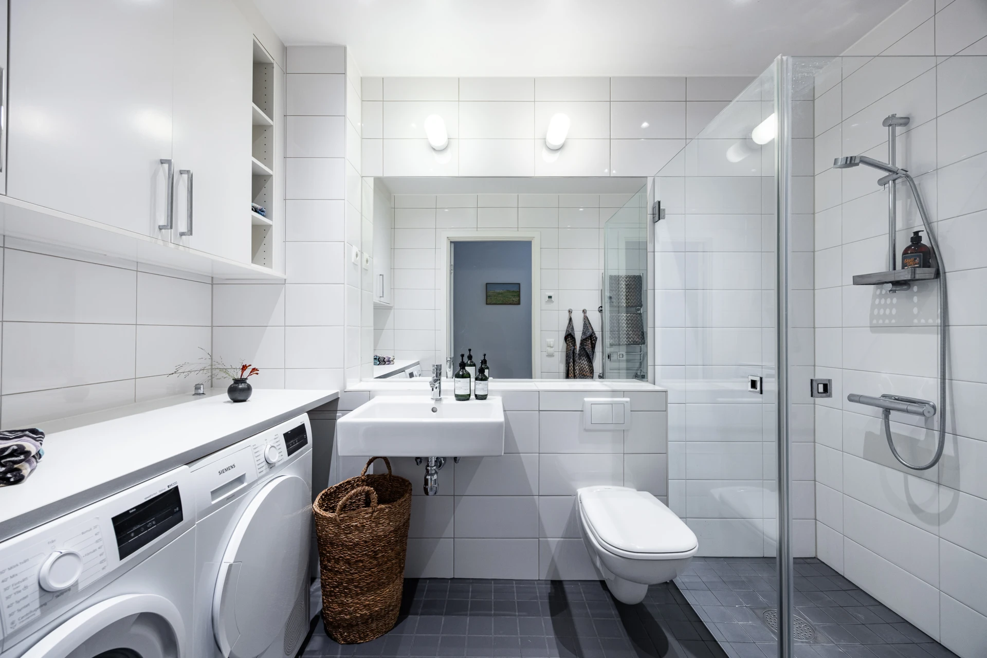 Det smakfullt renoverade badrummet bjuder på både tvättmaskin och torktumlare som förenklar vardagen.