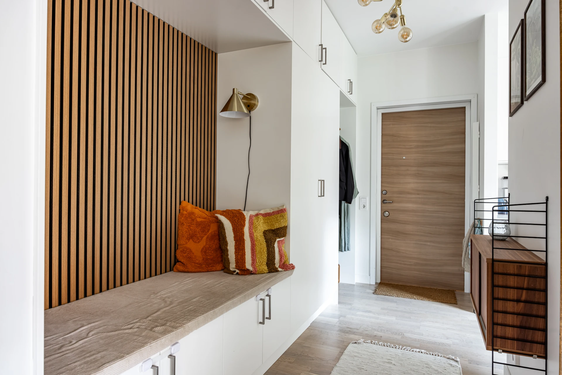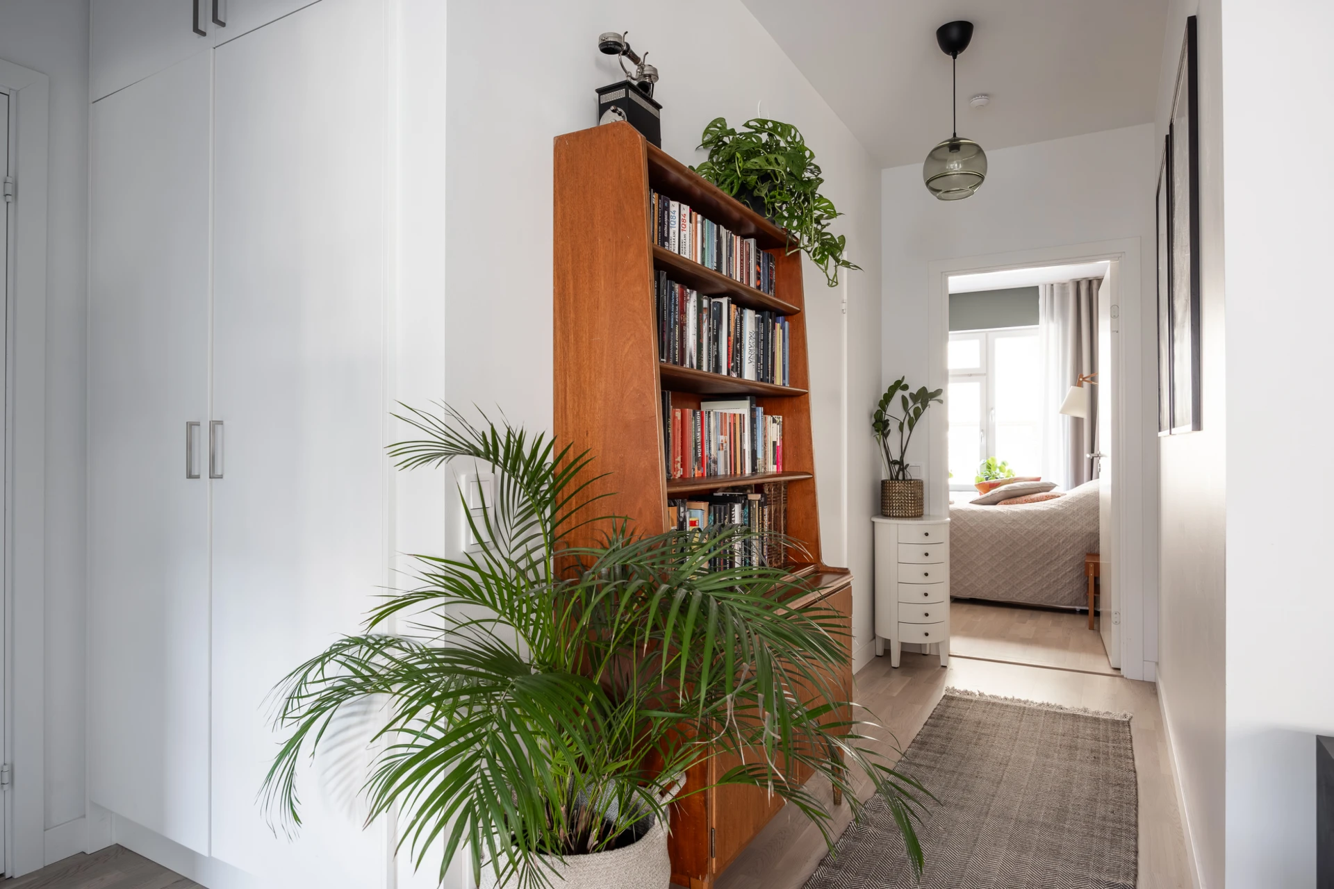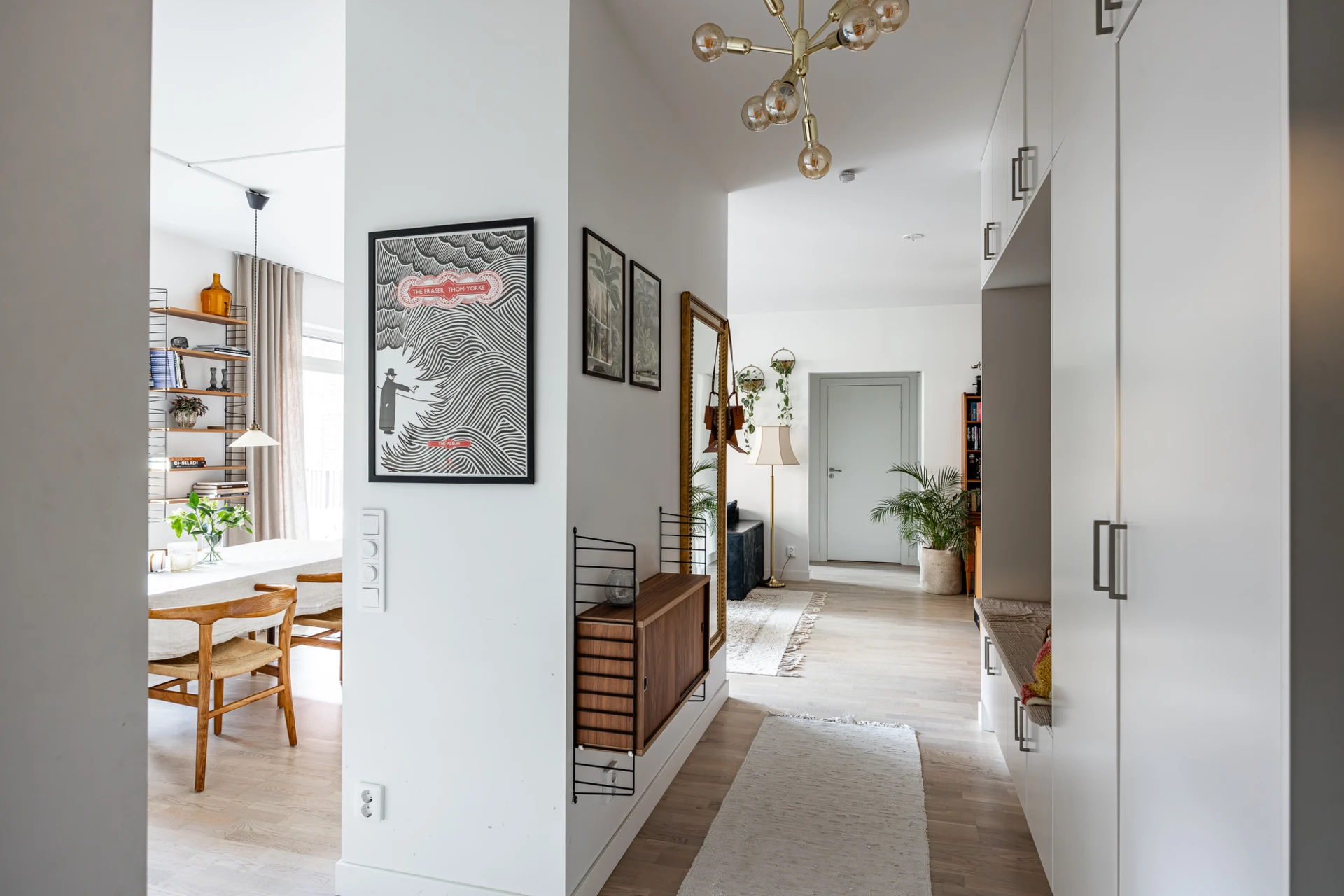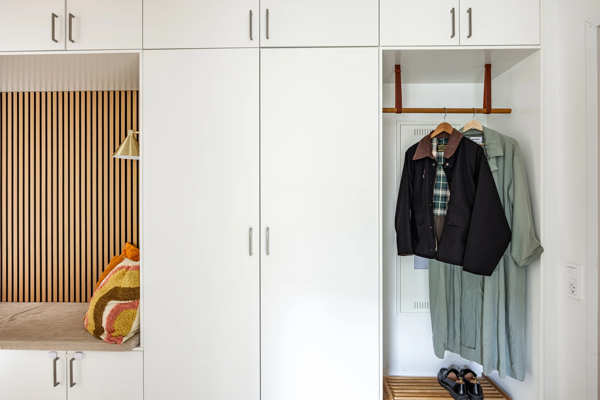 Parkettgolv och vitmålade väggar. Här finns plats för avhängning och förvaring i platsbyggda garderober.