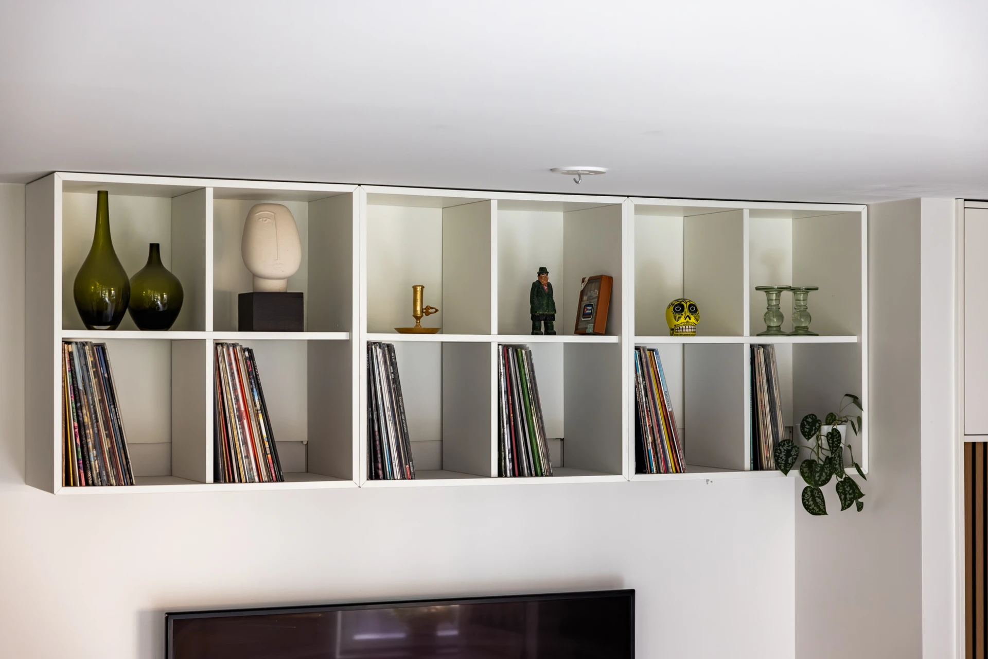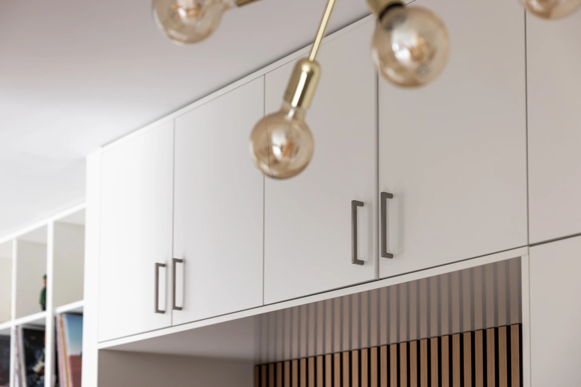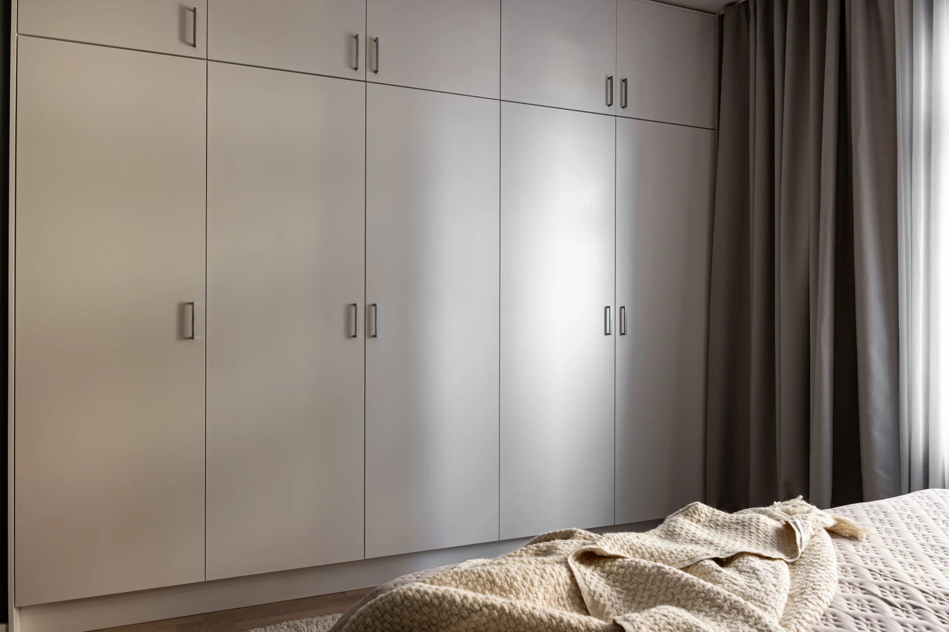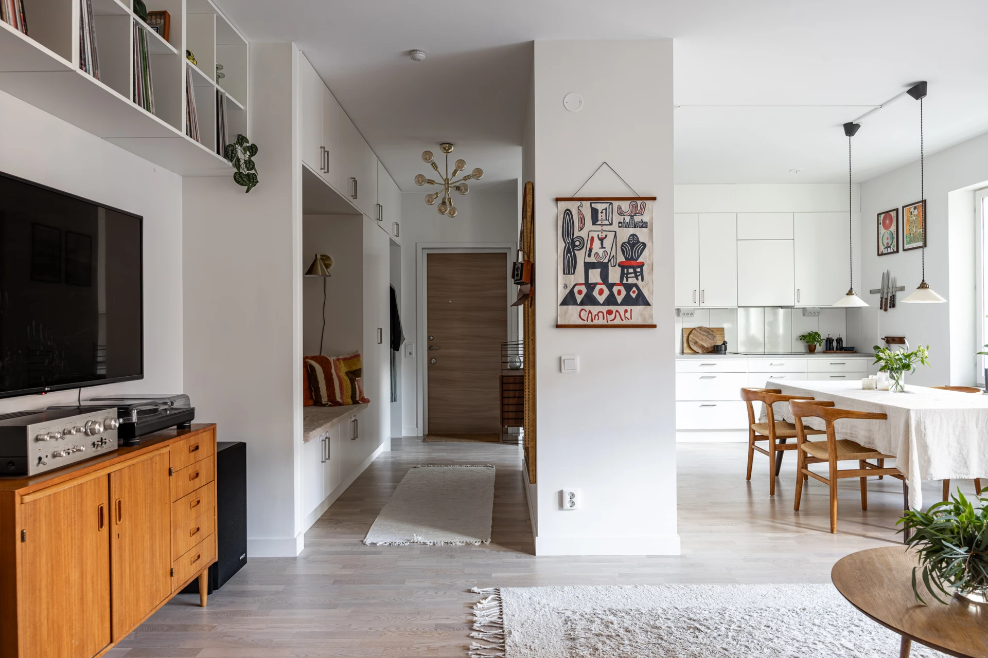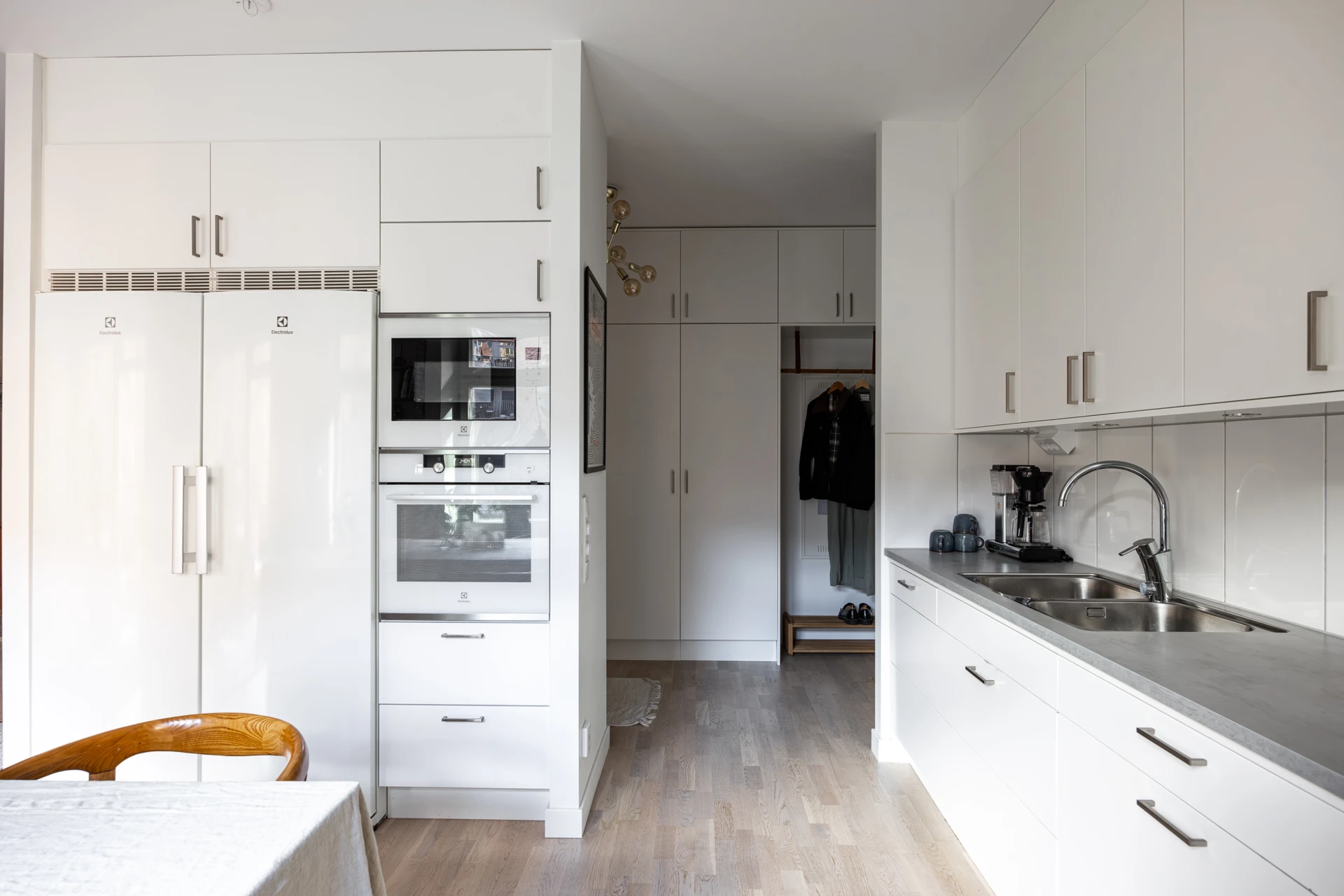 Parkettgolv och vitmålade väggar. Här finns plats för avhängning och förvaring i platsbyggda garderober.