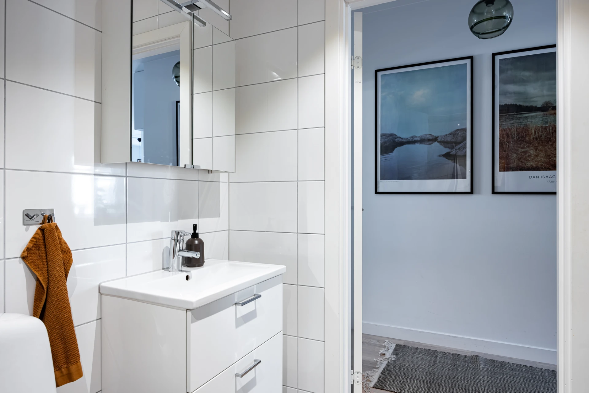 Klinkergolv i en grå nyans och vita helkaklade väggar. Utrustat med vägghängd WC, handfat med kommod samt spegelskåp. I taket sitter dimbara spotlights.