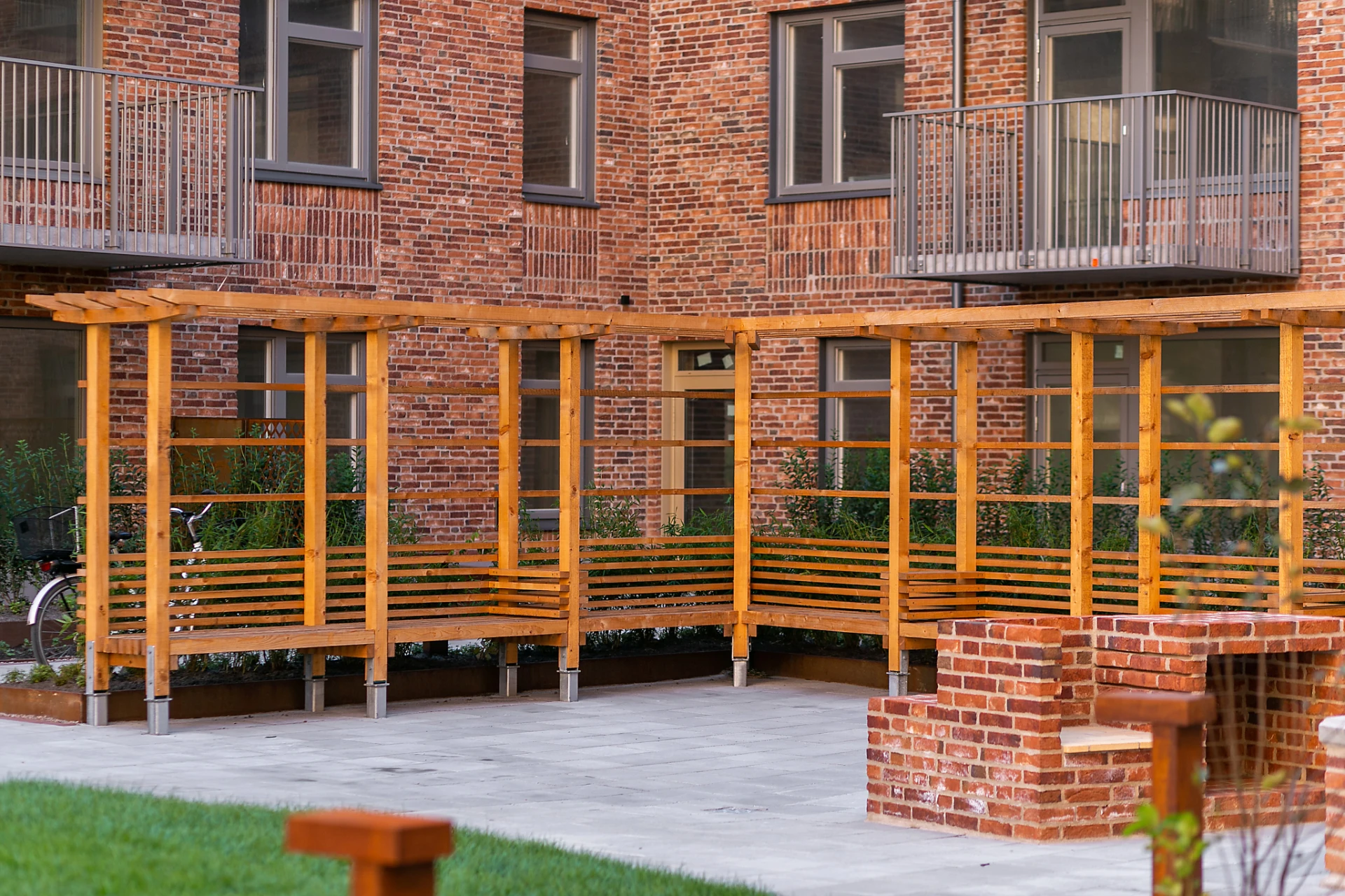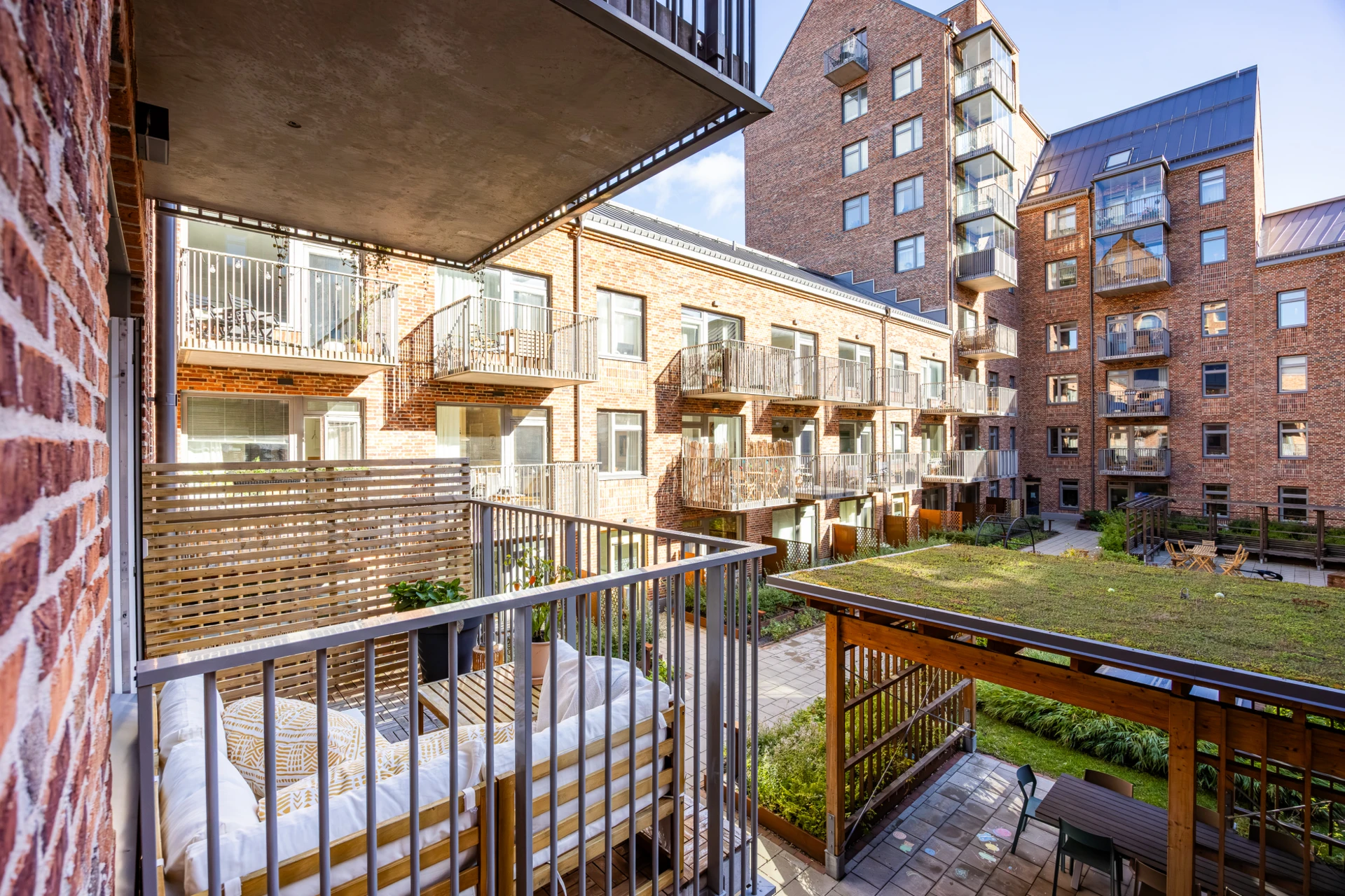 På innergården finns pergolas, utegrill, gräsmattor och vackra rabatter. Under fastigheten ligger föreningens garage med laddstolpar som nås via hiss från varje uppgång. Varje bostad har tvättmaskin och torktumlare, men det finns även en stor gemensam tvättstuga.