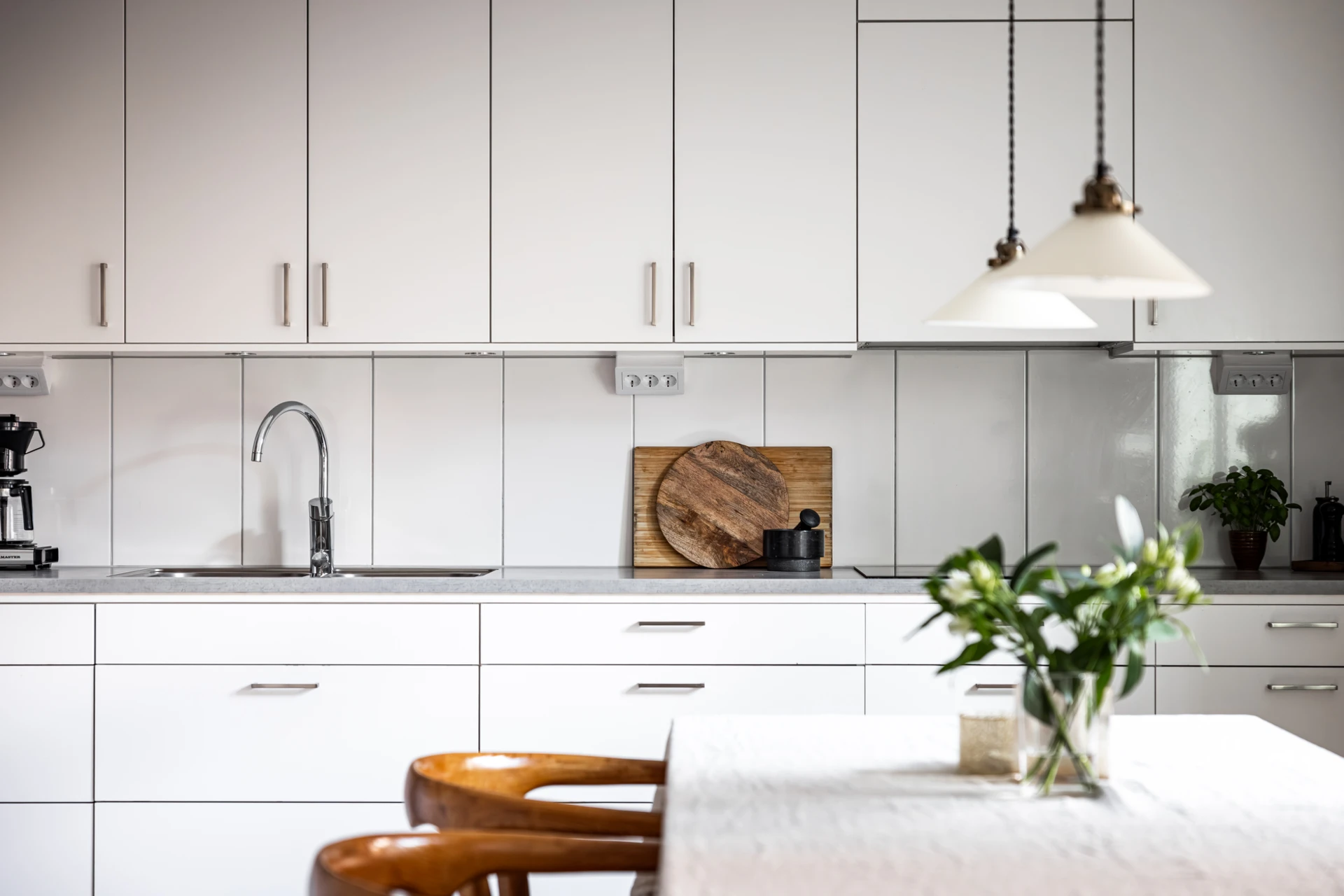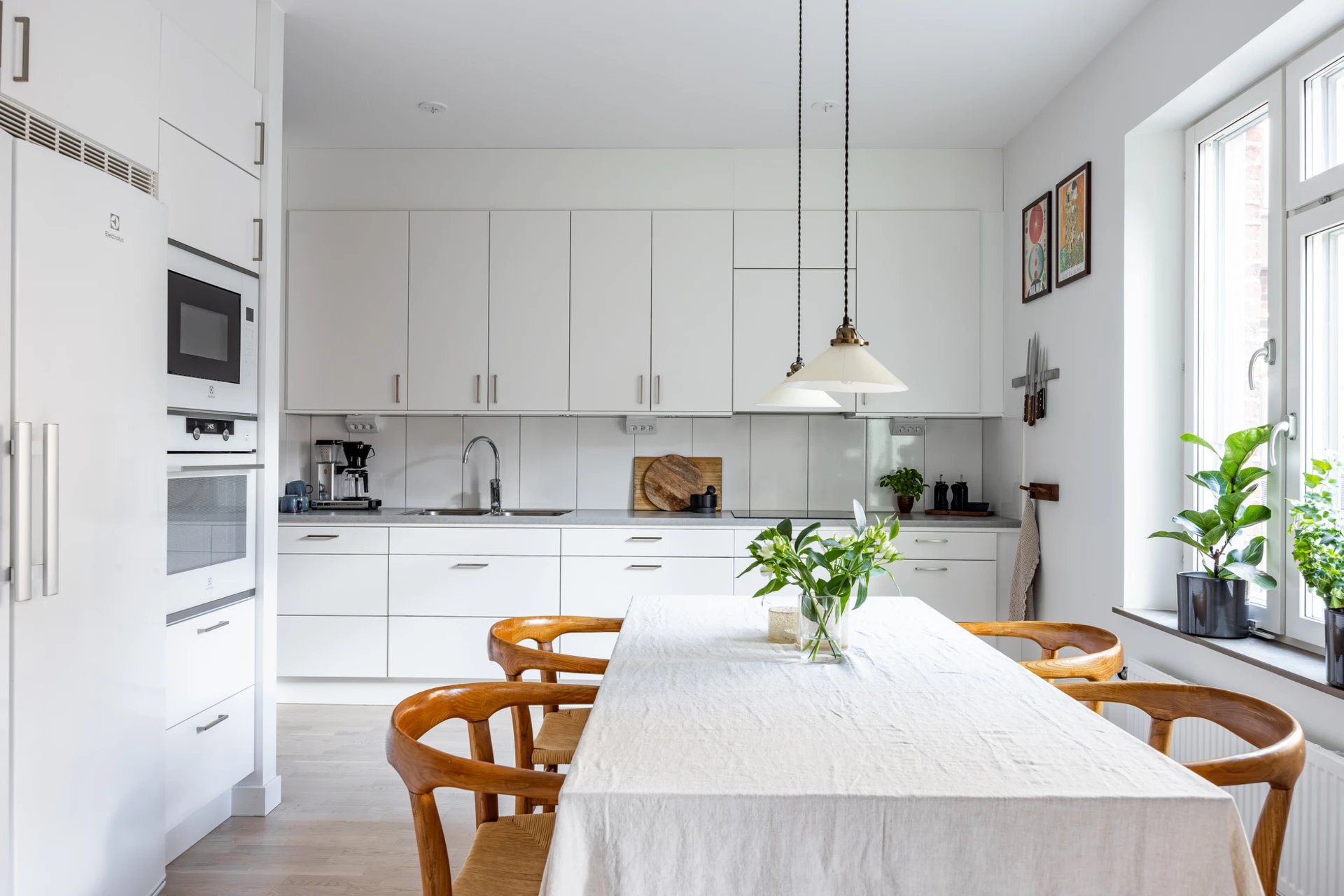 Parkettgolv och vitmålade väggar. Köksinredning i vitt från Vedum och ovan den grå arbetsbänken i laminat sitter vitt kakel. Vitvarorna består av kyl och frys, integrerad diskmaskin, induktionshäll, köksfläkt samt inbyggnadsugn och mikro. Goda förvaringsmöjligheter. Här finns matplats för ca 4-6 personer. Öppen planlösning mot vardagsrum.