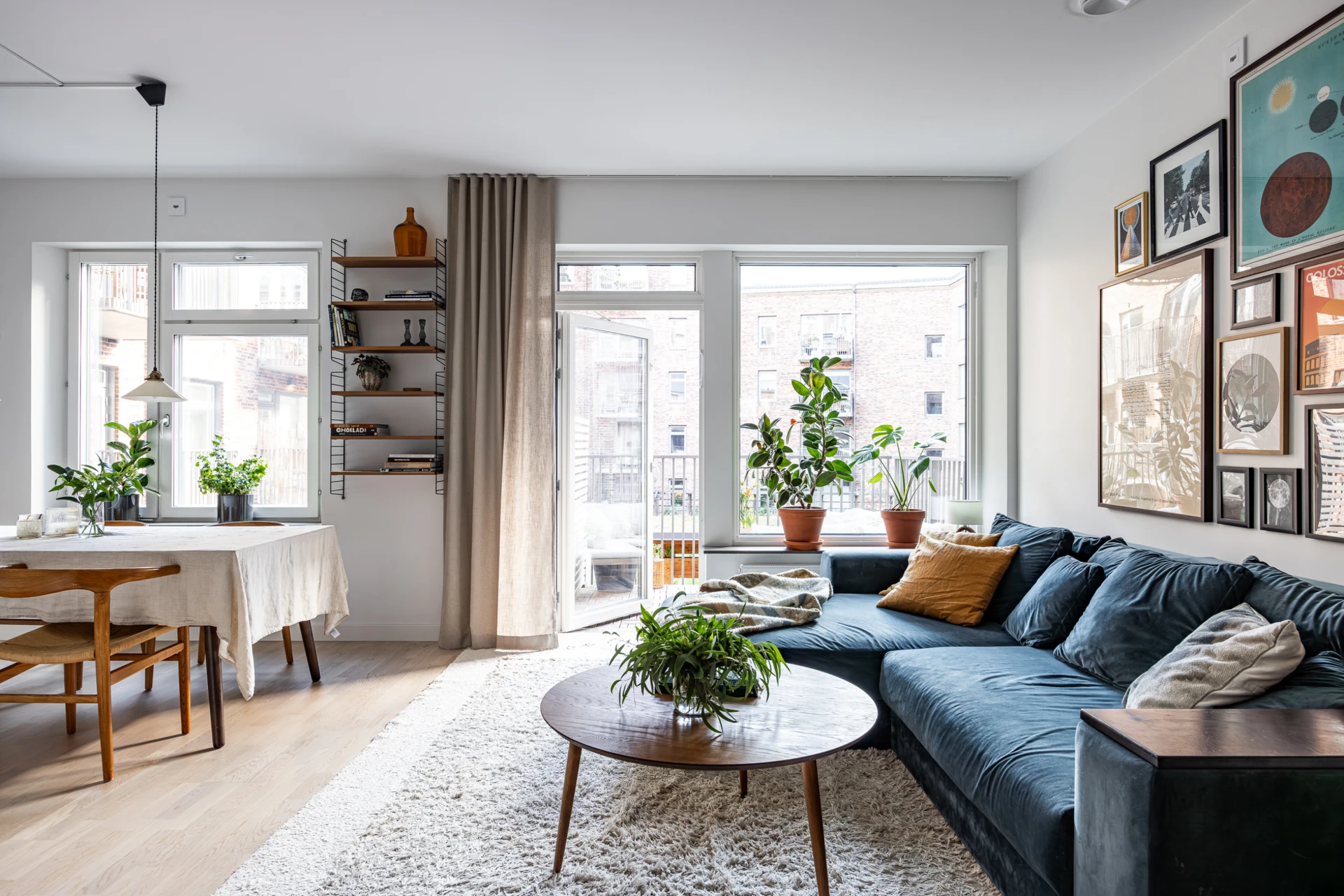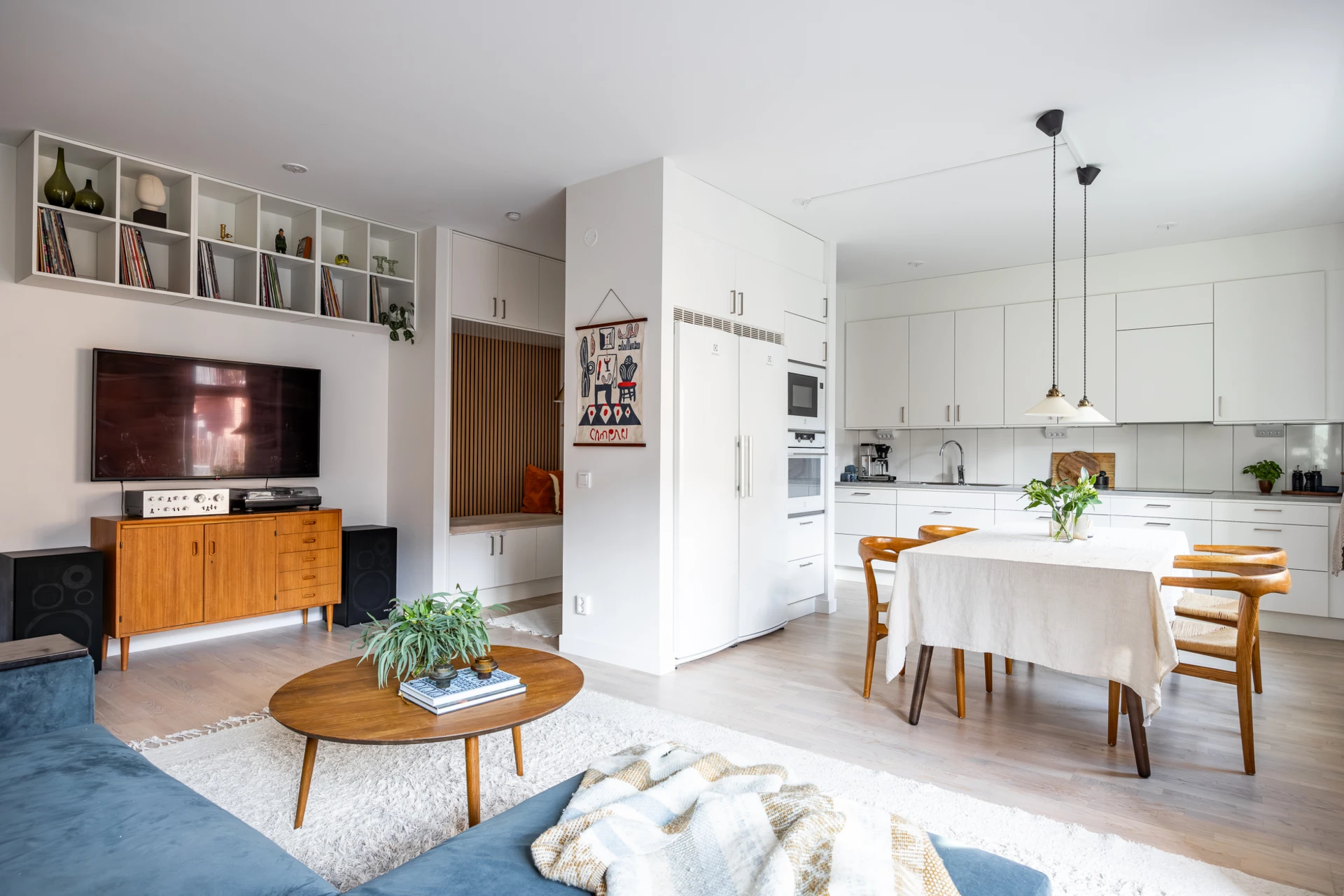 Parkettgolv och vitmålade väggar. Här finns plats för soffgrupp med tillhörande möblemang. Öppen planlösning mot kök och utgång till bostadens balkong.