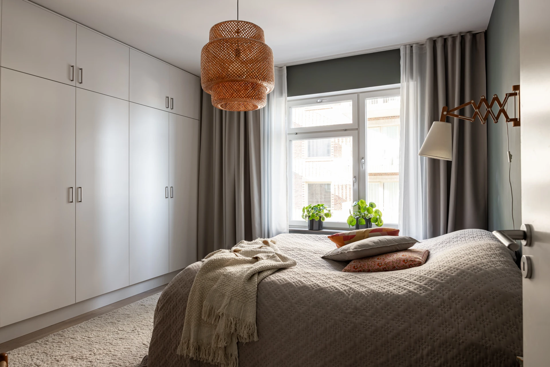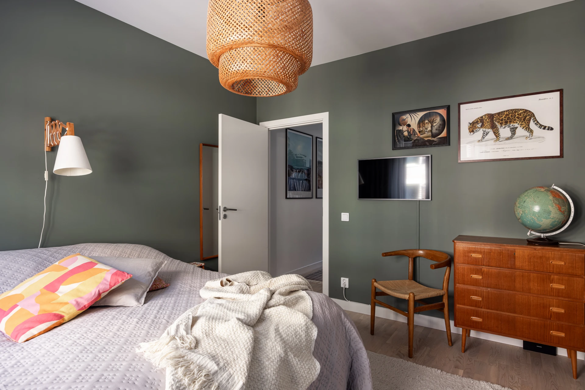 Parkettgolv och målade väggar i grön kulör. Här finns plats för dubbelsäng med tillhörande möblemang. Förvaring sker i garderober.